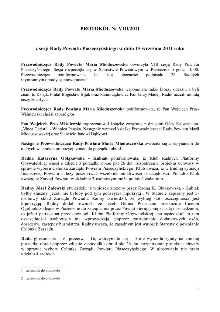 PROTOKÓŁ Nr VIII/2011 z sesji Rady Powiatu Piaseczyńskiego w dniu 15 września 2011 roku Przewodnicząca Rady Powiatu Maria Mioduszewska otworzyła VIII sesję Rady Powiatu Piaseczyńskiego. Sesja rozpoczęła się w Starostwie Powiatowym w Piasecznie o godz. 10:00. Przewodnicząca poinformowała, że listę obecności podpisało 26 Radnych i tym samym obrady są prawomocne1. Przewodnicząca Rady Powiatu Maria Mioduszewska wspomniała ludzi, którzy odeszli, a byli znani to Ksiądz Prałat Bogusław Bijak oraz Samorządowiec Pan Jerzy Madej. Radni uczcili minutą ciszy zmarłych. Przewodnicząca Rady Powiatu Maria Mioduszewska poinformowała, że Pan Wojciech PrusWiśniewski chciał zabrać głos. Pan Wojciech Prus-Wiśniewski zaprezentował książkę związaną z dziejami Góry Kalwarii pn. „Vinea Christi” - Winnica Pańska. Następnie wręczył książkę Przewodniczącej Rady Powiatu Marii Mioduszewskiej oraz Staroście Janowi Dąbkowi. Następnie Przewodnicząca Rady Powiatu Maria Mioduszewska zwróciła się z zapytaniem do radnych w sprawie propozycji zmian do porządku obrad2. Radna Katarzyna Obłąkowska - Kubiak poinformowała, iż Klub Radnych Platformy Obywatelskiej wnosi o zdjęcie z porządku obrad pkt 26 dot. rozpatrzenia projektu uchwały w sprawie wyboru Członka Zarządu Powiatu Piaseczyńskiego. Klub uważa, iż w trudnej sytuacji finansowej Powiatu należy poszukiwać wszelkich możliwości oszczędności. Ponadto Klub uważa, iż Zarząd Powiatu w składzie 3-osobowym może podołać zadaniom. Radny Józef Zalewski stwierdził, iż wniosek złożony przez Radną K. Obłąkowską - Kubiak byłby słuszny, jeżeli nie byłoby pod tym podszycia hipokryzji. W Statucie zapisany jest 5osobowy skład Zarządu Powiatu. Radny stwierdził, że wybieg dot. oszczędności jest hipokryzją. Radny dodał również, że jeżeli Gmina Piaseczno przekazuje Liceum Ogólnokształcące w Piasecznie do zarządzania przez Powiat kierując się zasadą oszczędzania, to jeżeli patrząc na przedstawicieli Klubu Platformy Obywatelskiej „po sąsiedzku” to tam oszczędności osobowych nie wprowadzają, poprzez zatrudnianie dodatkowych osób, doradców, zastępcy burmistrza. Radny uważa, że zasadnym jest wniosek Starosty o powołanie Członka Zarządu. Rada głosami: za – 6, przeciw – 16, wstrzymało się – 0 nie wyraziła zgody na zmianę porządku obrad poprzez zdjęcie z porządku obrad pkt 26 dot. rozpatrzenia projektu uchwały w sprawie wyboru Członka Zarządu Powiatu Piaseczyńskiego. W głosowaniu nie brało udziału 4 radnych. 1 załącznik do protokołu 2 załącznik do protokołu 1 Rada głosami: za – 18, przeciw – 0, wstrzymało się – 4 przyjęła porządek obrad. W głosowaniu nie brało udziału 4 radnych. Ad. 3 Przyjęcie protokołu z VII sesji Rady Powiatu Piaseczyńskiego Rada głosami: za – 20, przeciw – 0, wstrzymało się – 3 przyjęła Protokół z VII sesji Rady Powiatu Piaseczyńskiego w dniu 30 czerwca 2011 roku. W głosowaniu nie brało udziału 3 radnych. Ad 4 Przedstawienie informacji o przebiegu wykonania budżetu Powiatu za I półrocze 2011 r. Skarbnik Powiatu Tadeusz Waśkiewicz przedstawił informację o przebiegu wykonania budżetu Powiatu za I półrocze 2011 r3. Radna Katarzyna Obłąkowska -Kubiak zwróciła uwagę, że w I półroczu nie zostały przekazane żadne środki finansowe bądź minimalne dla organizacji pozarządowych na zadania, które są im zlecane przez Powiat Piaseczyński. Członek Zarządu Stefan Dunin w odpowiedzi stwierdził, że konkursy odbywały się w miesiącu czerwcu i dlatego te wydatki nie są uwzględnione. Radny Piotr Kandyba zwrócił uwagę, że w trzech miejscach wykonanie jest na poziomie 0. Jest to dział rolnictwo i łowiectwo kwota 35 tys zł, w dziale usług dotacje celowe z budżetu państwa na zadanie bieżące z zakresu administracji rządowej kwota 60 tys zł oraz dotacje celowe państwa na zadanie bieżące z zakresu administracji rządowej kwota 70 tys zł. Zadał pytanie czy jest szansa na realizację tych zadań. Starosta Jan Dąbek w odpowiedzi stwierdził, że I półrocze jest słabsze, tutaj są sprawy organizacyjne, a prace wykonywane są w III kwartale. Radna Marianna Kurek zwróciła uwagę, że Komisja Budżetu i Finansów jednogłośnie, pozytywnie zaopiniowała informację o przebiegu wykonania budżetu Powiatu za I półrocze 2011 roku. Ad 5 Przedstawienie informacji o kształtowaniu się Wieloletniej Prognozy Finansowej za I półrocze 2011 roku Skarbnik Powiatu Tadeusz Waśkiewicz przedstawił informację o kształtowaniu się Wieloletniej Prognozy Finansowej za I półrocze 2011 roku4. 3 załącznik do protokołu 4 załącznik do protokołu 2 Radna Marianna Kurek poinformowała, że Komisja Budżetu i Finansów jednogłośnie, pozytywnie zaopiniowała informację o kształtowaniu się Wieloletniej Prognozy Finansowej za I półrocze 2011 roku. Ad 6 Przedstawienie informacji o przebiegu wykonania planu finansowego Powiatowej Biblioteki w Piasecznie za I półrocze 2011 roku Dyrektor Powiatowej Biblioteki w Piasecznie Pani Danuta Kaluga przedstawiła informację o przebiegu wykonania planu finansowego Powiatowej Biblioteki w Piasecznie za I półrocze 2011 roku5. Radna Joanna Pająkiewicz poinformowała, iż Komisja Edukacji i Rynku Pracy jednogłośnie, pozytywnie zaopiniowała informację o przebiegu wykonania planu finansowego Powiatowej Biblioteki w Piasecznie za I półrocze 2011 r. Zwróciła uwagę, że Pani Dyrektor Danuta Kaluga wykonała dużo prac np. podjęła czynności związane z odzyskaniem od czytelników pozycji książkowych, wprowadziła regulaminy, instrukcje, nawiązała współpracę z bibliotekami gminnymi, przeprowadziła selekcję księgozbioru, przeksięgowała zbiory, zaprowadziła układ działowy, organizuje akcje promocyjne /strona internetowa pbp-piaseczno.eu , foldery/, udział w imprezach plenerowych, umożliwiła korzystanie z interne