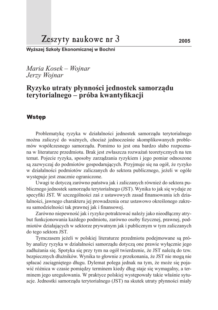 Zeszyty naukowe nr 3 2005 Wyższej Szkoły Ekonomicznej w Bochni Maria Kosek – Wojnar Jerzy Wojnar Ryzyko utraty płynności jednostek samorządu terytorialnego – próba kwantyfikacji Wstęp Problematykę ryzyka w działalności jednostek samorządu terytorialnego można zaliczyć do ważnych, chociaż jednocześnie skomplikowanych problemów współczesnego samorządu. Pomimo to jest ona bardzo słabo rozpoznana w literaturze przedmiotu. Brak jest zwłaszcza rozważań teoretycznych na ten temat. Pojecie ryzyka, sposoby zarządzania ryzykiem i jego pomiar odnoszone są zazwyczaj do podmiotów gospodarujących. Przyjmuje się na ogół, że ryzyko w działalności podmiotów zaliczanych do sektora publicznego, jeżeli w ogóle występuje jest znacznie ograniczone. Uwagi te dotyczą zarówno państwa jak i zaliczanych również do sektora publicznego jednostek samorządu terytorialnego (JST). Wynika to jak się wydaje ze specyfiki JST. W szczególności zaś z ustawowych zasad finansowania ich działalności, jawnego charakteru jej prowadzenia oraz ustawowo określonego zakresu samodzielności tak prawnej jak i finansowej. Zarówno niepewność jak i ryzyko potraktować należy jako nieodłączny atrybut funkcjonowania każdego podmiotu, zarówno osoby fizycznej, prawnej, podmiotów działających w sektorze prywatnym jak i publicznym w tym zaliczanych do tego sektora JST. Tymczasem jeżeli w polskiej literaturze przedmiotu podejmowane są próby analizy ryzyka w działalności samorządu dotyczą one prawie wyłącznie jego zadłużania się. Spotyka się przy tym na ogół twierdzenie, że JST należą do tzw. bezpiecznych dłużników. Wynika to głownie z przekonania, że JST nie mogą nie spłacać zaciągniętego długu. Dylemat polega jednak na tym, że może się pojawić różnica w czasie pomiędzy terminem kiedy dług staje się wymagalny, a terminem jego uregulowania. W praktyce polskiej występowały takie właśnie sytuacje. Jednostki samorządu terytorialnego (JST) na skutek utraty płynności miały 38 problemy z terminowym regulowaniem swoich zobowiązań. Uświadamia to jak ważną rolę w funkcjonowaniu samorządu, podobnie jak i innych podmiotów odgrywa zachowanie płynności finansowej. Wysoka ranga problematyki ryzyka utraty płynności finansowej w funkcjonowaniu JST nakazuje podjęcie intensywnej dyskusji naukowej oraz aplikacji do poszukiwania instrumentów przeciwdziałania temu ryzyku. Zamierzeniem Autorów tego opracowania jest przynajmniej częściowe wypełnienie istniejącej w literaturze przedmioty luki w zakresie identyfikacji ryzyka utraty płynności w działalności JST i poszukiwania metod jego pomiaru. 1. Ryzyko a niepewność W literaturze przedmiotu brak jest ścisłej i jednoznacznej definicji ryzyka. Pojęcie to odnoszone jest niekiedy do włoskiego pojęcia „ risicare” to znaczy odważyć się. D. Dziwago definiuje ryzyko jako stan w którym rezultat osiągnięty w przyszłości jest nieznany, ale można zidentyfikować jego przyszłe alternatywy, przy założeniu, że szanse możliwych alternatyw są znane. ”1 Pojecie ryzyka określane jest także jako sytuacja w której „co najmniej jeden z elementów składających się na warunki, w których podejmowana jest decyzja, jest nieznany, lecz znane jest prawdopodobieństwo wystąpienia tego nieznanego elementu. Jeżeli nie jest znane prawdopodobieństwo wystąpienia tego nieznanego elementu mamy do czynienia z niepewnością.”2 A. Lipka uważa, że „ ryzyko traktowane jest jako kategoria obiektywna, wymierna, czyli podlegająca kwantyfikacji za pomocą reguł rachunku prawdopodobieństwa, niepewność zaś jest kategorią niewymierną, subiektywną.”3 Zwrócić także należy uwagę na fakt, że „ W podejściu badawczym ryzyko ujmuje się w kategoriach rozkładu prawdopodobieństwa. W ten sposób można przyjąć, że ryzyko dotyczy rozkładu zmiennej losowej (... ), a miarą ryzyka jest stopień dyspersji zmiennej losowej, co oznacza, że im stopień dyspersji jest większy, tym większe jest ryzyko”.4 Niekiedy ryzyko traktowane jest jako synonim niepewności. W literaturze przedmiotu pojawiają się jednak głosy, że „ Terminy te, choć w mowie potocznej używane zamiennie, nie są wcale synonimami. Ryzyko odnosi się do zbioru unikalnych konsekwencji danej decyzji, których pojawieniu się można przypisać określone prawdopodobieństwa, podczas, gdy niepewność oznacza, iż takich prawdopodobieństw przypisać nie można.”5 Niepewność określana jest również jako „ stan, w którym przyszłe alternatywy i szanse ich wystąpienia nie są znane. Niepewność dotyczy zmian, które są trudne do oszacowania, albo wydarzeń, których prawdopodobieństwo, ze względu na niewielką liczbę dostępnych informacji, nie może być oszacowane”.6 Dodać do tego należy, że „ niepewność i ry- 39 zyko są ze sobą ściśle powiązane. Niepewność bowiem może generować ryzyko, czyli inaczej ujmując ryzyko w sytuacji, gdy człowiek czy organizacja podejmuje je – jest pochodną (skutkiem) niepewności. Zależność miedzy niepewnością i ryzykiem jest wprost proporcjonalna tj. wraz ze wzrostem zakresu niepewności wzrasta także ryzyko”.7 Niekiedy ryzyko definiowane jest jako „zagrożenie osiągnięcia zamierzonych celów”.8 E. Kreim uważa, że „ryzyko oznacza, że na skutek niepełnej informacji są podejmowane decyzje, które nie są optymalne z punktu widzenia osiągnięcia założonego celu.”9 Z kolei A.W. Rowe wiąże ryzyko z możliwością urzeczywistnienia czegoś niepożądanego, negatywną konsekwencją pewnego zdarzenia.10 2. Ryzyko utraty płynności, a ryzyko niewypłacalności Badanie i stałe monitorowanie płynności finansowej ma kluczowe znaczenie dla funkcjonowania podmiotów gospodarujących. Jak słusznie zauważa M. Sierpińska „Utrata płynności finansowej jest (...) wstępem do bankructwa. Prowadzi ona bowiem do zmniejszenia 