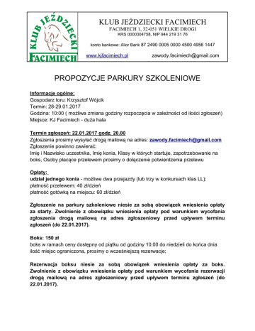 KLUB JEŹDZIECKI FACIMIECH FACIMIECH 1, 32-051 WIELKIE DROGI KRS 0000304758, NIP 944 219 31 76 konto bankowe: Alior Bank 87 2490 0005 0000 4500 4956 1447 www.kjfacimiech.pl [email protected] PROPOZYCJE PARKURY SZKOLENIOWE Informacje ogólne: Gospodarz toru: Krzysztof Wójcik Termin: 28-29.01.2017 Godzina: 10:00 ( możliwa zmiana godziny rozpoczęcia w zależności od ilości zgłoszeń) Miejsce: KJ Facimiech - duża hala Termin zgłoszeń: 22.01.2017 godz. 20.00 Zgłoszenia prosimy wysyłać drogą mailową na adres: [email protected] Zgłoszenie powinno zawierać: Imię i Nazwisko uczestnika, Imię konia, Klasy w których startuje, zapotrzebowanie na boks, Osoby płacące przelewem prosimy o dołączenie potwierdzenia przelewu Opłaty: udział jednego konia - możliwe dwa przejazdy (lub trzy w konkursach klas LL): płatność przelewem: 40 zł/dzień płatność gotówką na miejscu: 60 zł/dzień Zgłoszenie na parkury szkoleniowe niesie za sobą obowiązek wniesienia opłaty za starty. Zwolnienie z obowiązku wniesienia opłaty pod warunkiem wycofania zgłoszenia drogą mailową na adres zgłoszeniowy przed upływem terminu zgłoszeń (do 22.01.2017). Boks: 150 zł boks w ramach ceny dostępny od piątku od godziny 10.00 do niedzieli do końca dnia ilość miejsc ograniczona, prosimy o wcześniejszą rezerwacje; Rezerwacja boksu niesie za sobą obowiązek wniesienia opłaty za boks. Zwolnienie z obowiązku wniesienia opłaty pod warunkiem wycofania rezerwacji drogą mailową na adres zgłoszeniowy przed upływem terminu zgłoszeń (do 22.01.2017). Klasy: LL 60cm LL 80cm LL 90cm L L1 P P1 N C CC Zgłoszenia do klas analogicznie do konkursów na zawodach (max 3 starty dziennie w klasach LL, max 2 starty dziennie w pozostałych klasach, możliwy start 2 x w klasie L, w pozostałych klasach możliwy 1 start) Istnieje możliwość przejazdu parkurów na innej wysokości pod warunkiem wcześniejszego zgłoszenia (do 22.01.2017) takiego zapotrzebowania. Informacje dodatkowe Opłata za boks obejmuje ściółkę słomianą. Istnieje możliwość pościelenia peletem słomianym za dodatkową opłatą 15zł za worek 14kg – musi być zaznaczone w zgłoszeniu Organizator nie ponosi żadnej odpowiedzialności w razie wypadków i zachorowań uczestników, luzaków, trenerów, koni na terenie ośrodka i w czasie transportu jak również w przypadku kradzieży, zniszczeń, pożarów i innych zdarzeń losowych Parkury szkoleniowe są otwartym treningiem, a nie zawodami jeździeckimi – organizator nie zapewnia opieki medycznej i weterynaryjnej w czasie ich trwania. Uczestników prosimy o posiadanie dowodu aktualnych szczepień koni. Obowiązuje schludny strój jeździecki, kask obowiązkowy dla wszystkich, kamizelka ochronna zgodnie z przepisami PZJ. ZAKWATEROWANIE: Hostel Minor Skawina (ok 9 km) tel: 12 276 50 55 Pałac w Paszkówce (ok. 6 km.), Paszkówka 37, 34-113 Paszkówka, Tel. +48 33 872 38 00, Hotel Dworek Skawiński (ok 9 km) ul. Kublińskiego 4, 32-050 Skawina, tel. (012) 276-03-45 agroturystyka, Borek Szlachecki (ok. 5 km), tel. 695 625 898 agroturystyka Krzęcin 117 (ok. 5 km) tel. 12 270 60 45 Serdecznie zapraszamy! KODEKS POSTĘPOWANIA Z KONIEM Polski Związek Jeździecki prosi wszystkie osoby zaangażowane w jakikolwiek sposób w sporty konne, o przestrzeganie poniżej przedstawionego kodeksu oraz zasady, że dobro konia jest najważniejsze. Dobro konia musi być zawsze i wszędzie uwzględniane w sportach konnych i nie może być podporządkowane współzawodnictwu sportowemu ani innym celom np. komercyjnym. 1. Na wszystkich etapach treningu i przygotowań konia do startu w zawodach, dobro konia musi stać ponad wszelkimi innymi wymaganiami. Dotyczy to stałej opieki, metod treningu, starannego obrządku, kucia i transportu. 2. Konie i jeźdźcy muszą być wytrenowani, kompetentni i zdrowi zanim wezmą udział w zawodach. Odnosi się to także do podawania leków i środków medycznych, zabiegów chirurgicznych zagrażających dobru konia lub ciąży klaczy, oraz do przypadków nadużywania pomocy. 3. Zawody nie mogą zagrażać dobru konia. Wymaga to zwrócenia szczególnej uwagi na teren zawodów, powierzchnię podłoża, pogodę, warunki stajenne, kondycję koni i ich bezpieczeństwo także podczas podroży powrotnej z zawodów. 4. Należy dołożyć wszelkich starań, aby zapewnić koniom staranną opiekę po zakończeniu zawodów, a także humanitarne traktowanie po zakończeniu kariery sportowej. Dotyczy to właściwej opieki weterynaryjnej obrażeń odniesionych na zawodach, spokojnej starości, ewentualnie eutanazji. 5. PZJ zachęca wszystkie osoby działające w sporcie jeździeckim do stałego podnoszenia swojej wiedzy oraz umiejętności dotyczących wszelkich aspektów współpracy z koniem.