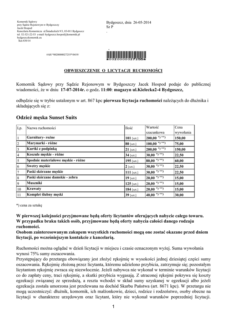 Komornik Sądowy przy Sądzie Rejonowym w Bydgoszczy Jacek Hospod Kancelaria Komornicza ul.Śniadeckich 9/3, 85-011 Bydgoszcz tel. 52-321-22-53 e-mail: [email protected] bydgoszczkomornik.eu Km 830/14 Bydgoszcz, dnia 26-05-2014 Sz P . #AH *0020000027255*/0419/ *0020000027255* OBWIESZCZENIE O LICYTACJI RUCHOMOŚCI Komornik Sądowy przy Sądzie Rejonowym w Bydgoszczy Jacek Hospod podaje do publicznej wiadomości, że w dniu 17-07-2014r. o godz. 11:00: magazyn ul.Kielecka2-4 Bydgoszcz, odbędzie się w trybie ustalonym w art. 867 kpc pierwsza licytacja ruchomości należących do dłużnika i składających się z: Odzież męska Sunset Suits Lp. Nazwa ruchomości Ilość 1 2 3 4 5 6 7 8 9 10 11 Garnitury- rożne Marynarki - różne Kurtki z podpinką Koszule męskie - różne Spodnie materiałowe męskie - różne Swetry męskie Paski skórzane męskie Paski skórzane damskie - zebra Muszniki Krawaty Komplet ślubny męski 101 [szt.] 80 [szt.] 21 [szt.] 34 [szt.] 195 [szt.] 2 [szt.] 111 [szt.] 19 [szt.] 125 [szt.] 184 [szt.] 39 [szt.] Wartość szacunkowa 200,00 *) **) 100,00 *) **) 200,00 *) **) 30,00 *) **) 80,00 *) **) 30,00 *) **) 30,00 *) **) 20,00 *) **) 20,00 *) **) 20,00 *) **) 40,00 *) **) Cena wywołania 150,00 75,00 150,00 22,50 60,00 22,50 22,50 15,00 15,00 15,00 30,00 *) cena za sztukę W pierwszej kolejności przyjmowane będą oferty licytantów oferujących nabycie całego towaru. W przypadku braku takich osób, przyjmowane będą oferty nabycia całości danego rodzaju ruchomości. Osobom zainteresowanym zakupem wszystkich ruchomości mogą one zostać okazane przed dniem licytacji, po wcześniejszym kontakcie z kancelarią. Ruchomości można oglądać w dzień licytacji w miejscu i czasie oznaczonym wyżej. Suma wywołania wynosi 75% sumy oszacowania. Przystępujący do przetargu obowiązany jest złożyć rękojmię w wysokości jednej dziesiątej części sumy oszacowania. Rękojmię złożoną przez licytanta, któremu udzielono przybicia, zatrzymuje się; pozostałym licytantom rękojmię zwraca się niezwłocznie. Jeżeli nabywca nie wykonał w terminie warunków licytacji co do zapłaty ceny, traci rękojmię, a skutki przybicia wygasają. Z utraconej rękojmi pokrywa się koszty egzekucji związanej ze sprzedażą, a reszta wchodzi w skład sumy uzyskanej w egzekucji albo jeżeli egzekucja została umorzona jest przelewana na dochód Skarbu Państwa (art. 8671 kpc). W przetargu nie mogą uczestniczyć: dłużnik, komornik, ich małżonkowie, dzieci, rodzice i rodzeństwo, osoby obecne na licytacji w charakterze urzędowym oraz licytant, który nie wykonał warunków poprzedniej licytacji. 1 Stawienie się jednego licytanta wystarcza do odbycia przetargu. Pełnomocnictwo do udziału w przetargu powinno być stwierdzone dokumentem z podpisem urzędowo poświadczonym, chyba że chodzi o pełnomocnictwo udzielone adwokatowi lub radcy prawnemu (art. 8672 kpc) UWAGA: Licytacja może się nie odbyć bez podania przyczyny. Komornik Sądowy Jacek Hospod Do wiadomości: 1. a/a 2