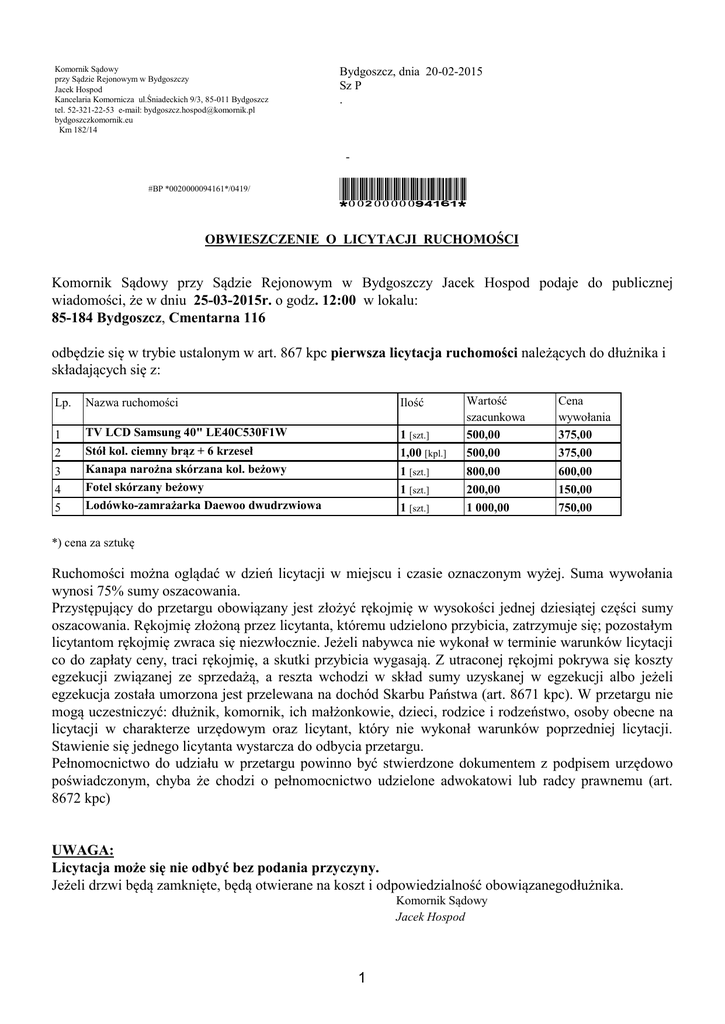 Komornik Sądowy przy Sądzie Rejonowym w Bydgoszczy Jacek Hospod Kancelaria Komornicza ul.Śniadeckich 9/3, 85-011 Bydgoszcz tel. 52-321-22-53 e-mail: [email protected] bydgoszczkomornik.eu Km 182/14 Bydgoszcz, dnia 20-02-2015 Sz P . #BP *0020000094161*/0419/ *0020000094161* OBWIESZCZENIE O LICYTACJI RUCHOMOŚCI Komornik Sądowy przy Sądzie Rejonowym w Bydgoszczy Jacek Hospod podaje do publicznej wiadomości, że w dniu 25-03-2015r. o godz. 12:00 w lokalu: 85-184 Bydgoszcz, Cmentarna 116 odbędzie się w trybie ustalonym w art. 867 kpc pierwsza licytacja ruchomości należących do dłużnika i składających się z: Lp. Nazwa ruchomości Ilość 1 2 3 4 5 TV LCD Samsung 40" LE40C530F1W Stół kol. ciemny brąz + 6 krzeseł Kanapa narożna skórzana kol. beżowy Fotel skórzany beżowy Lodówko-zamrażarka Daewoo dwudrzwiowa 1 [szt.] 1,00 [kpl.] 1 [szt.] 1 [szt.] 1 [szt.] Wartość szacunkowa 500,00 500,00 800,00 200,00 1 000,00 Cena wywołania 375,00 375,00 600,00 150,00 750,00 *) cena za sztukę Ruchomości można oglądać w dzień licytacji w miejscu i czasie oznaczonym wyżej. Suma wywołania wynosi 75% sumy oszacowania. Przystępujący do przetargu obowiązany jest złożyć rękojmię w wysokości jednej dziesiątej części sumy oszacowania. Rękojmię złożoną przez licytanta, któremu udzielono przybicia, zatrzymuje się; pozostałym licytantom rękojmię zwraca się niezwłocznie. Jeżeli nabywca nie wykonał w terminie warunków licytacji co do zapłaty ceny, traci rękojmię, a skutki przybicia wygasają. Z utraconej rękojmi pokrywa się koszty egzekucji związanej ze sprzedażą, a reszta wchodzi w skład sumy uzyskanej w egzekucji albo jeżeli egzekucja została umorzona jest przelewana na dochód Skarbu Państwa (art. 8671 kpc). W przetargu nie mogą uczestniczyć: dłużnik, komornik, ich małżonkowie, dzieci, rodzice i rodzeństwo, osoby obecne na licytacji w charakterze urzędowym oraz licytant, który nie wykonał warunków poprzedniej licytacji. Stawienie się jednego licytanta wystarcza do odbycia przetargu. Pełnomocnictwo do udziału w przetargu powinno być stwierdzone dokumentem z podpisem urzędowo poświadczonym, chyba że chodzi o pełnomocnictwo udzielone adwokatowi lub radcy prawnemu (art. 8672 kpc) UWAGA: Licytacja może się nie odbyć bez podania przyczyny. Jeżeli drzwi będą zamknięte, będą otwierane na koszt i odpowiedzialność obowiązanegodłużnika. Komornik Sądowy Jacek Hospod 1 Do wiadomości: 1. a/a 2