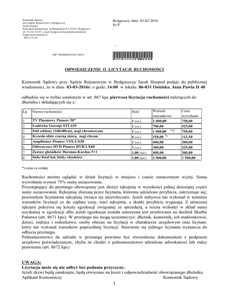 Komornik Sądowy przy Sądzie Rejonowym w Bydgoszczy Jacek Hospod Kancelaria Komornicza ul.Śniadeckich 9/3, 85-011 Bydgoszcz tel. 52-321-22-53 e-mail: [email protected] bydgoszczkomornik.eu Km 1172/14 Bydgoszcz, dnia 03-02-2016 Sz P . #BP *0020000239222*/0419/ *0020000239222* OBWIESZCZENIE O LICYTACJI RUCHOMOŚCI Komornik Sądowy przy Sądzie Rejonowym w Bydgoszczy Jacek Hospod podaje do publicznej wiadomości, że w dniu 03-03-2016r. o godz. 14:00 w lokalu: 86-031 Osielsko, Jana Pawła II 48 odbędzie się w trybie ustalonym w art. 867 kpc pierwsza licytacja ruchomości należących do dłużnika i składających się z: Lp. Nazwa ruchomości Ilość 1 2 3 4 5 6 7 8 TV Plazmowy Pioneer 50" Lodówka Gorenje EIT 635 Stół szklany (160x80cm), nogi chromowane Krzesło obite czarną skórą, nogi chrom Amplituner Pioneer VSX-LX50 Odtwarzacz DVD Pioneer DVR LX60 Zestaw głośników Harman-Kardon 5+1 Sofa+fotel kol. biały, ekoskóra 1 [szt.] 1 [szt.] 1 [szt.] 6 [szt.] 1 [szt.] 1 [szt.] 1,00 [kpl.] 1,00 [kpl.] Wartość szacunkowa 1 000,00 700,00 1 000,00 **) 150,00 *) 400,00 300,00 400,00 2 000,00 Cena wywołania 750,00 525,00 750,00 112,50 300,00 225,00 300,00 1 500,00 *) cena za sztukę Ruchomości można oglądać w dzień licytacji w miejscu i czasie oznaczonym wyżej. Suma wywołania wynosi 75% sumy oszacowania. Przystępujący do przetargu obowiązany jest złożyć rękojmię w wysokości jednej dziesiątej części sumy oszacowania. Rękojmię złożoną przez licytanta, któremu udzielono przybicia, zatrzymuje się; pozostałym licytantom rękojmię zwraca się niezwłocznie. Jeżeli nabywca nie wykonał w terminie warunków licytacji co do zapłaty ceny, traci rękojmię, a skutki przybicia wygasają. Z utraconej rękojmi pokrywa się koszty egzekucji związanej ze sprzedażą, a reszta wchodzi w skład sumy uzyskanej w egzekucji albo jeżeli egzekucja została umorzona jest przelewana na dochód Skarbu Państwa (art. 8671 kpc). W przetargu nie mogą uczestniczyć: dłużnik, komornik, ich małżonkowie, dzieci, rodzice i rodzeństwo, osoby obecne na licytacji w charakterze urzędowym oraz licytant, który nie wykonał warunków poprzedniej licytacji. Stawienie się jednego licytanta wystarcza do odbycia przetargu. Pełnomocnictwo do udziału w przetargu powinno być stwierdzone dokumentem z podpisem urzędowo poświadczonym, chyba że chodzi o pełnomocnictwo udzielone adwokatowi lub radcy prawnemu (art. 8672 kpc) UWAGA: Licytacja może się nie odbyć bez podania przyczyny. Jeżeli drzwi będą zamknięte, będą otwierane na koszt i odpowiedzialność obowiązanego dłużnika. Aplikant Komorniczy Komornik Sądowy 1 Marcin Lewandowski Jacek Hospod Do wiadomości: 1. a/a 2