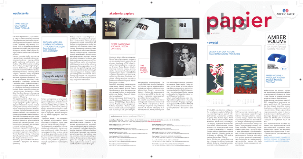 wydarzenia akademia papieru TARGI WIEDZY GRAFICZNEJ ORAZ TYPOLUB 4 (45) 2012 Od 26 do 28 października już po raz drugi, odbył się w Warszawie długi weekend z projektowaniem graficznym zorganizowany przez Stowarzyszenie Twórców Grafiki Użytkowej. Targi Wiedzy Graficznej 2012 to wyjątkowe wydarzenie dizajnerskie łączące liczne i różnorodne aktywności w jeden duży 3-dniowy festiwal dizajnu graficznego, jedyny taki w Polsce. Impreza integruje wiedzę teoretyczną i specjalistyczne porady branżowe, najświeższe tendencje i historię polskiej grafiki użytkowej, profesjonalne case studies, self-publishing oraz warsztaty druku vintage, occupy design i projektowanie dla biznesu, a także przegląd wydarzeń dizajnerskich z Polski i Europy. Prawdziwą śmietankę stanowią goście Targów – znakomici twórcy wszystkich dziedzin projektowania graficznego. Na całość wydarzenia złożyło się około sto pięćdziesiąt konsultacji indywidualnych, czterdzieści prezentacji i wykładów, cztery dyskusje tematyczne, cztery różnorodne warsztaty, jedna całodniowa konferencja poświęcona kondycji dizajnu w szerokim społecznym i ekonomicznym kontekście, a także Bring Your Own Beamer – efemeryczna wystawa projekcji multimedialnych oraz wieczorne AVterparty. Trzy tygodnie później odbyło się w Lublinie pierwsze z cyklu spotkań poświęconych typografii i grafice użytkowej – TypoLub. W założeniu impreza ma stać się miejscem wymiany doświadczeń pomiędzy tradycją typograficzną Wschodu i Zachodu. Jej organizatorami są Stowarzyszenie Panorama Kultur oraz Izba Drukarstwa przy Ośrodku Brama Grodzka – Teatr NN. Przedsięwzięcie to jest próbą włączenia projektowania graficznego do aktualnej dyskusji na temat znaczenia komunikacji międzykulturowej, z wykorzystaniem typografii jako jednego z narzędzi budowania dialogu. Na obydwu imprezach firma Arctic Paper zaznaczyła swoją obecność wykładem poświęconym papierom niepowlekanym. Temat okazał się trafiony – frekwencja dopisała, a prezentacja cieszyła się bardzo dużym zainteresowaniem. Prezentację prowadził Michał Büthner-Zawadzki – Specjalista ds. Rozwoju Sprzedaży. MICHAEL MITCHELL I SUSAN WIGHTMAN „TYPOGRAFIA KSIĄŻKI. PODRĘCZNIK PROJEKTANTA” Kolejna ważna pozycja na temat projektowania książek pod redakcją Roberta Olesia, współwłaściciela pracowni i wydawnictwa d2d.pl. Oficyna od kilku lat wprowadza na polski rynek publikacje będące kamieniami milowymi w dziedzinie typografii, takie jak „Elementarz stylu w typografii” Roberta Bringhursta czy „Detal w typografii” Josta Hochulego. „Typografia książki...” to przewodnik po zasadach projektowania i składu, zilustrowany i objaśniony ponad tysiącem precyzyjnie dobranych ilustracji. Ten bogaty zbiór przykładów i informacji obejmuje każdy istotny element procesu projektowania książki. Autorzy nie narzucają czytelnikowi swojego zdania, nie próbują go przekonać, że ich poparte wieloletnim doświadczeniem rozwiązania są jedyne i słuszne. Wnikliwie analizują wiele przykładów, podpowiadając jak zaprojektować i wydać piękną książkę. Michael Mitchell i Susan Wightman są praktykami. Prowadzą studio projektowe i wydawnictwo, wykonując usługi projektowania książek ilustrowanych, katalogów oraz projektów dla branży wydawniczej, m.in. National Gallery, Tate Gallery, Bloomsbury Publishing, Reaktion Books oraz Sir John Soane’s Museum. Zamiast nudnych opisów z historii typografii, słownikowych definicji czy też wyliczania jedynych słusznych dogmatów składu, dostajemy konkretne przykłady zastosowania nowoczesnych fontów, dogłębną analizę ich wizualnego oddziaływania na czytelnika, zalecenia dotyczące właściwego doboru ich wielkości tak, aby spełniały wymogi czytelności oraz estetyki zarówno tekstu, jak i towarzyszących im ilustracji. Całość jest wzbogacona omówieniem składu różnego typu książek i ich przygotowania do druku oraz właściwych ustawień opcji programów edytorskich. nowości TEATR NARODOWY. KRONIKA. SEZON 2011/2012 DESIGN IS IN OUR NATURE. KALENDARZ ARCTIC PAPER 2013 Kronika to album dokumentujący działalność Teatru Narodowego, wydawany co roku po zakończeniu sezonu. Po raz pierwszy ukazała się w 1962 roku z inicjatywy Kazimierza Dejmka – ówczesnego dyrektora Teatru. Zawiera aktualne informacje na temat zespołu, premier, działań impresaryjnych, edukacyjnych i wydawniczych. Zdjęcia z przedstawień i wydarzeń organizowanych przez Teatr, reprodukcje plakatów, pocztówek, projektów scenografi cznych oraz szkice poświęcone ważnym artystom współpracującym z Teatrem. W Kronice znajdziemy również esej Michała Mizery „Aktorzy narodowi”, charakteryzujący zespół aktorski Teatru Narodowego, a także dwa wspomnienia: Janusza Englerta o Andrzeju Łapickim oraz Barbary Osterloff „Zjawisko Hanuszkiewicz”. Kronikę opracowuje dział literacki Teatru Narodowego. Redaktorem Kroniki sezonu 2011/2012 była Dorota Semenowicz. Projekt graficzny przygotowała Marta Malesińska z Manuka Studio. Kronika została wydrukowana na papierach Munken Lynx 120 g/m2 i 300 g/m2. THE LITTLE BLACK JACKET Karl Lagerfeld, przy współpracy z Carine Roitfeld, byłą naczelną francuskiego Vogue’a, stworzył wyjątkowy album poświęcony jednemu z kultowych projektów Coco Chanel – czarnemu żakietowi. I choć od daty jego powstania minęło już ponad 50 lat do dziś jest jednym z najbardziej rozpoznawalnych produktów domu mody Chanel. Do projektu Lagerfeld zaprosił ponad setkę gwiazd, osobowości świata mody i filmu. Każda z nich prezentuje chanelowskiego klasyka na swój unikatowy sposób. W albumie zobaczymy m.in. Vanessę Paradis, która prezentuje ża- kiet w nonszalancki sposób, zarzucając go na ramię, Sarah Jessicę Parker noszącą go na głowie w formie turbanu czy obecną muzę mistrza, punkrockową piosenkarkę Alice Dellal, która 