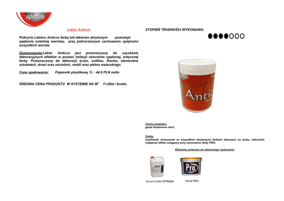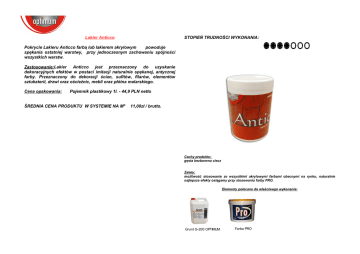 Lakier Anticco STOPIEŃ TRUDNOŚCI WYKONANIA: Pokrycie Lakieru Anticco farbą lub lakierem akrylowym powoduje spękania ostatniej warstwy, przy jednoczesnym zachowaniu spójności wszystkich warstw. Zastosowanie:Lakier Anticco jest przeznaczony do uzyskanie dekoracyjnych efektów w postaci imitacji naturalnie spękanej, antycznej farby. Przeznaczony do dekoracji ścian, sufitów, filarów, elementów sztukaterii, drzwi oraz ościeżnic, mebli oraz płótna malarskiego. Cena opakowania: Pojemnik plastikowy 1l. - 44,9 PLN netto ŚREDNIA CENA PRODUKTU W SYSTEMIE NA M2: 11,00zł / brutto. Cechy produktu: gęsta bezbarwna ciecz Zalety: możliwość stosowanie ze wszystkimi akrylowymi farbami obecnymi na rynku, naturalnie najlepsze efekty osiągamy przy stosowaniu farby PRO. Elementy polecane do właściwego wykonania: Grunt G-200 OPTIMUM Farba PRO Karta techniczna produktu ZASTOSOWANIE: Lakier Anticco jest przeznaczony do uzyskanie dekoracyjnych efektów w postaci imitacji naturalnie spękanej, antycznej farby. Przeznaczony do dekoracji ścian, sufitów, filarów, elementów sztukaterii, drzwi oraz ościeżnic, mebli oraz płótna malarskiego. WŁAŚCIWOŚCI: Pokrycie Lakieru Anticco farbą lub lakierem akrylowym powoduje spękania ostatniej warstwy, przy jednoczesnym zachowaniu spójności wszystkich warstw. SPOSÓB UŻYCIA: Powierzchnia musi być przygotowana jak pod standardowe wymalowanie farbą czy lakierem akrylowym – czyli wolna od zanieczyszczeń, luźnych starych powłok, odpylona i zagruntowana. Następnie etapami przechodzimy do tworzenia efektu Anticco. 1.Malujemy powierzchnię na wybrany kolor farbą akrylową, mając na uwadze, iż ta warstwa będzie widoczna jako rysy spękań. Czekamy do całkowitego wyschnięcia pierwszej warstwy. Jeśli nie nałożymy pierwszej warstwy wówczas rysy spękań będą miały kolor podłoża, co praktykuje się w przypadku nakładania na zagruntowane drewno lub płótno malarskie 2.Kolejnym etapem jest nałożenie Lakieru Anticco. Czynność tę wykonujemy wyłącznie pędzlem malarskim w jednym kierunku. Czekamy do całkowitego wyschnięcia warstwy Lakieru Anticco. 3.Trzecim etapem jest nałożenie farby akrylowej, kolorystycznie dobranej na zasadzie kontrastu do warstwy pierwszej, gdyż to właśnie trzecia warstwa zostanie poddana procesowi spękania, ukazując w szczelinach spękań kolor warstwy pierwszej. Efekt spękań pojawia się po około 15 minutach od nałożenia warstwy trzeciej. 4.Po całkowitym wyschnięciu całość możemy zabezpieczyć preparatem Latex, który stworzy bezbarwną warstwę zabezpieczającą. DANE TECHNICZNE: 1. Baza: lakier polioctanowy. 2. Konsystencja: płynna. 3. Kolor: bezbarwny. 4. Stopień połysku: wysoki. 5. Zużycie: 1 L / 6m2 6. Temperatura nakładania: +10O C- +25O C. 7. Czas schnięcia: około 4 godziny z temperaturze pokojowej. 8. Opakowanie: 1L. 9. Okres przydatności: 1 rok. 10. Rozcieńczanie: nie rozcieńczać. 11. Odporność na uszkodzenia nie dotyczy. mechaniczne: 12. pH: 7-8. 13. Szkodliwość: nie zawiera substancji szkodliwych dla zdrowia i środowiska. 14. Przechowywanie: +5O C- +45O C, chronić przed mrozem.