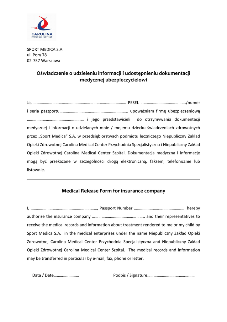 SPORT MEDICA S.A. ul. Pory 78 02-757 Warszawa Oświadczenie o udzieleniu informacji i udostępnieniu dokumentacji medycznej ubezpieczycielowi Ja, ……………………………………………………………………………. PESEL ……………………………………./numer i seria paszportu……………………………………………………….. upoważniam firmę ubezpieczeniową ……………………………………………… i jego przedstawicieli do otrzymywania dokumentacji medycznej i informacji o udzielanych mnie / mojemu dziecku świadczeniach zdrowotnych przez „Sport Medica” S.A. w przedsiębiorstwach podmiotu leczniczego Niepubliczny Zakład Opieki Zdrowotnej Carolina Medical Center Przychodnia Specjalistyczna i Niepubliczny Zakład Opieki Zdrowotnej Carolina Medical Center Szpital. Dokumentacja medyczna i informacje mogą być przekazane w szczególności drogą elektroniczną, faksem, telefonicznie lub listownie. Medical Release Form for insurance company I, ………………………………………………………, Passport Number …………………………………………. hereby authorize the insurance company ………………………………………….. and their representatives to receive the medical records and information about treatment rendered to me or my child by Sport Medica S.A. in the medical enterprises under the name Niepubliczny Zakład Opieki Zdrowotnej Carolina Medical Center Przychodnia Specjalistyczna and Niepubliczny Zakład Opieki Zdrowotnej Carolina Medical Center Szpital. The medical records and information may be transferred in particular by e-mail, fax, phone or letter. Data / Date…………………… Podpis / Signature………………………………………
