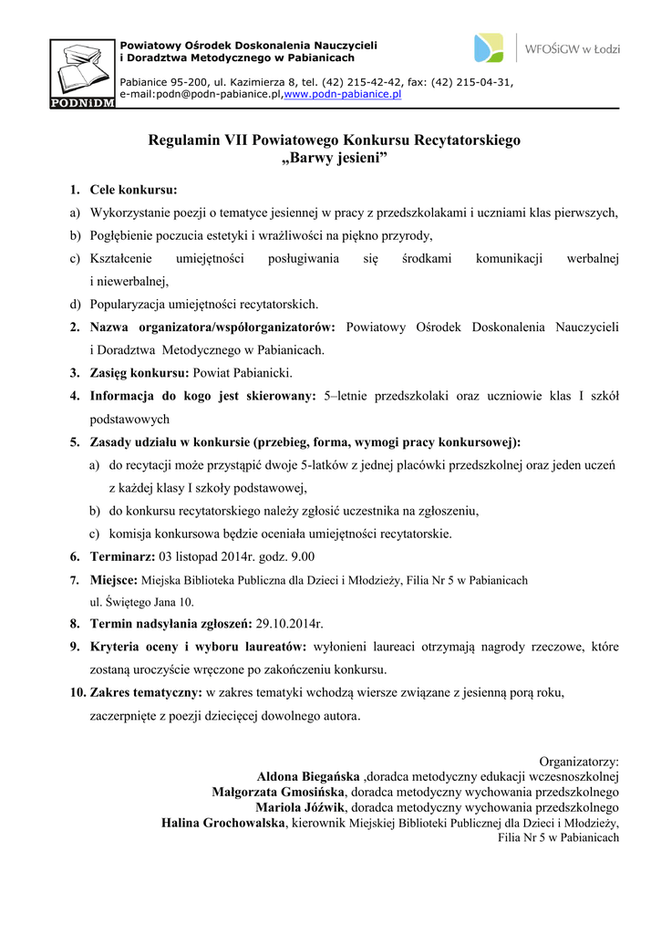 Powiatowy Ośrodek Doskonalenia Nauczycieli i Doradztwa Metodycznego w Pabianicach Pabianice 95-200, ul. Kazimierza 8, tel. (42) 215-42-42, fax: (42) 215-04-31, e-mail:[email protected],www.podn-pabianice.pl Regulamin VII Powiatowego Konkursu Recytatorskiego „Barwy jesieni” 1. Cele konkursu: a) Wykorzystanie poezji o tematyce jesiennej w pracy z przedszkolakami i uczniami klas pierwszych, b) Pogłębienie poczucia estetyki i wrażliwości na piękno przyrody, c) Kształcenie umiejętności posługiwania się środkami komunikacji werbalnej i niewerbalnej, d) Popularyzacja umiejętności recytatorskich. 2. Nazwa organizatora/współorganizatorów: Powiatowy Ośrodek Doskonalenia Nauczycieli i Doradztwa Metodycznego w Pabianicach. 3. Zasięg konkursu: Powiat Pabianicki. 4. Informacja do kogo jest skierowany: 5–letnie przedszkolaki oraz uczniowie klas I szkół podstawowych 5. Zasady udziału w konkursie (przebieg, forma, wymogi pracy konkursowej): a) do recytacji może przystąpić dwoje 5-latków z jednej placówki przedszkolnej oraz jeden uczeń z każdej klasy I szkoły podstawowej, b) do konkursu recytatorskiego należy zgłosić uczestnika na zgłoszeniu, c) komisja konkursowa będzie oceniała umiejętności recytatorskie. 6. Terminarz: 03 listopad 2014r. godz. 9.00 7. Miejsce: Miejska Biblioteka Publiczna dla Dzieci i Młodzieży, Filia Nr 5 w Pabianicach ul. Świętego Jana 10. 8. Termin nadsyłania zgłoszeń: 29.10.2014r. 9. Kryteria oceny i wyboru laureatów: wyłonieni laureaci otrzymają nagrody rzeczowe, które zostaną uroczyście wręczone po zakończeniu konkursu. 10. Zakres tematyczny: w zakres tematyki wchodzą wiersze związane z jesienną porą roku, zaczerpnięte z poezji dziecięcej dowolnego autora. Organizatorzy: Aldona Biegańska ,doradca metodyczny edukacji wczesnoszkolnej Małgorzata Gmosińska, doradca metodyczny wychowania przedszkolnego Mariola Jóźwik, doradca metodyczny wychowania przedszkolnego Halina Grochowalska, kierownik Miejskiej Biblioteki Publicznej dla Dzieci i Młodzieży, Filia Nr 5 w Pabianicach Powiatowy Ośrodek Doskonalenia Nauczycieli i Doradztwa Metodycznego w Pabianicach Pabianice 95-200, ul. Kazimierza 8, tel. (42) 215-42-42, fax: (42) 215-04-31, e-mail:[email protected],www.podn-pabianice.pl ……………….…………………….. (podpisy i pieczątki osób upoważnionych do składania oświadczeń woli w imieniu Wnioskodawcy)