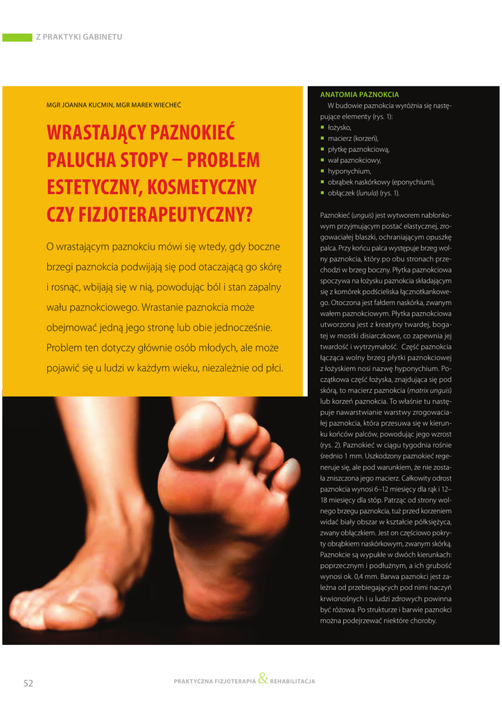 Z PRAKTYKI GABINETU ANATOMIA PAZNOKCIA W budowie paznokcia wyróżnia się następujące elementy (rys. 1): łożysko, macierz (korzeń), płytkę paznokciową, wał paznokciowy, hyponychium, obrąbek naskórkowy (eponychium), obłączek (lunula) (rys. 1). MGR JOANNA KUCMIN, MGR MAREK WIECHEĆ WRASTAJĄCY PAZNOKIEĆ PALUCHA STOPY – PROBLEM ESTETYCZNY, KOSMETYCZNY CZY FIZJOTERAPEUTYCZNY? O wrastającym paznokciu mówi się wtedy, gdy boczne brzegi paznokcia podwijają się pod otaczającą go skórę i rosnąc, wbijają się w nią, powodując ból i stan zapalny wału paznokciowego. Wrastanie paznokcia może obejmować jedną jego stronę lub obie jednocześnie. Problem ten dotyczy głównie osób młodych, ale może pojawić się u ludzi w każdym wieku, niezależnie od płci. 52 PRAKTYCZNA FIZJOTERAPIA & REHABILITACJA Paznokieć (unguis) jest wytworem nabłonkowym przyjmującym postać elastycznej, zrogowaciałej blaszki, ochraniającym opuszkę palca. Przy końcu palca występuje brzeg wolny paznokcia, który po obu stronach przechodzi w brzeg boczny. Płytka paznokciowa spoczywa na łożysku paznokcia składającym się z komórek podścieliska łącznotkankowego. Otoczona jest fałdem naskórka, zwanym wałem paznokciowym. Płytka paznokciowa utworzona jest z kreatyny twardej, bogatej w mostki disiarczkowe, co zapewnia jej twardość i wytrzymałość. Część paznokcia łącząca wolny brzeg płytki paznokciowej z łożyskiem nosi nazwę hyponychium. Początkowa część łożyska, znajdująca się pod skórą, to macierz paznokcia (matrix unguis) lub korzeń paznokcia. To właśnie tu następuje nawarstwianie warstwy zrogowaciałej paznokcia, która przesuwa się w kierunku końców palców, powodując jego wzrost (rys. 2). Paznokieć w ciągu tygodnia rośnie średnio 1 mm. Uszkodzony paznokieć regeneruje się, ale pod warunkiem, że nie została zniszczona jego macierz. Całkowity odrost paznokcia wynosi 6–12 miesięcy dla rąk i 12– 18 miesięcy dla stóp. Patrząc od strony wolnego brzegu paznokcia, tuż przed korzeniem widać biały obszar w kształcie półksiężyca, zwany obłączkiem. Jest on częściowo pokryty obrąbkiem naskórkowym, zwanym skórką. Paznokcie są wypukłe w dwóch kierunkach: poprzecznym i podłużnym, a ich grubość wynosi ok. 0,4 mm. Barwa paznokci jest zależna od przebiegających pod nimi naczyń krwionośnych i u ludzi zdrowych powinna być różowa. Po strukturze i barwie paznokci można podejrzewać niektóre choroby. Z PRAKTYKI GABINETU wolny brzeg paznokcia płytka paznokciowa wał paznokciowy obłączek macierz obrąbek naskórkowy hyponychium łożysko Rys. 1. Budowa paznokcia KORZEŃ Warstwa rogowa OBŁĄCZEK STREFA ZARÓŻOWIONA BRZEG WOLNY Oskórek Obrąbek naskórkowy (eponychium) Skóra właściwa MACIERZ ŁOŻYSKO PAZNOKCIA Płytka paznokcia Keratyna twarda 3/4 Obłączek Keratyna miękka 1/4 Macierz Część dalsza Kierunek wzrostu Część bliższa Rys. 2. Szczegółowa budowa paznokcia WRASTAJĄCY PAZNOKIEĆ (UNGUIS INCARNATUS) To dolegliwość, z którą zmaga się spora część społeczeństwa. W przypadku odpowiedniego postępowania zachowawczego nie stanowi on poważnego problemu medycznego. W momencie zbagatelizowania pierwszych objawów stanu zapalnego i niepodjęcia żadnego leczenia można doprowadzić do rozwoju zakażenia i wystąpienia poważnych powikłań. PRZYCZYNY POWSTAWANIA WRASTAJĄCEGO PAZNOKCIA Wrastanie paznokcia może być wywołane: czynnikami genetycznymi (wrodzone anomalie paznokciowe), zaburzeniami procesów mikrokrążenia w przebiegu różnych chorób naczyniowych, niewłaściwą technika obcinania paznokci (warto podkreślić, że niektóre osoby, mimo właściwej pielęgnacji paznokci, mają szczególne predyspozycje do występowania tej dolegliwości). Czynnikami sprzyjającymi pojawieniu się wrastania paznokcia są także uszkodzenia i deformacje w obrębie palucha i stopy (paluch koślawy, stopa płasko-koślawa), noszenie nieodpowiednio dopasowanego obuwia, a także defekty i choroby płytki paznokciowej (zdj. 1). ROZPOZNANIE Podstawowymi objawami sugerującymi rozpoznanie wrastającego paznokcia są obrzęk, zaczerwienienie i bolesność w obrębie wału paznokciowego – po stronie, gdzie wrasta on pod skórę. Początkowo ból występuje tylko podczas drażnienia miejsca objętego procesem zapalnym. Przy braku odpowiedniego leczenia paznokieć wrasta głębiej w otaczające go tkanki miękkie, powodując nasilenie objawów i stałe występowanie bólu. Nieleczony stan zapalny może doprowadzić do poważnych powikłań, takich jak ostre zakażenie wału paznokciowego (ostra zanokcica). Zdj. 1. Choroby płytki paznokciowej maj 2015 53 Z PRAKTYKI GABINETU ZANOKCICA Zanokcica (paronychia) to ostre ropne zapalenie tkanek okołopaznokciowych, powstające na skutek zakażenia bakteryjnego (prowokowane uszkodzeniami oskórka), rzadziej wirusowego lub grzybiczego. Choroba ma ostry przebieg, a zmiany w obrębie paznokcia są bardzo bolesne. Wał paznokciowy ma kolor żywo czerwony, a pod nim widoczna jest ropna wydzielina. W celu zdiagnozowania choroby zaleca się posiew i wrażliwość bakterii, rzadziej wirusów i grzybów. W przypadku zakażenia bakteryjnego stosuje się antybiotyki ogólnie, jeśli etiologia wirusowa – leki przeciwwirusowe, a w przypadku zakażeń grzybiczych zaleca się miejscowe leki przeciwgrzybicze. Ważne kroki przyczyniające się do eliminacji choroby obejmują również ochronę wału paznokciowego oraz zmniejszenie jego ekspozycji na wilgoć i inne czynniki drażniące. W ciężkich przypadkach, jeśli powyższe postępowanie lecznicze zawodzi, niezbędna może okazać się ingerencja chirurgiczna – nacięcie i drenaż lub usunięcie płytki paznokciowej. W przypadku wrastających paznokci bardzo ważne zadanie będzie spełniać profilaktyka i edukacja osób narażonych na tę dolegliwość. Warto poinformować chorego o przyczynach wrastania płytek paznokci