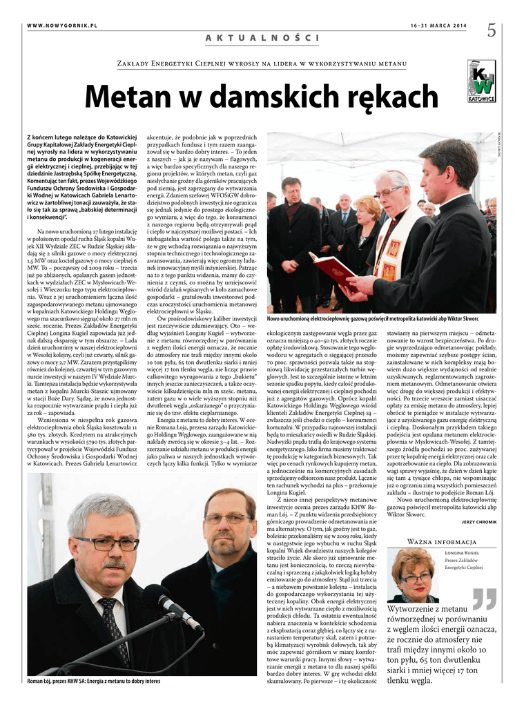 W W W.NOW YGORNIK.PL 16 –31 M A R C A 2 014 A K T U A L N O Ś C I 5 Zakłady Energetyki Cieplnej wyrosły na lidera w wykorzystywaniu metanu Z końcem lutego należące do Katowickiej Grupy Kapitałowej Zakłady Energetyki Cieplnej wyrosły na lidera w wykorzystywaniu metanu do produkcji w kogeneracji energii elektrycznej i cieplnej, przebijając w tej dziedzinie Jastrzębską Spółkę Energetyczną. Komentując ten fakt, prezes Wojewódzkiego Funduszu Ochrony Środowiska i Gospodarki Wodnej w Katowicach Gabriela Lenartowicz w żartobliwej tonacji zauważyła, że stało się tak za sprawą „babskiej determinacji i konsekwencji”. Na nowo uruchomioną 27 lutego instalację w położonym opodal ruchu Śląsk kopalni Wujek XII Wydziale ZEC w Rudzie Śląskiej składają się 2 silniki gazowe o mocy elektrycznej 1,5 MW oraz kocioł gazowy o mocy cieplnej 6 MW. To – począwszy od 2009 roku – trzecia już po zbliżonych, opalanych gazem jednostkach w wydziałach ZEC w Mysłowicach-Wesołej i Wieczorku tego typu elektrociepłownia. Wraz z jej uruchomieniem łączna ilość zagospodarowywanego metanu ujmowanego w kopalniach Katowickiego Holdingu Węglowego ma szacunkowo sięgnąć około 27 mln m sześc. rocznie. Prezes Zakładów Energetyki Cieplnej Longina Kugiel zapowiada już jednak dalszą ekspansję w tym obszarze. – Lada dzień uruchomimy w naszej elektrociepłowni w Wesołej kolejny, czyli już czwarty, silnik gazowy o mocy 2,7 MW. Zarazem przystąpiliśmy również do kolejnej, czwartej w tym gazowym nurcie inwestycji w naszym IV Wydziale Murcki. Tamtejsza instalacja będzie wykorzystywała metan z kopalni Murcki-Staszic ujmowany w stacji Boże Dary. Sądzę, że nowa jednostka rozpocznie wytwarzanie prądu i ciepła już za rok – zapowiada. Wzniesiona w niespełna rok gazowa elektrociepłownia obok Śląska kosztowała 11 580 tys. złotych. Kredytem na atrakcyjnych warunkach w wysokości 5790 tys. złotych partycypował w projekcie Wojewódzki Fundusz Ochrony Środowiska i Gospodarki Wodnej w Katowicach. Prezes Gabriela Lenartowicz akcentuje, że podobnie jak w poprzednich przypadkach fundusz i tym razem zaangażował się w bardzo dobry interes. – To jeden z naszych – jak ja je nazywam – flagowych, a więc bardzo specyficznych dla naszego regionu projektów, w których metan, czyli gaz niesłychanie groźny dla górników pracujących pod ziemią, jest zaprzęgany do wytwarzania energii. Zdaniem szefowej WFOŚiGW dobrodziejstwo podobnych inwestycji nie ogranicza się jednak jedynie do prostego ekologicznego wymiaru, a więc do tego, że konsumenci z naszego regionu będą otrzymywali prąd i ciepło w najczystszej możliwej postaci. – Ich niebagatelna wartość polega także na tym, że w grę wchodzą rozwiązania o najwyższym stopniu technicznego i technologicznego zaawansowania, zawierają więc ogromny ładunek innowacyjnej myśli inżynierskiej. Patrząc na to z tego punktu widzenia, mamy do czynienia z czymś, co można by umiejscowić wśród działań wpisanych w koło zamachowe gospodarki – gratulowała inwestorowi podczas uroczystości uruchomienia metanowej elektrociepłowni w Śląsku. Ów prośrodowiskowy kaliber inwestycji jest rzeczywiście zdumiewający. Oto – według wyjaśnień Longiny Kugiel – wytworzenie z metanu równorzędnej w porównaniu z węglem ilości energii oznacza, że rocznie do atmosfery nie trafi między innymi około 10 ton pyłu, 65 ton dwutlenku siarki i mniej więcej 17 ton tlenku węgla, nie licząc prawie całkowitego wyrugowania z tego „bukietu” innych jeszcze zanieczyszczeń, a także oczywiście kilkudziesięciu mln m sześc. metanu, zatem gazu w o wiele wyższym stopniu niż dwutlenek węgla „oskarżanego” o przyczynianie się do tzw. efektu cieplarnianego. Energia z metanu to dobry interes. W ocenie Romana Łoja, prezesa zarządu Katowickiego Holdingu Węglowego, zaangażowane w nią nakłady zwrócą się w okresie 3–4 lat. – Rozszerzanie udziału metanu w produkcji energii jako paliwa w naszych jednostkach wytwórczych łączy kilka funkcji. Tylko w wymiarze Roman Łój, prezes KHW SA: Energia z metanu to dobry interes NOWY GÓRNIK Metan w damskich rękach Nowo uruchomioną elektrociepłownię gazową poświęcił metropolita katowicki abp Wiktor Skworc ekologicznym zastępowanie węgla przez gaz oznacza mniejszą o 40–50 tys. złotych rocznie opłatę środowiskową. Stosowanie tego węglowodoru w agregatach o sięgającej przeszło 70 proc. sprawności pozwala także na stopniową likwidację przestarzałych turbin węglowych. Jest to szczególnie istotne w letnim sezonie spadku popytu, kiedy całość produkowanej energii elektrycznej i cieplnej pochodzi już z agregatów gazowych. Oprócz kopalń Katowickiego Holdingu Węglowego wśród klienteli Zakładów Energetyki Cieplnej są – zwłaszcza jeśli chodzi o ciepło – konsumenci komunalni. W przypadku najnowszej instalacji będą to mieszkańcy osiedli w Rudzie Śląskiej. Nadwyżki prądu trafią do krajowego systemu energetycznego. Jako firma musimy traktować tę produkcję w kategoriach biznesowych. Tak więc po cenach rynkowych kupujemy metan, a jednocześnie na komercyjnych zasadach sprzedajemy odbiorcom nasz produkt. Łącznie ten rachunek wychodzi na plus – przekonuje Longina Kugiel. Z nieco innej perspektywy metanowe inwestycje ocenia prezes zarządu KHW Roman Łój. – Z punktu widzenia przedsiębiorcy górniczego prowadzenie odmetanowania nie ma alternatywy. O tym, jak groźny jest to gaz, boleśnie przekonaliśmy się w 2009 roku, kiedy w następstwie jego wybuchu w ruchu Śląsk kopalni Wujek dwudziestu naszych kolegów straciło życie. Ale skoro już ujmowanie metanu jest koniecznością, to rzeczą niewybaczalną i sprzeczną z jakąkolwiek logiką byłoby emitowanie go do atmosfery. Stąd już trzecia – a niebawem powstanie kolejna – instalacja do gospodarczego wykorzystania tej użytecznej kopaliny. Obok energi