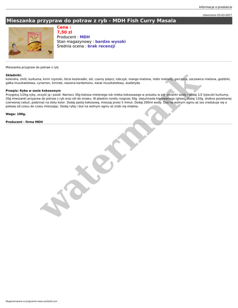 Informacje o produkcie Utworzono 03-03-2017 Mieszanka przypraw do potraw z ryb - MDH Fish Curry Masala Cena : 7,50 zl Producent : MDH Stan magazynowy : bardzo wysoki Średnia ocena : brak recenzji Mieszanka przypraw do potraw z ryb. er m ar k Składniki: kolendra, chilli, kurkuma, kmin rzymski, liście kozieradki, sól, czarny pieprz, lubczyk, mango mielone, imbir mielony, gorczyca, soczewica mielona, goździki, gałka muszkatołowa, cynamon, kminek, nasiona kardamonu, kwiat muszkatołowy, asafetyda. Przepis: Ryba w sosie kokosowym Przygotuj 1/2kg.ryby, oczyść ją i posól. Namocz 30g kokosa mielonego lub mleka kokosowego w proszku w pół szklanki wody i dodaj 1/2 łyżeczki kurkumy, 20g mieszanki przypraw do potraw z ryb oraz sól do smaku. W płaskim rondlu rozgrzej 30g. oleju/masła klarowanego (ghee), dodaj 120g. drobno posiekanej czerwonej cebuli, podsmaż na złoty kolor. Dodaj pastę kokosową, mieszaj przez 5 minut. Dodaj 200ml wody. Duś na wolnym ogniu aż sos zredukuje się o połowę od czasu do czasu mieszając. Dodaj rybę i duś na wolnym ogniu aż zrobi się miękka. Waga: 100g. w at Producent - firma MDH Wygenerowano w programie www.oscGold.com