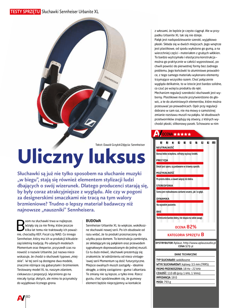 TESTY SPRZĘTU Słuchawki Sennheiser Urbanite XL z włosami, że będzie je często ciągnął. Ale w przypadku Urbanite XL tak się nie dzieje. Pałąk jest nadspodziewanie szeroki, wyjątkowo płaski. Składa się w dwóch miejscach. Jego wnętrze jest plastikowe, od spodu wyłożono go gumą, a na wierzchniej części – materiałem z grubych włókien. To bardzo wytrzymała i elastyczna konstrukcja – można go praktycznie w całości wyprostować, po chwili powróci do pierwotnej formy bez żadnego problemu. Jego końcówki to aluminiowe prowadnice, z tego samego materiału wykonano elementy trzymające wszystko razem. Choć połączenie wygląda delikatnie, to w istocie jest bardzo solidne, co czuć po wzięciu produktu do ręki. Mechanizm regulacji szerokości słuchawek jest wyborny. Plastikowe muszle przytwierdzono do głowic, a te do aluminiowych elementów, które można przesuwać po prowadnicach. Opór przy regulacji dobrano w sam raz, nie ma mowy o samoistnej zmianie rozstawu muszli na pałąku. W obudowach przetworników znajdują się otwory, z których wychodzi płaski, silikonowy pasek. Schowano w nim OCENA Uliczny luksus Tekst: Dawid Grzyb ❙ Zdjęcia: Sennheiser Słuchawki są już nie tylko sposobem na słuchanie muzyki „w biegu”, stają się również elementem stylizacji ludzi dbających o swój wizerunek. Dlatego producenci starają się, by były coraz atrakcyjniejsze z wyglądu. Ale czy w pogoni za designerskimi smaczkami nie tracą na tym walory brzmieniowe? Trudno o lepszy materiał badawczy niż najnowsze „nauszniki” Sennheisera. B oom na słuchawki trwa w najlepsze. Wzięły się za nie firmy, które jeszcze kilka lat temu nie traktowały ich poważnie, chociażby KEF, Focal czy NAD. Co innego Sennheiser, który ma ich w produkcji kilkudziesięcioletnią tradycję. Po udanych modelach Momentum oraz Amperior, przyszedł czas na nowość o nazwie Urbanite. Już nazwa nieco wskazuje, że chodzi o słuchawki typowo „miejskie”. W tej serii są dostępne dwa modele, znacznie różniące się gabarytami i brzmieniem. Testowany model XL to, naszym zdaniem, ciekawsza z propozycji. Wyceniono go na niecały tysiąc złotych, ale mimo to przynależy do wyjątkowo licznego grona. 80 BUDOWA Sennheiser Urbanite XL to większe, wokółuszne słuchawki nowej serii. Po ich obudowie od razu widać, że to produkt przeznaczony do użytku poza domem. To konstrukcja zamknięta, ze składającym się pałąkiem oraz przewodem sygnałowym doprowadzanym do jednej muszli. Co tu dużo mówić, słuchawki prezentują się znakomicie. W odróżnieniu od nieco vintage’owej serii Momentum są dość futurystyczne. Miejsce owalnych muszli zastąpiły – idealnie okrągłe, a skórę zastąpiono – guma i alkantara. Te zmiany nie są lepsze, a tylko inne. Rzecz gustu, choć spodziewałem się, że gumowy element będzie nieprzyjemny w kontakcie 1 2 4 3 5 6 7 8 9 10 NEUTRALNOŚĆ Barwa lekko ocieplona, cofnięty wyższy środek. PRECYZJA Detali jest sporo, są podawane w strawny sposób. MUZYKALNOŚĆ Po prostu dobra, a nawet więcej niż dobra. STEREOFONIA Scena jest rozbudowana zarówno wszerz, jak i w głąb. DYNAMIKA Na wysokim poziomie. BAS Technicznie bardzo dobry, nie skupia na sobie uwagi. OCENA 82% KATEGORIA SPRZĘTU B DYSTRYBUTOR Aplauz, http://www.aplauzaudio.pl CENA 979 zł DANE TECHNICZNE TYP SŁUCHAWEK: wokółuszne WTYK SŁUCHAWKOWY: kątowy 3,5 mm (TRRS) PASMO PRZENOSZENIA: 18 Hz – 22 kHz CZUŁOŚĆ: 110 dB (przy 1 kHz, 1 Vrms) IMPEDANCJA: 18 Ω MASA: 793 g SYSTEM ODSŁUCHOWY ❙ ODTWARZACZE: iPhone 5S, iBasso DX90, HiFiMAN HM-901 ❙ SŁUCHAWKI: Creative Aurvana Live! przewody sygnałowe. Jest dyskretny i estetycznie zaaplikowany, praktycznie go nie widać. Nauszniki są dość miękkie, w środku jest sporo miejsca, w które swobodnie wchodzą mniejsze małżowiny. Gąbki powleczono alkantarą, podobnie jak we flagowym modelu Sennheisera – HD800. Również dzięki niej Urbanite XL prezentują się luksusowo. Przewód sygnałowy jest płaski, zwieńczony kątowym 3,5-mm wtykiem typu TRRS. Od strony słuchawek jest taki sam, ale z prostym mechanizmem blokującym. Na kablu zamontowano też niewielki pilot z guzikami cyfrowymi do regulacji głośności oraz odbierania/kończenia połączeń. Słuchawki występują w dwóch wersjach sterowania: do Samsungów Galaxy (w praktyce działają z większością androidów) i do urządzeń Apple. BRZMIENIE Najczęściej słuchawki przeznaczone do użytku poza domem mają mocno uwydatniony bas. Przekłada się to w wielu przypadkach na gęsty i nieco niewyraźny przekaz. Nie jest to reguła, ale wyjątki są nieliczne. Sennheiser podąża inną drogą. Brzmienie produktów tej firmy jest często zrównoważone, czego Urbanite XL są najlepszym przykładem. Bas jest jedynie dodatkiem do całości. Nie schodzi przesadnie nisko i jest lekko wyeksponowany w jego wyższych częściach. To przydaje produktowi energetyczne brzmienie. Ale niskie tony są dobrze kontrolowane całościowo, zwarte, nieco konturowe, mają lekko ocieploną barwę. Choć pod tym względem produkty serii Momentum grają jeszcze bardziej miękko. Środek jest wyraźny i zrównoważony. Nie słychać wycofania ani wokalistów, partii gitarowych ani jakiegokolwiek innego instrumentu z tego zakresu pasma. Dociążenie, barwa oraz dynamika są należyte. Wysokie tony określiłbym jako obecne, gładkie, zróżnicowane i długo wybrzmiewające. Co innego wyższe tony średnie. Słychać, że ten podzakres jest wycofany, co sprawia, że przekaz jest całościowo lekko niewyraźny, zupełnie tak, jak gdyby pomiędzy uchem a przetwornikiem rozpostarto niewidzialny woal. Nie jest to, co prawda, duża niedogodność, ale coś, co osłuchana para uszu pewnie wychwyci. Scena dźwiękowa jest mocno rozbudowana po bokach, a jeszcze bardziej w głąb. W wyniku osłabienia słyszalności wyższych fragmentów środka pasma to w sumie oczekiwana cecha. Przekaz jes