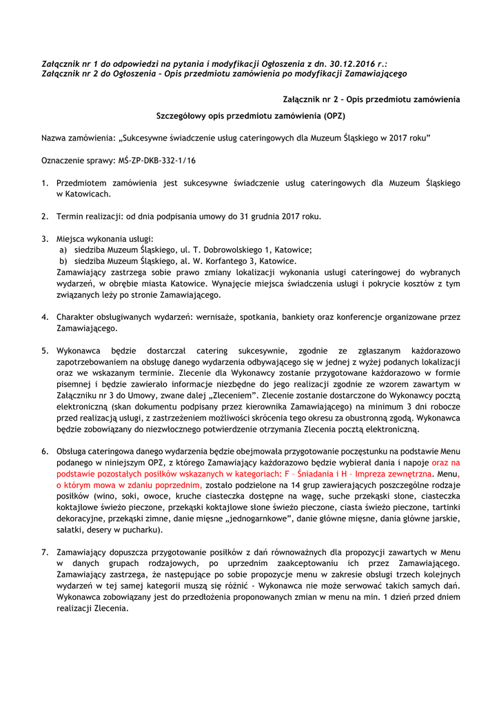 Załącznik nr 1 do odpowiedzi na pytania i modyfikacji Ogłoszenia z dn. 30.12.2016 r.: Załącznik nr 2 do Ogłoszenia – Opis przedmiotu zamówienia po modyfikacji Zamawiającego Załącznik nr 2 – Opis przedmiotu zamówienia Szczegółowy opis przedmiotu zamówienia (OPZ) Nazwa zamówienia: „Sukcesywne świadczenie usług cateringowych dla Muzeum Śląskiego w 2017 roku” Oznaczenie sprawy: MŚ-ZP-DKB-332-1/16 1. Przedmiotem zamówienia jest sukcesywne świadczenie usług cateringowych dla Muzeum Śląskiego w Katowicach. 2. Termin realizacji: od dnia podpisania umowy do 31 grudnia 2017 roku. 3. Miejsca wykonania usługi: a) siedziba Muzeum Śląskiego, ul. T. Dobrowolskiego 1, Katowice; b) siedziba Muzeum Śląskiego, al. W. Korfantego 3, Katowice. Zamawiający zastrzega sobie prawo zmiany lokalizacji wykonania usługi cateringowej do wybranych wydarzeń, w obrębie miasta Katowice. Wynajęcie miejsca świadczenia usługi i pokrycie kosztów z tym związanych leży po stronie Zamawiającego. 4. Charakter obsługiwanych wydarzeń: wernisaże, spotkania, bankiety oraz konferencje organizowane przez Zamawiającego. 5. Wykonawca będzie dostarczał catering sukcesywnie, zgodnie ze zgłaszanym każdorazowo zapotrzebowaniem na obsługę danego wydarzenia odbywającego się w jednej z wyżej podanych lokalizacji oraz we wskazanym terminie. Zlecenie dla Wykonawcy zostanie przygotowane każdorazowo w formie pisemnej i będzie zawierało informacje niezbędne do jego realizacji zgodnie ze wzorem zawartym w Załączniku nr 3 do Umowy, zwane dalej „Zleceniem”. Zlecenie zostanie dostarczone do Wykonawcy pocztą elektroniczną (skan dokumentu podpisany przez kierownika Zamawiającego) na minimum 3 dni robocze przed realizacją usługi, z zastrzeżeniem możliwości skrócenia tego okresu za obustronną zgodą. Wykonawca będzie zobowiązany do niezwłocznego potwierdzenie otrzymania Zlecenia pocztą elektroniczną. 6. Obsługa cateringowa danego wydarzenia będzie obejmowała przygotowanie poczęstunku na podstawie Menu podanego w niniejszym OPZ, z którego Zamawiający każdorazowo będzie wybierał dania i napoje oraz na podstawie pozostałych posiłków wskazanych w kategoriach: F – Śniadania i H – Impreza zewnętrzna. Menu, o którym mowa w zdaniu poprzednim, zostało podzielone na 14 grup zawierających poszczególne rodzaje posiłków (wino, soki, owoce, kruche ciasteczka dostępne na wagę, suche przekąski słone, ciasteczka koktajlowe świeżo pieczone, przekąski koktajlowe słone świeżo pieczone, ciasta świeżo pieczone, tartinki dekoracyjne, przekąski zimne, danie mięsne „jednogarnkowe”, danie główne mięsne, dania główne jarskie, sałatki, desery w pucharku). 7. Zamawiający dopuszcza przygotowanie posiłków z dań równoważnych dla propozycji zawartych w Menu w danych grupach rodzajowych, po uprzednim zaakceptowaniu ich przez Zamawiającego. Zamawiający zastrzega, że następujące po sobie propozycje menu w zakresie obsługi trzech kolejnych wydarzeń w tej samej kategorii muszą się różnić - Wykonawca nie może serwować takich samych dań. Wykonawca zobowiązany jest do przedłożenia proponowanych zmian w menu na min. 1 dzień przed dniem realizacji Zlecenia. 8. Zamawiający zastrzega możliwość złożenia Zlecenia zawierającego do 10% dań przygotowanych według specjalnych wskazówek dietetycznych, uwzględniających wymagania diet: bezglutenowej, w pełni wegańskiej (w tym z wykorzystaniem tłuszczów roślinnych, bez podpuszczki), posiłków koszernych, wykonanych dla osób z alergiami pokarmowymi (ściśle według wskazówek ujętych w Zleceniu). 9. Usługa będzie realizowana w 8 wariantach (kategoriach), zgodnie z charakterem wydarzenia, którego dotyczy. Zamawiający zastrzega sobie prawo łączenia kilku kategorii celem obsługi jednego wydarzenia. 10. Zamawiający zastrzega sobie prawo do powiększenia lub pomniejszenia danej kategorii o posiłki ze wskazanej grupy/wskazanych grup rodzajów dań (z 14 grup posiłków ujętych w Menu oraz z pozostałych posiłków wskazanych w kategoriach: F – Śniadania i H – Impreza zewnętrzna). Wynagrodzenie Wykonawcy zostanie odpowiednio powiększenie lub pomniejszone o kwotę stanowiącą cenę danej grupy posiłków. 11. Zamawiający zastrzega sobie prawo do powiększenia lub pomniejszenia ilości osób korzystających z posiłku danej kategorii. Wynagrodzenie Wykonawcy z tytułu świadczenia usługi cateringowej w ramach danego Zlecenia zostanie obliczone jako: iloczyn cen jednostkowych netto dla poszczególnych kategorii posiłków o których mowa w „Cenniku usług cateringowych” (Załącznik nr 6 do Ogłoszenia, Tabela 1, kolumna 3) razy ilość uczestników wydarzenia / zestawów wskazana przez Zamawiającego w Zleceniu, powiększone o należny podatek VAT. 12. Warianty (kategorie) realizowania usługi cateringowej: a) „Kategoria A – Wernisaże 1” (10 x 150 osób) W ramach usługi na każde spotkanie zostanie zapewnione menu, które będzie obejmowało: • napoje zimne: o wino: białe, lekkie, lekko musujące, wytrawne typu Prosseco, 75 ml/osobę lub wino czerwone, wytrawne 75 ml/os.; lub wino białe, wytrawne, 75 ml./os., o woda: gazowana i niegazowana, 200 ml/osobę, o soki: 2 rodzaje soków 100% (nie nektar oraz nie napój), po 200 ml/osobę; • napoje gorące: o kawa świeżo parzona, 200 ml/osobę, o herbata w torebkach, min. 3 rodzaje, w tym: czarna, zielona oraz typu earl gray, 1 torebka/osobę, o dodatki do napoi gorących: słodka śmietanka do kawy o zawartości tłuszczu 9-12% - 50 ml/osobę, cytryna świeża w plasterkach (1 plasterek/osobę), cukier w ilości proporcjonalnej do uczestników spotkania; • bufet zimny: o świeże owoce sezonowe, min. 3 rodzaje, 150 g/osobę, o ciasteczka koktajlowe świeżo pieczone, min. 4 rodzaje, 4 szt./osobę, ok. 100g/osobę, o przekąski koktajlowe słone, świeżo pieczone, min. 3 rodzaje, 3 szt. na osobę, ok. 100g/oso