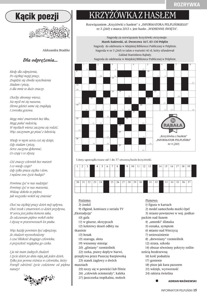 rozrywka Kącik poezji KRZYŻÓWKA Z HASŁEM Rozwiązaniem „Krzyżówki z hasłem” z „INFORMATORA PELPLIÑSKIEGO” nr 3 (260) z marca 2013 r. jest hasło: „WIOSENNE śWIÐTA”. Aleksandra Bradtke Dla odprężenia... Nagrodę za rozwiązanie krzyżówki otrzymuje: Marek Sadowski, ul. Dworcowa 16/7, 83-130 Pelplin Nagrody do odebrania w Miejskiej Bibliotece Publicznej w Pelplinie. Nagroda w nr 3 (260) to talon o wartości 40 zł, który ufundował Zakład Stanisława Rąbały. Nagroda do odebrania w Miejskiej Bibliotece Publicznej w Pelplinie. Kiedy dla odprę¿enia, Po cię¿kiej mojej pracy, Znajdzie się chwila wytchnienia Siadam i piszę, A dla mnie to du¿o znaczy. Choæby skromny wiersz, Na myśl mi się nasuwa, Słowa gdzieś same się znajdują I zwrotka gotowa. Mogę mieæ zmartwieñ bez liku, Mogę pałaæ radością, W myślach wiersz zaczyna się rodziæ, Więc zaczynam go pisaæ z lubością. „Krzyżówka z hasłem” „INFORMATOR PELPLIÑSKI” nr 4 (261) Wtedy w mym sercu coś się dzieje, Gdy siadam i piszę, Serce zaczyna dyktowaæ, Co czuję i co słyszę. Có¿ znaczy człowiek bez marzeñ I co wtedy czuje? Gdy tylko praca cię¿ka i dom, I nędzne swe ¿ycie buduje? Powinna ¿yæ w nas nadzieja! Powinny ¿yæ w nas marzenia, Widząc dokoła to piękno, Jak wszystko wokół się zmienia! Choæ na cię¿kiej pracy dzieñ mój upływa, Choæ trosk i zmartwieñ co dzieñ przybywa, W sercu jest jedna komora taka, ¯e odczuwam piękno wokół siebie I słyszę w przestworzach lot ptaka. Więc ka¿dy powinien byæ odprę¿ony, Ze złudzeñ wyswobodzony I czuæ bliskośæ drugiego człowieka, A przyszłośæ względna go czeka. I ja nie mam ¿adnych złudzeñ I ¿ycie dzieñ po dniu mija jak jeden dzieñ, Tylko jest pewna ró¿nica w człowieku, który Potrafi odró¿niæ ¿ycie codzienne od piękna natury! Poziomo: 3) żonkil 9) Olgierd, komisarz z serialu TV „Ekstradycja” 10) gafa 11) w gitarze, skrzypcach 12) kolorowy deseń odbity na tkaninie 13) bosak 15) szaruga, słota 19) wiosenny miesiąc 20) „gliniany” rzemieślnik 22) rzeka, prawy dopływ Narwi, przepływa przez Puszczę Kurpiowską 23) statek żaglowy o dwóch masztach 25) toczy się w powieści lub filmie 26) „człowiek ociemniały”, kaleka 27) jaszczurka tropikalna, moloch Pionowo: 1) figura w kartach 2) model samochodu marki Opel 3) miasto powiatowe w woj. podkarpackim nad Sanem 4) „antenki” ślimaka 5) oznaka, symptom 6) miasto nad Wierzycą 7) unieważnienie 8) „drewniany” rzemieślnik 12) strata, szkoda 14) obszar równinny pokryty roślinnością bezdrzewną 16) kość podudzia 17) gonienie 18) pisze jak kura pazurem 21) wdzięk, wytworność 24) rakieta świetlna ADrIAN WAŚNIEWSKI INFORMATOR PELPLIŃSKI 15