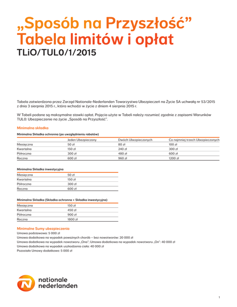 „Sposób na Przyszłość” Tabela limitów i opłat TLiO/TUL0/1/2015 Tabela zatwierdzona przez Zarząd Nationale-Nederlanden Towarzystwa Ubezpieczeń na Życie SA uchwałą nr 53/2015 z dnia 3 sierpnia 2015 r., która wchodzi w życie z dniem 4 sierpnia 2015 r. W Tabeli podane są maksymalne stawki opłat. Pojęcia użyte w Tabeli należy rozumieć zgodnie z zapisami Warunków TUL0: Ubezpieczenie na życie „Sposób na Przyszłość”. Minimalna składka Minimalna Składka ochronna (po uwzględnieniu rabatów) Miesięczna Kwartalna Półroczna Roczna Jeden Ubezpieczony 50 zł 150 zł 300 zł 600 zł Dwóch Ubezpieczonych 80 zł 240 zł 480 zł 960 zł Co najmniej trzech Ubezpieczonych 100 zł 300 zł 600 zł 1200 zł Minimalna Składka inwestycyjna Miesięczna Kwartalna Półroczna Roczna 50 zł 150 zł 300 zł 600 zł Minimalna Składka (Składka ochronna + Składka inwestycyjna) Miesięczna Kwartalna Półroczna Roczna 150 zł 450 zł 900 zł 1800 zł Minimalne Sumy ubezpieczenia Umowa podstawowa: 5 000 zł Umowa dodatkowa na wypadek poważnych chorób – bez nowotworów: 20 000 zł Umowa dodatkowa na wypadek nowotworu „Ona”; Umowa dodatkowa na wypadek nowotworu „On”: 40 000 zł Umowa dodatkowa na wypadek uszkodzenia ciała: 40 000 zł Pozostałe Umowy dodatkowe: 5 000 zł 1 Maksymalne Sumy ubezpieczenia Maksymalna Suma ubezpieczenia ze wszystkich Umów dodatkowych „Sposób na Przyszłość” dla jednego Ubezpieczonego Maksymalna łączna Suma ubezpieczenia ze wszystkich Umów dodatkowych wskazanych według kodów zawartych na rzecz Ubezpieczonego w Nationale-Nederlanden 1 000 000 zł 1 000 000 zł ADR0, ADR1, ADR6, ADR9, AD12, ADN1, AD13 1 000 000 zł 1 000 000 zł AT12, AT13 1 000 000 zł (dorośli) 200 000 zł (dzieci do 18 r.ż.) 50 000 zł 1 000 000 zł (dorośli) 200 000 zł (dzieci do 18 r.ż.) 50 000 zł 600 000 zł 600 000 zł 40 000 zł 40 000 zł 150 000 zł 50 000 zł 50 000 zł 150 000 zł Na wypadek nowotworu Ona i On 600 000 zł 600 000 zł PDR1, PDR6, PDR7, PDR9, PDI0, PDI1, PDC0, PDN1, PD12 CCR0, CR12 CIR0, CIR1, CIR2, CIR3, CIR4, CIR5, CIR6, CP12, CI12, CII0, CD12, CU12 HRI3, HR12 HRA3, HI12 AI12, BI12, AB12, AI13, BI13, AB13 CW12, CS12, CG12, CM12, CA12, CF12, CW13, CS13, CG13, CM12, CA13, CF13 Niezdolność do samodzielnego życia lub pracy 1 000 000 zł (dorośli) 200 000 zł (dzieci do 18 r.ż.) 1 000 000 zł (dorośli) 200 000 zł (dzieci do 18 r.ż.) Umowa dodatkowa Śmierć wskutek nieszczęśliwego wypadku Śmierć wskutek wypadku komunikacyjnego Trwałe inwalidztwo wskutek nieszczęśliwego wypadku Poważne zachorowania dziecka Poważne zachorowania Na wypadek poważnych chorób – bez nowotworów Pobyt w szpitalu lub operacja Pobyt w szpitalu lub operacja Na wypadek uszkodzenia ciała TP12 Składka ochronna – rabaty 1. Rabat za pakiet – naliczany w przypadku, gdy zakres ubezpieczenia obejmuje poniższe Umowy dodatkowe ze wskazanymi Sumami ubezpieczenia: Pakiet Umowy dodatkowe Na wypadek nowotworu „On” lub „Ona” (wariant pełny) Na wypadek poważnych chorób – bez nowotworów Zdrowotny (wariant rozszerzony) Pobyt w szpitalu lub operacja (wariant rozszerzony) Rabat za każdą Umowę dodatkową w pakiecie Pakiet Umowy dodatkowe Śmierć wskutek nieszczęśliwego wypadku Śmierć wskutek wypadku komunikacyjnego Wypadkowy Trwałe inwalidztwo wskutek nieszczęśliwego wypadku Na wypadek uszkodzenia ciała (wariant rozszerzony) Na wypadek uszkodzenia ciała (wariant pełny) Rabat za każdą Umowę dodatkową w pakiecie Wariant I Wariant II Suma ubezpieczenia Suma ubezpieczenia od 40 000 zł od 40 000 zł od 20 000 zł 5% od 20 000 zł od 10 000 zł 10% Wariant I Wariant II Suma ubezpieczenia Suma ubezpieczenia 40 000 zł-59 999,99 zł 100 000 zł-149 999,99 zł 40 000 zł-59 999,99 zł 40 000 zł-59 999,99 zł 10% od 60 000 zł od 150 000 zł od 60 000 zł od 60 000 zł 15% Wariant I Pakiet Umowy dodatkowe Trwałe inwalidztwo wskutek nieszczęśliwego wypadku Niezdolność do samodzielnego życia lub pracy Dziecięcy Poważne zachorowania dziecka Pobyt w szpitalu lub operacja (wariant rozszerzony) Rabat za każdą Umowę dodatkową w pakiecie 2 Suma ubezpieczenia od 30 000 zł od 30 000 zł od 20 000 zł od 20 000 zł 10% 2. Rabat za ostrożność 5% za każdą Umowę dodatkową zawartą w pakiecie wypadkowym zawierającym Umowę dodatkową na wypadek uszkodzenia ciała, jeśli w czasie trwania tego pakietu Ubezpieczony nie uległ wypadkowi skutkującemu wypłatą pieniędzy z tytułu Uszkodzenia ciała. • Rabat za ostrożność przyznawany jest na kolejny 5-letni okres trwania pakietu wypadkowego i zwiększa rabat za pakiet wypadkowy do odpowiednio 15% i 20%. • Wypłata z tytułu Umowy dodatkowej na wypadek uszkodzenia ciała oznacza, że rabat za ostrożność nie zostanie naliczony. 3. Rabat za kolejnego ubezpieczonego 10% Składki ochronnej, jeżeli ochroną ubezpieczeniową są objęte co najmniej 2 osoby. 4. Rabat za częstotliwość opłacania składki Kwartalna Półroczna Roczna 1% 2,3% 5% Wysokość technicznej stopy procentowej Wysokość technicznej stopy procentowej do kalkulacji rezerw techniczno-ubezpieczeniowych dla Umowy wskazana jest na stronie Nationale-Nederlanden pod adresem www.nn.pl/techniczne-stopy-procentowe. Nadpłata Kwota, powyżej której nadpłata zostanie uznana za Składkę lokacyjną: 20 zł. Podwyższona alokacja w fundusze 101% jeżeli spełnione są łącznie następujące warunki: Rok polisowy 6. – 10. 11. – 15. 16. i kolejne Średnia wartość dziennych stanów jednostek uczestnictwa na Rachunku w poprzednim roku polisowym: Co najmniej 4-krotność aktualnie opłacanej Składki inwestycyjnej należnej za rok trwania Umowy Co najmniej 8-krotność aktualnie opłacanej Składki inwestycyjnej należnej za rok trwania Umowy Co najmniej 12-krotność aktualnie opłacanej Składki inwestycyjnej należnej za rok trwania Umowy Minimalna wysokość Składki inwestycyjnej 400 zł dla częstotliwo