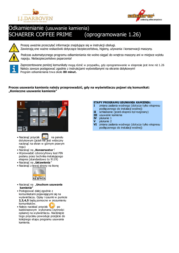 Odkamienianie (usuwanie kamienia) SCHAERER COFFEE PRIME (oprogramowanie 1.26) Proszę uważnie przeczytać informacje znajdujące się w instrukcji obsługi. Zawierają one ważne wskazówki dotyczące bezpieczeństwa, higieny, używania i konserwacji maszyny. Podczas automatycznego programu odkamieniania nie wolno sięgać do wnętrza maszyny ani w miejsce wylotu napoju. Niebezpieczeństwo poparzenia! Zaprezentowane poniżej komunikaty mogą różnić w przypadku, gdy oprogramowanie w ekspresie jest inne niż 1.26 Należy zawsze postępować zgodnie z instrukcjami wyświetlanymi na ekranie dotykowym! Program odkamieniania trwa około 80 minut. Proces usuwania kamienia należy przeprowadzić, gdy na wyświetlaczu pojawi się komunikat: „Konieczne usuwanie kamienia” ETAPY PROGRAMU USUWANIA KAMIENIA: I zmiana zasilania wodnego (dotyczy tylko ekspresu podłączonego do instalacji wodnej) II schładzanie (jeżeli ekspres był rozgrzany) III usuwanie kamienia IV płukanie 1 V płukanie 2 VI zmiana zasilania wodnego (dotyczy tylko ekspresu podłączonego do instalacji wodnej) 1 • Nacisnąć przycisk na panelu dotykowym (jeżeli nie jest widoczny nacisnąć na ekran w górnym prawym rogu) • Nacisnąć na „Konserwator”. • Wprowadzić czterocyfrowy kod PIN podany przez technika instalującego ekspres (standardowo to 9119) • Nacisnąć na „Ustawienia” • Nacisnąć z lewej strony na ikonę SERWIS • Nacisnąć na „Uruchom usuwanie kamienia” • Postępować dalej zgodnie z komunikatami pojawiającymi się na wyświetlaczu. Opisy i rysunki w punkcie 2,3,4,5 będą pomocne w zrozumieniu komunikatów. • Należy naciskać przycisk > po każdorazowym wykonaniu czynności opisanej na wyświetlaczu. Naciśnięcie tego przycisku powoduje przejście do kolejnego etapu programu usuwania kamienia. 2 3 7 4 6 1 3 (2) 2 „Tacka ociekowa” (3) 3 „NcFoamer - głowica spieniająca” (4) 4 „Zbiornik 5L” UWAGA: W ekspresie w którym tacka ociekowa jest podłączona na stałe do instalacji ściekowej zbiornik 5L (4) 4 nie jest potrzebny do przeprowadzenia programu usuwania kamienia oraz nie ma potrzeby opróżniania tacki ociekowej (2) 2 UWAGA: Do usuwania kamienia należy stosować roztwór: Woda: (3x0,75L) Odkamieniacz: (2x0,75L) 2,25L 1,5L 750 ml (1) 1 „Zbiornik wody pitnej” 750 ml 2 W EKSPRESIE PODŁĄCZONYM DO INSTALACJI WODNEJ Gdy pojawi się komunikat: „Zamknij: zawór główny Ściągnij śrubę Aquachange” należy zakręcić zawór wodny doprowadzający wodę do ekspresu oraz wykręcić przy pomocy wkrętaka płaskiego (1) 5 śrubę (2) 6 znajdującą się w ekspresie za zbiornikiem wody pitnej (patrz (1) 1 w punkcie 2) Po wykonaniu powyższych czynności ekspres sam się wyłączy i ponownie włączy. Jeżeli nie powróci automatycznie do programu usuwania kamienia, należy ponownie uruchomić program usuwania kamienia tak jak to jest opisane w punkcie 1 750 ml 4 Uwaga: Gdy pojawi się komunikat: „usuń filtr zbiornik wody pitnej (jeżeli istnieje)” Należy wyjąć filtr wody (7) 7 (jeżeli jest używany) ze zbiornika wody pitnej (1). 1 750 ml 5 750 ml 1 Zbiornik wody pitnej przy prawidłowym sporządzeniu roztworu powinien być zapełniony w ¾ jego całkowitej pojemności. 5 UWAGA: Gdy na końcu programu usuwania kamienia pojawi się komunikat: „Przeróbka przyłącza wody Czy wymienić zasilanie wodą zbiornika wody pitnej na przyłącze stałe?” W ekspresie nie podłączonym do instalacji wodnej (woda jest pobierana ze zbiornika wody pitnej przez ekspres podczas codziennej pracy) należy wybrać: X W ekspresie podłączonym do instalacji wodnej (woda jest pobierana z instalacji wodociągowej przez ekspres podczas codziennej pracy) należy wybrać: V po czym zgodnie z pojawiającymi się komunikatami wkręcić z powrotem śrubę (patrz (6) 6 zdjęcie w punkcie 3) oraz odkręcić zawór wodny doprowadzający wodę do ekspresu. J.J. Darboven Poland Sp. z o.o. 84-230 Rumia . 0-58 679 49 29 ul. Kolejowa 54 0-801 567 890 0-58 679 49 29 e-mail: [email protected] www.darboven.pl