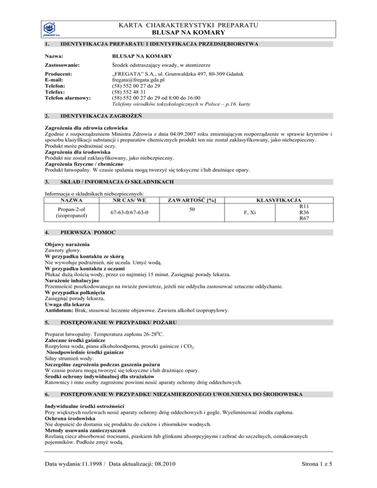 KARTA CHARAKTERYSTYKI PREPARATU BLUSAP NA KOMARY 1. IDENTYFIKACJA PREPARATU I IDENTYFIKACJA PRZEDSIĘBIORSTWA Nazwa: BLUSAP NA KOMARY Zastosowanie: Środek odstraszający owady, w atomizerze Producent: E-mail: Telefon: Telefax: Telefon alarmowy: „FREGATA” S.A., ul. Grunwaldzka 497, 80-309 Gdańsk [email protected] (58) 552 00 27 do 29 (58) 552 48 31 (58) 552 00 27 do 29 od 8:00 do 16:00 Telefony ośrodków toksykologicznych w Polsce – p.16. karty 2. IDENTYFIKACJA ZAGROŻEŃ Zagrożenia dla zdrowia człowieka Zgodnie z rozporządzeniem Ministra Zdrowia z dnia 04.09.2007 roku zmieniającym rozporządzenie w sprawie kryteriów i sposobu klasyfikacji substancji i preparatów chemicznych produkt ten nie został zaklasyfikowany, jako niebezpieczny. Produkt może podrażniać oczy. Zagrożenia dla środowiska Produkt nie został zaklasyfikowany, jako niebezpieczny. Zagrożenia fizyczne / chemiczne Produkt łatwopalny. W czasie spalania mogą tworzyć się toksyczne i/lub drażniące opary. 3. SKŁAD / INFORMACJA O SKŁADNIKACH Informacja o składnikach niebezpiecznych: NAZWA NR CAS/ WE Propan-2-ol (izopropanol) 4. ZAWARTOŚĆ [%] 67-63-0/67-63-0 50 KLASYFIKACJA R11 F, Xi R36 R67 PIERWSZA POMOC Objawy narażenia Zawroty głowy. W przypadku kontaktu ze skórą Nie wywołuje podrażnień, nie uczula. Umyć wodą. W przypadku kontaktu z oczami Płukać dużą ilością wody, przez co najmniej 15 minut. Zasięgnąć porady lekarza. Narażenie inhalacyjne Przemieścić poszkodowanego na świeże powietrze, jeżeli nie oddycha zastosować sztuczne oddychanie. W przypadku połknięcia Zasięgnąć porady lekarza. Uwaga dla lekarza Antidotum: Brak, stosować leczenie objawowe. Zawiera alkohol izopropylowy. 5. POSTĘPOWANIE W PRZYPADKU POŻARU Preparat łatwopalny. Temperatura zapłonu 26-280C. Zalecane środki gaśnicze Rozpylona woda, piana alkoholoodporna, proszki gaśnicze i CO2. Nieodpowiednie środki gaśnicze Silny strumień wody. Szczególne zagrożenia podczas gaszenia pożaru W czasie pożaru mogą tworzyć się toksyczne i/lub drażniące opary. Środki ochrony indywidualnej dla strażaków Ratownicy i inne osoby zagrożone powinni nosić aparaty ochrony dróg oddechowych. 6. POSTĘPOWANIE W PRZYPADKU NIEZAMIERZONEGO UWOLNIENIA DO ŚRODOWISKA Indywidualne środki ostrożności Przy większych rozlewach nosić aparaty ochrony dróg oddechowych i gogle. Wyeliminować źródła zapłonu. Ochrona środowiska Nie dopuścić do dostania się produktu do cieków i zbiorników wodnych. Metody usuwania zanieczyszczeń Rozlaną ciecz absorbować trocinami, piaskiem lub glinkami absorpcyjnymi i zebrać do szczelnych, oznakowanych pojemników. Podłoże zmyć wodą. Data wydania:11.1998 / Data aktualizacji: 08.2010 Strona 1 z 5 KARTA CHARAKTERYSTYKI PREPARATU BLUSAP NA KOMARY 7. POSTĘPOWANIE Z PREPARATEM I JEGO MAGAZYNOWANIE Postępowanie z preparatem W praktyce przemysłowej: Pracować przy sprawnej wentylacji, unikać wdychania par i mgieł. Trzymać z dala od otwartego ognia, źródeł zapłonu i źródeł ciepła. Unikać kontaktu produktu z oczami. Magazynowanie o Przechowywać w oryginalnych, zamkniętych opakowaniach, w temperaturze od -5°C do +30 C. Unikać bezpośredniego nasłonecznienia. Chronić przed dziećmi. 8. KONTROLA NARAŻENIA I ŚRODKI OCHRONY INDYWIDUALNEJ Wartości graniczne narażenia 3 3 NDS (izopropanol) 900 mg/m , NDSCh: 1200 mg/m Kontrola narażenia w miejscu pracy - działania organizacyjne (techniczne) Brak danych. Ochrona dróg oddechowych W praktyce przemysłowej: zapewnić odpowiednią wentylację. Ochrona rąk W praktyce przemysłowej: rękawice ochronne Ochrona oczu W praktyce przemysłowej: zalecane gogle ochronne Ochrona skóry W praktyce przemysłowej: Odzież robocza. Kontrola narażenia środowiska Brak danych. 9. WŁAŚCIWOŚCI FIZYCZNE I CHEMICZNE Dane ogólne Postać, stan fizyczny Kolor Zapach Dane techniczne pH Temperatura wrzenia/zakres temperatur wrzenia Temperatura topnienia Temperatura zapłonu Właściwości wybuchowe Właściwości utleniające 5-7 >85°C Brak danych 26-28°C brak brak Prężność par izopropanol: 0,034 mbar (20 C) Gęstość względna Rozpuszczalność w innych rozpuszczalnikach Rozpuszczalność w wodzie Granice wybuchowości par (dane dla izopropanolu): ok 0,85 g/cm3 brak danych dobra (rozpuszcza się bez ograniczeń) - dolna: 2 % obj. ciecz bezbarwny aromatyczny, lekko alkoholowy o - górna: 12 % obj. Lepkość Gęstość par Szybkość parowania 10. brak danych brak danych brak danych STABILNOŚĆ I REAKTYWNOŚĆ Stabilność Stabilny w normalnych warunkach Niebezpieczne reakcje / polimeryzacja Brak Warunki, których należy unikać Unikać przegrzania, bezpośredniego nasłonecznienia. Czynniki, których należy unikać Unikać silnych utleniaczy, ognia. Data wydania:11.1998 / Data aktualizacji: 08.2010 Strona 2 z 5 KARTA CHARAKTERYSTYKI PREPARATU BLUSAP NA KOMARY Niebezpieczne produkty rozkładu Brak. 11. INFORMACJE TOKSYKOLOGICZNE Skutki toksycznego działania na zdrowie człowieka Toksyczność ostra doustna, szczur, LD > 5000 mg/kg (na podstawie toksykologii surowców) 50 Toksyczność ostra dermalna: nie stwarza zagrożenia Drogi narażenia i objawy narażenia bezpośrednie i opóźnione W przypadku połknięcia: możliwe zawroty głowy Działanie ostre /toksyczność ostra, działanie drażniące i żrące/ Podrażnienie oka: lekko podrażnia Podrażnienie skóry: nie podrażnia Działanie uczulające Badania na ludziach wykazały, że produkt nie wywołuje uczuleń. 12. INFORMACJE EKOLOGICZNE Ekotoksyczność Nie dopuścić do wylewania produktu do cieków i zbiorników wodnych, kanalizacji i ziemi. Brak danych ilościowych na temat efektów ekologicznych, jednak żaden ze składników preparatu nie jest klasyfikowany, jako niebezpieczny dla środowiska. Mobilność Brak danych. Trwałość i zdolność do rozkładu Brak danych. Zdolność do bioakumulacji Brak danych. Wyniki oceny właściwości PBT Brak danych 13. P