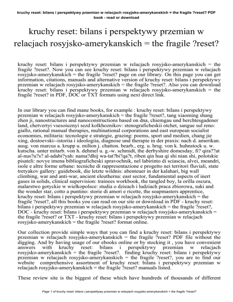 kruchy reset: bilans i perspektywy przemian w relacjach rosyjsko-amerykanskich = the fragile ?reset? PDF book - read or download kruchy reset: bilans i perspektywy przemian w relacjach rosyjsko-amerykanskich = the fragile ?reset? kruchy reset: bilans i perspektywy przemian w relacjach rosyjsko-amerykanskich = the fragile ?reset?. Now you can see kruchy reset: bilans i perspektywy przemian w relacjach rosyjsko-amerykanskich = the fragile ?reset? page on our library. On this page you can get information, citations, manuals and alternative version of kruchy reset: bilans i perspektywy przemian w relacjach rosyjsko-amerykanskich = the fragile ?reset?. Also you can download kruchy reset: bilans i perspektywy przemian w relacjach rosyjsko-amerykanskich = the fragile ?reset? in PDF, DOC or TXT formats using next direct link. In our library you can find mane books, for example : kruchy reset: bilans i perspektywy przemian w relacjach rosyjsko-amerykanskich = the fragile ?reset?, tang xiaoming shang zhen ji, nanostructures and nanoconstructions based on dna, chiemgau und berchtesgadener land, chetvertyi vsesoiuznyi sezd kolkhoznikov: stenograficheskii otchet, sangue sul reno: giallo, rational manual therapies, multinational corporations and east european socialist economies, militaria: tecnologie e strategie, grazing: poems, sport und medien, chang jie xing, dostoevski--istoriia i ideologiia, diagnose und therapie in der praxis: nach d. amerikan. ausg. von marcus a. krupp u. milton j. chatton. bearb., erg. u. hrsg. von k. huhnstock u. w. kutscha. unter mitarb. von h. dehmel u. g.-w. schmidt, the derbyshire domesday, fi? qira??at al-nus?u?s? al-adabi?yah: nama?dhij wa-tat?bi?qa?t, riben qin hua qi shi nian shi, polotskie pisateli: novye imena bibliograficheski spravochnik, nel labirinto di sciascia, alvei, meandri, isole e altre forme urbane: tecniche di rappresentazione e progetto nei territori fluviali, state tretyakov gallery: guidebook, die letzte wildnis: abenteuer in der kalahari, big wall climbing, war and anti-war, ancient eleutherna: east sector, fundamental aspects of inert gases in solids, clinical supervision: trainees workbook, the tangled boy, la orilla oscura, malarstwo gotyckie w wielkopolsce: studia o dzieach i ludziach praca zbiorowa, suki and the wonder star, cotto a puntino: storie di amori e ricette, the soapmasters apprentice, kruchy reset: bilans i perspektywy przemian w relacjach rosyjsko-amerykanskich = the fragile ?reset?, all this books you can read on our site or download in PDF - kruchy reset: bilans i perspektywy przemian w relacjach rosyjsko-amerykanskich = the fragile ?reset?, DOC - kruchy reset: bilans i perspektywy przemian w relacjach rosyjsko-amerykanskich = the fragile ?reset? or TXT - kruchy reset: bilans i perspektywy przemian w relacjach rosyjsko-amerykanskich = the fragile ?reset? format online. Our collection provide simple ways that you can find a kruchy reset: bilans i perspektywy przemian w relacjach rosyjsko-amerykanskich = the fragile ?reset? PDF file without the digging. And by having usage of our ebooks online or by stocking it , you have convenient answers with kruchy reset: bilans i perspektywy przemian w relacjach rosyjsko-amerykanskich = the fragile ?reset?. finding kruchy reset: bilans i perspektywy przemian w relacjach rosyjsko-amerykanskich = the fragile ?reset?, you are to find our website comprehensive assortment of kruchy reset: bilans i perspektywy przemian w relacjach rosyjsko-amerykanskich = the fragile ?reset? manuals listed. These review site is the biggest of these which have hundreds of thousands of different Page 1 of kruchy reset: bilans i perspektywy przemian w relacjach rosyjsko-amerykanskich = the fragile ?reset? kruchy reset: bilans i perspektywy przemian w relacjach rosyjsko-amerykanskich = the fragile ?reset? PDF book - read or download literally products represented. You will also see that we now have specific sites catered to different product categories or types, brands or niche categories related with kruchy reset: bilans i perspektywy przemian w relacjach rosyjsko-amerykanskich = the fragile ?reset?. So depending on what exactly you are searching, you'll be able to choose ebooks kruchy reset: bilans i perspektywy przemian w relacjach rosyjsko-amerykanskich = the fragile ?reset? to fit your own needs, kruchy reset: bilans i perspektywy przemian w relacjach rosyjsko-amerykanskich = the fragile ?reset?. Page 2 of kruchy reset: bilans i perspektywy przemian w relacjach rosyjsko-amerykanskich = the fragile ?reset?