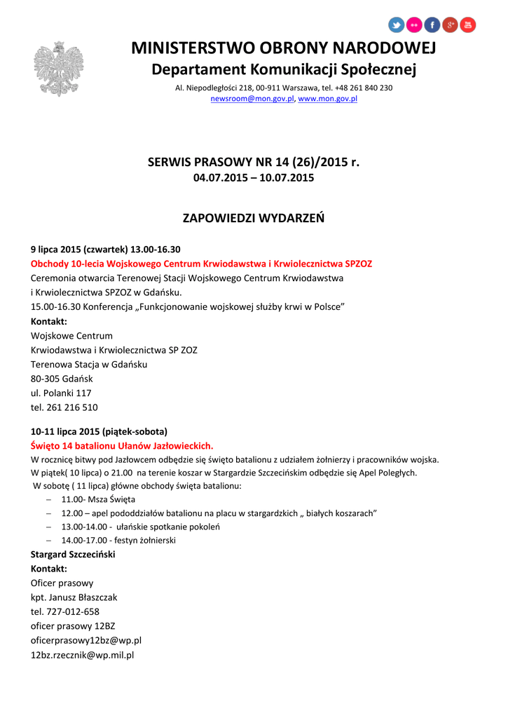 MINISTERSTWO OBRONY NARODOWEJ Departament Komunikacji Społecznej Al. Niepodległości 218, 00-911 Warszawa, tel. +48 261 840 230 [email protected], www.mon.gov.pl SERWIS PRASOWY NR 14 (26)/2015 r. 04.07.2015 – 10.07.2015 ZAPOWIEDZI WYDARZEŃ 9 lipca 2015 (czwartek) 13.00-16.30 Obchody 10-lecia Wojskowego Centrum Krwiodawstwa i Krwiolecznictwa SPZOZ Ceremonia otwarcia Terenowej Stacji Wojskowego Centrum Krwiodawstwa i Krwiolecznictwa SPZOZ w Gdańsku. 15.00-16.30 Konferencja „Funkcjonowanie wojskowej służby krwi w Polsce” Kontakt: Wojskowe Centrum Krwiodawstwa i Krwiolecznictwa SP ZOZ Terenowa Stacja w Gdańsku 80-305 Gdańsk ul. Polanki 117 tel. 261 216 510 10-11 lipca 2015 (piątek-sobota) Święto 14 batalionu Ułanów Jazłowieckich. W rocznicę bitwy pod Jazłowcem odbędzie się święto batalionu z udziałem żołnierzy i pracowników wojska. W piątek( 10 lipca) o 21.00 na terenie koszar w Stargardzie Szczecińskim odbędzie się Apel Poległych. W sobotę ( 11 lipca) główne obchody święta batalionu: 11.00- Msza Święta 12.00 – apel pododdziałów batalionu na placu w stargardzkich „ białych koszarach” 13.00-14.00 - ułańskie spotkanie pokoleń 14.00-17.00 - festyn żołnierski Stargard Szczeciński Kontakt: Oficer prasowy kpt. Janusz Błaszczak tel. 727-012-658 oficer prasowy 12BZ [email protected] [email protected] 19 lipca 2015 (niedziela) „GORTAT TEAM vs WOJSKO POLSKIE”! Czwarty w historii mecz „GORTAT TEAM vs WOJSKO POLSKIE”! Akredytacji dla dziennikarzy udziela Fundacja MG 13. Formularz akredytacyjny dostępny na stronie http://mg13.com.pl/marcin-gortat-camp2015/akredytacje-prasa-2015/ KRONIKA 25 czerwca 2015 (czwartek) Hiszpański generał objął dowództwo w Eurokorpusie Generał broni Alfredo Ramirez z Hiszpanii objął dowodzenie europejskim korpusem szybkiego reagowania w Strasbourgu we Francji podczas uroczystej zbiórki w Dowództwie Eurokorpusu 25 czerwca 2015 roku. Więcej… 25 czerwca 2015 (czwartek) Festiwal Orkiestr Wojskowych Niezwykła rewia, barwne galowe mundury, pokazy musztry paradnej, występy ponad 400 artystów na jednej scenie – wszystko to czeka nas w ostatni weekend czerwca, podczas Festiwalu Orkiestr Wojskowych – Warszawa 2015. Więcej… 28 czerwca 2015 (niedziela) ŚWIĘTO MARYNARKI WOJENNEJ W niedzielę, 28 czerwca, przypada Święto Marynarki Wojennej, które zgodnie z tradycją jest finałem Święta Morza. Obchodzone jest od prawie 90 lat i nierozerwalnie łączy się z historią polskiej obecności na Bałtyku. Więcej… oraz Więcej… 29 czerwca 2015 (poniedziałek) Wiceminister Oczkowicz z wizytą w Japonii W dniach 29 czerwca – 1 lipca br. podsekretarz stanu w MON Beata Oczkowicz przebywała z wizytą w Japonii na zaproszenie starszego wiceministra obrony Japonii Akira Sato. Więcej… 29 czerwca 2015 (poniedziałek) Pożegnanie z zawodową służbą wojskową W poniedziałek w siedzibie ministra obrony narodowej odbyło się uroczyste pożegnanie kończących służbę wojskową generałów: generała broni pil. Lecha Majewskiego, generała dywizji – Mirosława Rozmusa oraz generała brygady Jana Gabrysia. Więcej… 29 czerwca 2015 (poniedziałek) Inwestycje w mińskim garnizonie Sprawdzenie stopnia realizacji rozbudowy infrastruktury było głównym tematem wizyty sekretarza stanu w Ministerstwie Obrony Narodowej (MON) Czesława Mroczka w garnizonie Mińsk Mazowiecki. zdjęcie - Inwestycje w mińskim garnizonie. Więcej… 30 czerwca 2015 (wtorek) Szef MON w Siemianowicach Śląskich - Staramy się budować system wsparcia eksportu dla polskiej zbrojeniówki – powiedział podczas wizyty w zakładach Rosomak SA wicepremier, minister obrony narodowej Tomasz Siemoniak. Więcej… 01 lipca 2015 (środa) RBN o wzmocnieniu obecności sił NATO na Wschodzie W środę odbyło się posiedzenie Rady Bezpieczeństwa Narodowego poświęcone rezultatom szczytu Rady Europejskiej z 25-26 czerwca br. na temat m.in. wspólnej polityki bezpieczeństwa i obrony, a także przygotowaniom do szczytu NATO, jaki odbędzie się w lipcu 2016 r. w Warszawie. Więcej… 01 lipca 2015 (środa) Gen. Różański nowym dowódcą generalnym RSZ - Nie przygotuję wojska do działań, które już były. Przygotuję do tych, które mogą być – powiedział podczas ceremonii przekazania i objęcia obowiązków dowódcy generalnego Rodzajów Sił Zbrojnych gen. dyw. Mirosław Różański. Więcej… 01 lipca 2015 (środa) Koniec wyszehradzkiego Żbika -Jesteście dobrze przygotowani do ostatecznego sprawdzianu, jakim będzie listopadowe ćwiczenie Common Challenge 2015 – powiedział pułkownik Dariusz Górniak na zakończeniu ćwiczenia „Błękitnej” Brygady pod kryptonimem Żbik-15. Więcej… 02 lipca 2015 (czwartek) Wodowanie i chrzest ORP „Ślązak” - Dzisiaj możemy świętować, ale świętować będziemy krótko. Trzeba dalej ciężko pracować nad tym, żeby polską marynarkę wojenną odbudować - powiedział wicepremier, minister obrony narodowej Tomasz Siemoniak podczas uroczystości wodowania okrętu patrolowego ORP „Ślązak”. Więcej...