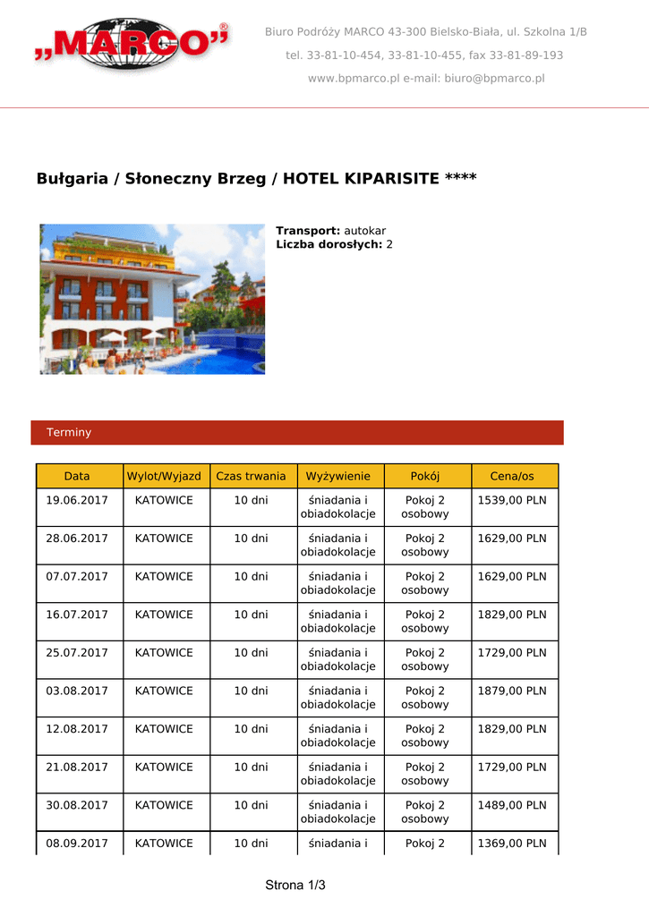 Biuro Podróży MARCO 43-300 Bielsko-Biała, ul. Szkolna 1/B tel. 33-81-10-454, 33-81-10-455, fax 33-81-89-193 www.bpmarco.pl e-mail: [email protected] Bułgaria / Słoneczny Brzeg / HOTEL KIPARISITE **** Transport: autokar Liczba dorosłych: 2 Terminy Data Wylot/Wyjazd Czas trwania Wyżywienie Pokój Cena/os 19.06.2017 KATOWICE 10 dni śniadania i obiadokolacje Pokoj 2 osobowy 1539,00 PLN 28.06.2017 KATOWICE 10 dni śniadania i obiadokolacje Pokoj 2 osobowy 1629,00 PLN 07.07.2017 KATOWICE 10 dni śniadania i obiadokolacje Pokoj 2 osobowy 1629,00 PLN 16.07.2017 KATOWICE 10 dni śniadania i obiadokolacje Pokoj 2 osobowy 1829,00 PLN 25.07.2017 KATOWICE 10 dni śniadania i obiadokolacje Pokoj 2 osobowy 1729,00 PLN 03.08.2017 KATOWICE 10 dni śniadania i obiadokolacje Pokoj 2 osobowy 1879,00 PLN 12.08.2017 KATOWICE 10 dni śniadania i obiadokolacje Pokoj 2 osobowy 1829,00 PLN 21.08.2017 KATOWICE 10 dni śniadania i obiadokolacje Pokoj 2 osobowy 1729,00 PLN 30.08.2017 KATOWICE 10 dni śniadania i obiadokolacje Pokoj 2 osobowy 1489,00 PLN 08.09.2017 KATOWICE 10 dni śniadania i Pokoj 2 1369,00 PLN Strona 1/3 Biuro Podróży MARCO 43-300 Bielsko-Biała, ul. Szkolna 1/B tel. 33-81-10-454, 33-81-10-455, fax 33-81-89-193 www.bpmarco.pl e-mail: [email protected] obiadokolacje osobowy Opis Kategoria **** Region Słoneczny Brzeg Słoneczny Brzeg Słoneczny Brzeg to jeden z największych kurortów nad Morzem Czarnym, leżący około 30 km od Burgas, zajmujący rozległy pas wybrzeża pomiędzy przylądkiem Elenite a Neseberem. Kurort, który został założony w latach 60., obecnie dalej prężnie się rozwija. Wzdłuż nadmorskiej promenady wciąż powstają nowe kompleksy hotelowe. Prawdziwą atrakcją i atutem Słonecznego Brzegu jest złocista, bardzo długa (około 8 km) i szeroka (prawie 100 m), piaszczysta plaża rozciągająca się wzdłuż całej zatoki otoczonej lasami i stokami gór z pięknym widokiem na Neseber (w czasie przypływów mogą pojawić się kamienie przy brzegu). Dzięki temu, że plaża kurortu łagodnie schodzi do morza, jest to idealne miejsce na letni wypoczynek. Słoneczny Brzeg zapewnia atrakcje także najmłodszym gościom, znajdują się tutaj bowiem place zabaw dla dzieci, wesołe miasteczka, aquaparki. W Słonecznym Brzegu zlokalizowanych jest ponad 200 hoteli, są liczne restauracje, sklepy, tawerny, nocne kluby, dyskoteki zapewniające doskonałą rozrywkę. Również miłośnicy aktywnego wypoczynku znajdą tutaj bogatą ofertę uprawiania sportów wodnych. Dzięki dogodnej lokalizacji i dobrym połączeniom z innymi turystycznymi miejscowościami, Słoneczny Brzeg jest doskonałą bazą wypadową do zwiedzania Neseberu, Sozopola, Burgas, Pomorie czy nawet Istambułu. Położenie w północnej części Słonecznego Brzegu, około 200 m od piaszczystej plaży (leżaki i sprzęt wodny dodatkowo płatne) - przejście przez ulicę, blisko promenady pełnej restauracji, barów i sklepów, oddalony około 2 km od ścisłego centrum kurortu. Hotel komfortowy, położony w dużym ogrodzie. Recepcja z lobby barem, klimatyzowana restauracja z tarasem, winda, bar przy basenie, kantor wymiany walut, mini market, dostęp do Wi-Fi. Dodatkowo płatne - sejf w recepcji. Pokoje 2-osobowe, z możliwością 1 lub 2 dostawek, zadbane i estetycznie urządzone, łazienka (prysznic, umywalka, WC, suszarka do włosów), klimatyzacja sterowana centralnie z możliwością indywidualnej regulacji, TV-SAT, telefon, lodówka, balkon (stolik i 2 krzesła). Sport i rozrywka basen zewnętrzny z wydzieloną częścią dla dzieci (leżaki i parasole na basenie bezpłatne). Dodatkowo płatne - sauna, fitness. Wyżywienie HB - śniadania i obiadokolacje w formie bufetu (napoje do obiadokolacji płatne dodatkowo). Strona 2/3 Biuro Podróży MARCO 43-300 Bielsko-Biała, ul. Szkolna 1/B tel. 33-81-10-454, 33-81-10-455, fax 33-81-89-193 www.bpmarco.pl e-mail: [email protected] Cena obejmuje - przejazd komfortowym autokarem (klimatyzacja, video, barek, WC) - 9 noclegów - 9 śniadań (bufet) - 9 obiadokolacji (bufet) - ubezpieczenie (KL + NW + bagaż, nie obejmuje CP) - opieka pilota-rezydenta - obowiązkowa składka na Turystyczny Fundusz Gwarancyjny (naliczana przy zakładaniu rezerwacji) Świadczenia rozpoczynają się obiadokolacją pierwszego dnia pobytu, a kończą śniadaniem w ostatnim dniu pobytu. Zakwaterowanie od godz. 14.00. Wykwaterowanie do godz. 10.00. Wyjazdy z Polski wg rozkładu jazdy. Przyjazd na miejsce w godzinach przedpołudniowych. Wyjazd ze Słonecznego Brzegu w godzinach popołudniowych. Powrót do Bielska-Białej około godz. 18.00. Pozostałe miasta wg rozkładu jazdy. Cena nie uwzględnia napojów do obiadokolacji. Uczestnicy sami pokrywają na miejscu koszty taksy klimatycznej 6 EUR za pobyt Naszym zdaniem Udany powrót po latach przerwy. Hotel "Kiparisite" wyróżnia się oryginalną architekturą i atrakcyjnym usytuowaniem w dużym ogrodzie pełnym zieleni. Komfortowo urządzone wnętrza, utrzymane w intensywnej kolorystyce, a także kameralny charakter obiektu sprawią, że wakacje w tym hotelu z całą pewnością pozwolą na beztroski relaks. Goście chwalą profesjonalną obsługę, smaczne wyżywienie i serwis na najwyższym poziomie. To idealne miejsce na zapomnienie o troskach i stresach dnia codziennego. PREZENTOWANE CENY UWZGLĘDNIAJĄ OBOWIĄZUJĄCE RABATY I PROMOCJE. Strona 3/3 Powered by TCPDF (www.tcpdf.org)