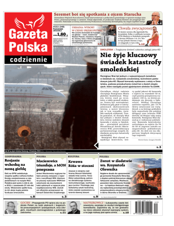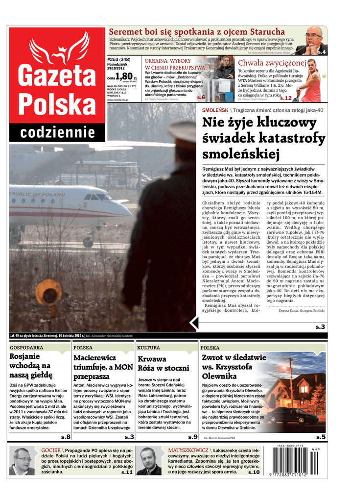 Seremet boi się spotkania z ojcem Starucha Dziennikarz Wojciech Staruchowicz chciał interweniować u prokuratora generalnego w sprawie swojego syna Piotra, przetrzymywanego w areszcie. Dostał odpowiedź, że prokurator Andrzej Seremet nie przyjmuje interesantów. Natomiast ze strony internetowej Prokuratury Generalnej dowiadujemy się czegoś zupełnie innego. fot. Krzysztof Sitkowski/Gazeta Polska #253 (348) Ukraina: Wybory w cieniu przekupstwa Poniedziałek 29/10/2012 1,80 nakład OGÓLNY 91 370 indeks 100625 ISSN 2083-7119 WYDANIE 1 We Lwowie dochodziło do kupowania głosów – mówi „Codziennej” Wacław Potocki, niezależny ekspert ds. Ukrainy, który z bliska przyglądał się organizacji głosowania do ukraińskiego parlamentu. www.niezalezna.pl fot. Vasily Fedosenko / Reuters cena ZŁ (w tym 8% VAT) s.6 s.4 Chwała zwyciężonej To koniec sezonu dla Agnieszki Radwańskiej. Polka w półfinale turnieju WTA Masters w Stambule przegrała z Sereną Williams 1:6, 2:6. Może być jednak dumna z tego, co osiągnęła w tym roku. fot. Osman Orsal / Reuters s.12 SMOLEŃSK \ Tragiczna śmierć członka załogi jaka-40 Nie żyje kluczowy świadek katastrofy smoleńskiej Remigiusz Muś był jednym z najważniejszych świadków w śledztwie ws. katastrofy smoleńskiej, technikiem pokładowym jaka-40. Słyszał komendy wydawane z wieży w Smoleńsku, podczas przesłuchania mówił też o dwóch eksplozjach, które nastąpiły przed zgaśnięciem silników Tu-154M. Chciałbym złożyć rodzinie chorążego Remigiusza Musia głębokie kondolencje. Wszyscy, którzy znali go wcześniej, a także poznali niedawno, muszą być wstrząśnięci. Zwłaszcza gdy ginie w niewyjaśnionych okolicznościach istotny, a nawet kluczowy, jak w tym wypadku, świadek tamtych wydarzeń. Trzeba pamiętać, że chorąży Muś był jednym z dwóch świadków, którzy osobiście słyszeli komendę z wieży w Smoleńsku – powiedział portalowi Niezależna.pl Antoni Macierewicz (PiS), przewodniczący parlamentarnego zespołu ds. zbadania przyczyn katastrofy smoleńskiej. Remigiusz Muś słyszał rosyjskiego kontrolera, któ- ry podał jakowi-40 komendę o zejściu na wysokość 50 m, czyli poniżej przepisowej wysokości 100 m, na której podejmuje się decyzję o lądowaniu. Według chorążego zarówno tupolew, jak i ił-76 (który ostatecznie nie wylądował, a na którego pokładzie były samochody dla polskiej delegacji oraz ochrona FSB) dostały od Rosjan taką samą komendę. Remigiusz Muś słyszał ją w radiostacji pokładowej. Komenda kontrolerów zezwalająca na zejście iła-76 do 50 m nagrana została na magnetofonie pokładowym jaka-40. Do dziś nie ma ekspertyzy biegłych dotyczącej tego nagrania. Dorota Kania, Grzegorz Broński s.3 Jak-40 na płycie lotniska Siewiernyj, 10 kwietnia 2010 r.|fot. Alexander Natruskin/Reuters GOSPODARKA POLSKA Rosjanie wchodzą na naszą giełdę Macierewicz Krwawa triumfuje, a MON Róża w stoczni przeprasza Jeszcze w sierpniu nad Zwrot w śledztwie ws. Krzysztofa Olewnika Dziś na GPW zadebiutuje rosyjska spółka naftowa Exillon Energy zarejestrowana w raju podatkowym na wyspie Man. Podobno jest warta 1 mld zł, ale w 2011 r. zanotowała 37 mln dol. straty. Właściciele spółki liczą, że ich akcje kupią polskie fundusze emerytalne. Antoni Macierewicz wygrywa kolejne procesy związane z raportem z weryfikacji WSI. Identyczne procesy wytoczone MON-owi zakończyły się zwycięstwem ludzi opisanych w raporcie jako współpracownicy WSI. Zostali oni oficjalnie przeproszeni na łamach Dziennika Urzędowego. Najpierw doszło do upozorowanego porwania Krzysztofa Olewnika, a dopiero później biznesmen został faktycznie uwięziony. Możliwym powodem były rozliczenia finansowe – ta hipoteza śledczych staje się najbardziej prawdopodobna po przeprowadzeniu eksperymentu w domu Olewnika w Drobinie. s.8 Kultura s.3 GOCIEK \ Propaganda PO opiera się na podziale Polski na ludzi pięknych i bogatych, bo proeuropejskich i postępowych, oraz ubogich, nieufnych ciemnogrodzian z polskiego zaścianka. s.11 Polska bramą Stoczni Gdańskiej wisiało imię Lenina. Teraz Róża Luksemburg, patronka zbrodniczego systemu komunistycznego, wychwalająca Lenina i Trockiego, jest bohaterką sztuki teatralnej, która została wystawiona na terenie dawnej stoczni. s.9 fot. Marcin Bednarski/PAP MATYSZKOWICZ \ Łukaszenkę często lekceważymy, uważając za niezbyt inteligentnego komedianta. Zapomina się, że ten groteskowy nieco człowiek stworzył represyjny system, a na jego rozkazy jest spora armia. s.10 s.5 OPINIE 2 Rafał Ziemkiewicz publicysta, pisarz, autor m.in. „Myśli nowoczesnego endeka” Gazeta Polska \\ W Smoleńsku nie było absolutnie żadnego śledztwa. Było wyłącznie sprzątanie po katastrofie i to sprzątanie bardzo szybkie, bo przeprowadzone w ciągu kilkunastu godzin. \\ CODZIENNIE Poniedziałek 29 PAŹDZIERNIKA 2012 www.niezalezna.pl fot. arch. Marcin Wolski Milczenie autorytetów ŚWIAT | GOSPODARKA | KULTURA | PUBLICYSTYKA | 12-13 SPORT | 14 HISTORIA | 15 TECHNIKA/TV | 16 fot. Zbyszek Kaczmarek/Gazeta Polska 7°C 1°C Katowice 1°C -2°C Łódź 3°C -1°C Warszawa 4°C -1°C Lublin 2°C 0°C NE Kraków 1°C -2°C E E Poznań 6°C -2°C Wrocław NW NE NW NE NW | 10-11 Gdańsk ZACHÓD księżyca 15 49 06 01 S POLSKA 9 06 26 16 12 WSCHÓD księżyca S | 8 Zimno, na południu śnieg ZACHÓD słońca TEMAT DNIA 6 WSCHÓD słońca 29.10 | 4-5 POGODA Poniedziałek OPINIE 3 | 2 Rosną rzesze ekspertów „smoleńskiego ludu” – w strzępy raport Millera zmienili bez trudu. Aż sam minister Nałęcz krzyknął: „Rety, rety! gdzie podziały się naszych służb autorytety? Czemu nie przygważdżają, nie dają odporu, nie zasypią faktami, nie wyjdą na forum, w blasku zasług, tytułów, i wsparcia na łamach..?”. A co mają powiedzieć tam? „Sorry, był zamach”? NW NE 4°C -2°C Kora przed sądem Prokuratura postanowiła jednak ścigać Olgę J. za