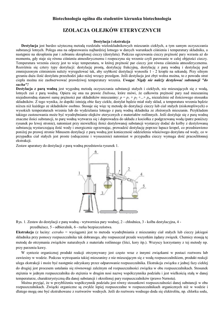 Biotechnologia ogólna dla studentów kierunku biotechnologia IZOLACJA OLEJKÓW ETERYCZNYCH Destylacja i ekstrakcja Destylacja jest bardzo użyteczną metodą rozdziału wieloskładnikowych mieszanin ciekłych, a tym samym oczyszczania substancji lotnych. Polega ona na odparowaniu najbardziej lotnego w danych warunkach ciśnienia i temperatury składnika, a następnie na skropleniu par i zebraniu skroplonej cieczy (destylatu). Podczas ogrzewania cieczy prężność pary wzrasta aż do momentu, gdy staje się równa ciśnieniu atmosferycznemu i rozpoczyna się wrzenie czyli parowanie w całej objętości cieczy. Temperatura wrzenia cieczy jest to więc temperatura, w której prężność par cieczy jest równa ciśnieniu atmosferycznemu. Rozróżnia się cztery typy destylacji: destylację prostą, destylację frakcyjną, destylację z parą wodną i destylację pod zmniejszonym ciśnieniem należy wyregulować tak, aby szybkość destylacji wynosiła 1 - 2 krople na sekundę. Przy silnym grzaniu duża ilość destylatu przechodzi jako niżej wrzący przedgon. Jeśli destylacja jest zbyt wolna można, to z powodu strat ciepła można nie zaobserwować prawdziwej temperatury wrzenia. Uwaga: Nigdy nie należy destylować substancji "do sucha"! Destylacja z parą wodną jest wygodną metodą oczyszczania substancji stałych i ciekłych, nie mieszających się z wodą, lotnych zaś z parą wodną. Opiera się ona na prawie Daltona, które mówi, że całkowita prężność pary nad mieszaniną niejednorodną stanowi sumę prężności par składników mieszaniny: p = p1 + p2 +...+ pn, niezależnie od ilościowego stosunku składników. Z tego wynika, że dopóki istnieją obie fazy ciekłe, destylat będzie miał stały skład, a temperatura wrzenia będzie niższa niż każdego ze składników osobno. Stosuje się więc tę metodę do destylacji cieczy lub ciał stałych (niskotopliwych) o wysokich temperaturach wrzenia lub do wydzielania lotnego z parą wodną składnika ze złożonych mieszanin. Przykładem takiego zastosowania może być wyodrębnianie olejków eterycznych z materiałów roślinnych. Jeśli destyluje się z parą wodną znaczne ilości substancji, to parę wodną wytwarza się i doprowadza do układu z kociołka z podgrzewaną wodą (patrz poniższy rysunek po lewej stronie), natomiast przy niewielkiej ilości destylowanej substancji wystarczy dodać do kolby z destylowaną substancją wystarczającą ilość wody i energicznie ogrzewając, prowadzić destylację poprzez łapacz kropel, co przedstawiono poniżej po prawej stronie Minusem destylacji z parą wodną jest konieczność oddzielenia właściwego destylatu od wody, co w przypadku ciał stałych jest proste (odsączenie i wysuszenie) natomiast w przypadku cieczy wymaga dość pracochłonnej ekstrakcji. Zestaw aparatury do destylacji z parą wodną przedstawia rysunek 1. Rys. 1. Zestaw do destylacji z parą wodną - wytwornica pary wodnej, 2 - chłodnica, 3 - kolba destylacyjna, 4 przedłużacz, 5 - odbieralnik, 6 - rurka bezpieczeństwa. Ekstrakcja (z łaciny: extraho = wyciągam) jest to metoda wyodrębniania z mieszaniny ciał stałych lub cieczy jakiegoś składnika przy pomocy rozpuszczalnika tak dobranego, aby rozpuszczał przede wszystkim żądany związek. Chemicy stosują tę metodę do otrzymania związków naturalnych z materiału roślinnego (liści, kory itp.). Wszyscy korzystamy z tej metody np. przy parzeniu kawy. W syntezie organicznej produkt reakcji otrzymywany jest często wraz z innymi związkami w postaci roztworu lub zawiesiny w wodzie. Podczas wytrząsania takiej mieszaniny z nie mieszającym się z wodą rozpuszczalnikiem, produkt reakcji ulega ekstrakcji i może być następnie odzyskany przez odparowanie rozpuszczalnika. Ekstrakcja związku z jednej fazy ciekłej do drugiej jest procesem ustalania się równowagi zależnym od rozpuszczalności związku w obu rozpuszczalnikach. Stosunek stężenia w jednym rozpuszczalniku do stężenia w drugim nosi nazwę współczynnika podziału i jest wielkością stałą w danej temperaturze, charakterystyczną dla danej substancji i określonej pary rozpuszczalników (prawo Nernsta). Można przyjąć, że w przybliżeniu współczynnik podziału jest równy stosunkowi rozpuszczalności danej substancji w obu rozpuszczalnikach. Związki organiczne są zwykle lepiej rozpuszczalne w rozpuszczalnikach organicznych niż w wodzie i dlatego mogą one być ekstrahowane z roztworów wodnych. Jeśli do roztworu wodnego doda się elektrolitu, np. chlorku sodu, Biotechnologia ogólna dla studentów kierunku biotechnologia to rozpuszczalność substancji organicznej maleje, inaczej mówiąc, substancja ulega wysalaniu. Czynnik ten pomaga wyekstrahować związek organiczny. Ekstrakcja periodyczna (nieciągła) Do ekstrakcji i rozdzielania warstw nie mieszających się ze sobą cieczy używa się rozdzielaczy. Do ekstrakcji roztworów wodnych używa się rozpuszczalników o mniejszej gęstości (np. eter dietylowy) lub większej gęstości niż woda (np. chloroform lub chlorek metylenu). Ekstrakcja ciągła Technikę ekstrakcji ciągłej stosuje się w przypadku układów o małych współczynnikach ekstrakcji. Zastosowanie w tym przypadku ekstrakcji nieciągłej wymagałoby użycia dużych ilości rozpuszczalnika. Istotną wadą tego sposobu ekstrakcji jest bardzo duże zużycie ekstrahenta i odpowiednio małe średnie stężenie ekstraktu, stanowiącego mieszaninę cieczy ze stopniowo zmniejszającym się stężeniem substancji ekstrahowanej. Utrudnia to regenerację ekstrahenta i wydzielenie usuwanej z surówki ekstrakcyjnej substancji. Ekstrakcję typu ciało stałe-ciecz przeprowadza się kiedy trzeba wyekstrahować z ciała stałego jego składnik rozpuszczalny w jakimś rozpuszczalniku. Ten typ ekstrakcji nazywa się ługowaniem. Ekstrakcja w układzie ciało stałe-ciecz Ekstrakcja typu ciało stałe-ciecz jest podstawowym procesem do wyodrębniania związk