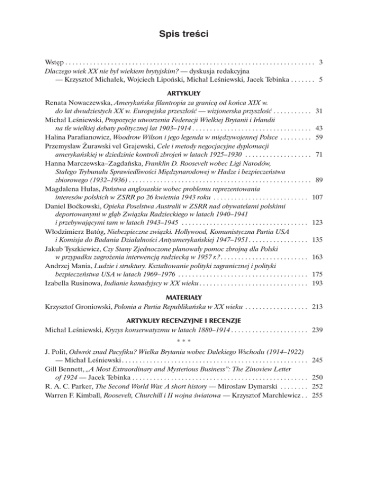 Spis tre¥ci Spis treœci Wstêp . . . . . . . . . . . . . . . . . . . . . . . . . . . . . . . . . . . . . . . . . . . . . . . . . . . . . . . . . . . . . . . . . . . . . . . 3 Dlaczego wiek XX nie by³ wiekiem brytyjskim? — dyskusja redakcyjna — Krzysztof Micha³ek, Wojciech Lipoñski, Micha³ Leœniewski, Jacek Tebinka . . . . . . . 5 ARTYKU£Y Renata Nowaczewska, Amerykañska filantropia za granic¹ od koñca XIX w. do lat dwudziestych XX w. Europejska przesz³oœæ — wizjonerska przysz³oœæ . . . . . . . . . . . 31 Micha³ Leœniewski, Propozycje utworzenia Federacji Wielkiej Brytanii i Irlandii na tle wielkiej debaty politycznej lat 1903–1914 . . . . . . . . . . . . . . . . . . . . . . . . . . . . . . . . . . 43 Halina Parafianowicz, Woodrow Wilson i jego legenda w miêdzywojennej Polsce . . . . . . . . . 59 Przemys³aw ¯urawski vel Grajewski, Cele i metody negocjacyjne dyplomacji amerykañskiej w dziedzinie kontroli zbrojeñ w latach 1925–1930 . . . . . . . . . . . . . . . . . . . 71 Hanna Marczewska–Zagdañska, Franklin D. Roosevelt wobec Ligi Narodów, Sta³ego Trybuna³u Sprawiedliwoœci Miêdzynarodowej w Hadze i bezpieczeñstwa zbiorowego (1932–1936) . . . . . . . . . . . . . . . . . . . . . . . . . . . . . . . . . . . . . . . . . . . . . . . . . . . . 89 Magdalena Hu³as, Pañstwa anglosaskie wobec problemu reprezentowania interesów polskich w ZSRR po 26 kwietnia 1943 roku . . . . . . . . . . . . . . . . . . . . . . . . . . . 107 Daniel Boækowski, Opieka Poselstwa Australii w ZSRR nad obywatelami polskimi deportowanymi w g³¹b Zwi¹zku Radzieckiego w latach 1940–1941 i przebywaj¹cymi tam w latach 1943–1945 . . . . . . . . . . . . . . . . . . . . . . . . . . . . . . . . . . . . 123 W³odzimierz Batóg, Niebezpieczne zwi¹zki. Hollywood, Komunistyczna Partia USA i Komisja do Badania Dzia³alnoœci Antyamerykañskiej 1947–1951. . . . . . . . . . . . . . . . . 135 Jakub Tyszkiewicz, Czy Stany Zjednoczone planowa³y pomoc zbrojn¹ dla Polski w przypadku zagro¿enia interwencj¹ radzieck¹ w 1957 r.?. . . . . . . . . . . . . . . . . . . . . . . . . 163 Andrzej Mania, Ludzie i struktury. Kszta³towanie polityki zagranicznej i polityki bezpieczeñstwa USA w latach 1969–1976 . . . . . . . . . . . . . . . . . . . . . . . . . . . . . . . . . . . . . 175 Izabella Rusinowa, Indianie kanadyjscy w XX wieku. . . . . . . . . . . . . . . . . . . . . . . . . . . . . . . 193 MATERIA£Y Krzysztof Groniowski, Polonia a Partia Republikañska w XX wieku . . . . . . . . . . . . . . . . . . 213 ARTYKU£Y RECENZYJNE I RECENZJE Micha³ Leœniewski, Kryzys konserwatyzmu w latach 1880–1914 . . . . . . . . . . . . . . . . . . . . . . 239 *** J. Polit, Odwrót znad Pacyfiku? Wielka Brytania wobec Dalekiego Wschodu (1914–1922) — Micha³ Leœniewski . . . . . . . . . . . . . . . . . . . . . . . . . . . . . . . . . . . . . . . . . . . . . . . . . . . . . Gill Bennett, „A Most Extraordinary and Mysterious Business”: The Zinoview Letter of 1924 — Jacek Tebinka . . . . . . . . . . . . . . . . . . . . . . . . . . . . . . . . . . . . . . . . . . . . . . . . . . R. A. C. Parker, The Second World War. A short history — Miros³aw Dymarski . . . . . . . . Warren F. Kimball, Roosevelt, Churchill i II wojna œwiatowa — Krzysztof Marchlewicz . . 245 250 252 255 294 Spis treœci Churchill War Papers, vol. II, Never Surrender May 1940–December 1940 — Jacek Tebinka. . . . . . . . . . . . . . . . . . . . . . . . . . . . . . . . . . . . . . . . . . . . . . . . . . . . . . . . . John Earl Haynes, Harvey Klehr, Venona. Decoding Soviet Espionage in America — W³odzimierz Batóg . . . . . . . . . . . . . . . . . . . . . . . . . . . . . . . . . . . . . . . . . . . . . . . . . . . . Venona. Soviet Espionage and the American Response 1939–1957 — Jacek Tebinka . . . . . Halina Parafianowicz, Eleanor Anna Roosevelt (1884–1962). W cieniu wielkiego mê¿a — Hanna Marczewska–Zagdañska . . . . . . . . . . . . . . . . . . . . . . . . . . . . . . . . . . . . . . . . . Longin Pastusiak, Prezydenci Stanów Zjednoczonych Ameryki Pó³nocnej — W³odzimierz Batóg . . . . . . . . . . . . . . . . . . . . . . . . . . . . . . . . . . . . . . . . . . . . . . . . . . . . Jadwiga Kiwerska, S³ownik prezydentów amerykañskich — Halina Parafianowicz . . . . . . Documents on British Policy Overseas, vol. I: Britain and the Soviet Union 1968–1972; vol. II: The Conference on Security and Cooperation in Europe 1972–1975 — Jacek Tebinka. . . . . . . . . . . . . . . . . . . . . . . . . . . . . . . . . . . . . . . . . . . . . . . . . . . . . . . . . Arkadiusz ¯ukowski, Polsko–po³udniowoafrykañskie stosunki polityczne — Jacek Knopek. . . . . . . . . . . . . . . . . . . . . . . . . . . . . . . . . . . . . . . . . . . . . . . . . . . . . . . . . Dorota Prasza³owicz, Stosunki polsko–niemieckie na obczyŸnie. Polscy i niemieccy imigranci w Milwaukee, Wisconsin (USA) 1860–1920 — Ewa Kowalska . . . . . . . . . . . 258 261 264 267 275 277 280 283 286 ¯YCIE NAUKOWE „Uniwersalne przes³anie Ameryk na wiek XXI”. 50. Miêdzynarodowy Kongres Amerykanistów, Warszawa, 10–14 lipca 2000 r. — Krzysztof Micha³ek . . . . . . . . . . . . . . . . . . . . . . 289