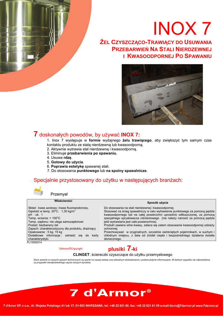 INOX 7 ŻEL CZYSZCZĄCO-TRAWIĄCY DO USUWANIA PRZEBARWIEŃ NA STALI NIERDZEWNEJ I KWASOODPORNEJ PO SPAWANIU 7 doskonałych powodów, by używać INOX 7: 1. Inox 7 występuje w formie wydajnego żelu trawiącego, aby zwiększyć tym samym czas kontaktu produktu ze stalą nierdzewną lub kwasoodporną. 2. Aktywnie wytrawia stal nierdzewną i kwasoodporną. 3. Eliminuje przebarwienia po spawaniu. 4. Usuwa rdzę. 5. Gotowy do użycia. 6. Poprawia estetykę spawanej stali. 7. Do stosowania punktowego lub na spoiny spawalnicze. Specjalnie przystosowany do użytku w następujących branżach: Przemysł Właściwości Sposób użycia Skład : kwas azotowy i kwas fluorowodorowy, Gęstość w temp. 20oC: 1,30 kg/m3 pH : ok. 1 Temp. wrzenia: > 100oC Temp. zapłonu: nie ulega samozapłonowi Postać: bezbarwny żel Zapach: charakterystyczny dla produktu, drażniący Opakowanie : 5 kg, 15 kg Dodatkowe informacje : odnieść się do karty charakterystyki. Do stosowania na stali nierdzewnej i kwasoodpornej. Stosować na ścieg spawalniczy w celu wytrawienia punktowego za pomocą pędzla kwasoodpornego lub na całej powierzchni uprzednio odtłuszczonej, za pomocą specjalnego spryskiwacza ciśnieniowego (nie należy nanosić za pomocą pędzla jeśli wytrawiana jest cała powierzchnia). Produkt zawiera silne kwasy, zaleca się zatem stosowanie kwasoodpornej odzieży ochronnej. Przechowywać w oryginalnych, szczelnie zamkniętych pojemnikach, w suchym i chłodnym miejscu, z dala od źródeł ciepła i bezpośredniego działania światła słonecznego. PL15092014 7dArmor©Copyright plusiki 7-ki CLINGET: ściereczki czyszczące do użytku przemysłowego Dane zawarte w naszych opisach technicznych są oparte na naszej wiedzy oraz aktualnym doświadczeniu i podane jedynie informacyjnie. W żadnym wypadku nie odpowiadamy za przypadki nieodpowiedniego użycia naszych wyrobów. SPOSÓB UŻYCIA INOX 7: Wymieszać preparat aż do uzyskania jednorodnej masy, mieszając plastikową lub drewnianą szpatułką. Nie stosować nigdy metalowych narzędzi. • • Nałożyć jednorodną niezbyt cienką warstwę żelu na ścieg spoiny, w sposób zapewniający jak największą jednorodność dla uniknięcia wad powierzchniowych. Pozostawić na czas reakcji od kilku minut do godziny, w zależności od rodzaju spoiny i temperatury otoczenia (zimą może okazać się konieczne wydłużenie czasu wytrawiania). Zmiana barwy żelu na charakterystyczny zielony kolor oznacza zwyczajowo koniec procesu wytrawiania. Wskazane jest jednak, aby użytkownik sprawdził niezbędny czas aplikacji, uwzględniając własne wymagania. Spłukać dokładnie za pomocą strumienia zimnej wody, najlepiej pod ciśnieniem. Nie stosować ciepłej wody. W miesiącach cieplejszych zaleca się, aby nie eksponować powierzchni poddawanych procesowi za pomocą INOX7S bezpośrednio na światło słoneczne. Zaleca się ponadto, aby wykonywać wytrawianie w miejscu zabezpieczonym od deszczu, w celu zapewnienia dobrego rezultatu. Zaleca się odtłuszczenie detalu przed przystąpieniem do procesu wytrawiania. po zakończeniu trawienia wskazane jest przywrócić do poprzedniego stanu warstwę ochronnych tlenków powierzchniowych za pomocą preparatu pasywującego (np. SYNCLAIR A/C). PRODUKTY TOWARZYSZĄCE : Pędzle kwasoodpone wykonane w całości z kwasoodpornego polipropylenu i służą do nanoszenia past i żeli trawiących oraz neutralizatorów. Trwałe i wygodne w użyciu, zapewniają precyzyjne, punktowe nakładanie preparatów w postaci past i żelu. Dostępne w 2 rozmiarach : fi 10 i fi 13.