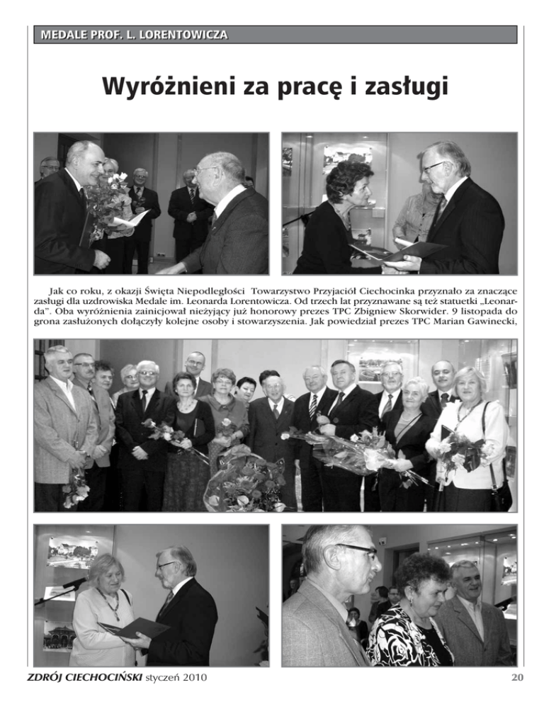 MEDALE PROF. L. LORENTOWICZA Wyró˝nieni za prac´ i zas∏ugi Jak co roku, z okazji Âwi´ta Niepodleg∏oÊci Towarzystwo Przyjació∏ Ciechocinka przyzna∏o za znaczàce zas∏ugi dla uzdrowiska Medale im. Leonarda Lorentowicza. Od trzech lat przyznawane sà te˝ statuetki „Leonarda”. Oba wyró˝nienia zainicjowa∏ nie˝yjàcy ju˝ honorowy prezes TPC Zbigniew Skorwider. 9 listopada do grona zas∏u˝onych do∏àczy∏y kolejne osoby i stowarzyszenia. Jak powiedzia∏ prezes TPC Marian Gawinecki, ZDRÓJ CIECHOCI¡SKI styczeƒ 2010 20 dla podniesienia rangi uroczystoÊç zorganizowano w tym roku w Dworku Prezydenta. Tym razem Kapitu∏a Medalu im. L. Lorentowicza, której przewodniczy Jerzy Sobierajski, wyró˝ni∏a statuetkà „Leonarda” trzy osoby: dyrektor sanatorium „Julianówka” Helen´ Szulc, w∏aÊciciela Willi „Piast” Mieczys∏awa Zamelskiego (wyró˝nienie odebra∏ prezes Pawe∏ Zamelski) i w∏aÊciciela hotelu St. George Jerzego Rutkowskiego. Nagrodzeni przywrócili do ÊwietnoÊci podupadajàce obiekty uzdrowiskowe. Natomiast Medale im. Leonarda Lorentowicza otrzyma∏o 6 osób i jedno stowarzyszenie. Doktor nauk medycznych z zakresu balneologii i reumatologii Piotr Kalmus od wielu lat pracuje w Ciechocinku zarówno na stanowiskach kierowniczych - administracyjnych, jak i jako lekarz w placówkach s∏u˝by zdrowia. Wieloletni cz∏onek Instytutu Balneologii i Medycyny Fizykalnej Collegium Medicum UMK z siedzibà w Ciechocinku. Przez 5 lat pe∏ni∏ funkcj´ zast´pcy dyrektora ds. lecznictwa w 22. Wojskowym Szpitalu Uzdrowiskowo - Rehabilitacyjnym, gdzie aktualnie jest ordynatorem oddzia∏u rehabilitacji ogólnoustrojowej. Pe∏ni tak˝e funkcj´ dziekana Wydzia∏u Fizjoterapii i Dietetyki Bydgoskiej Szko∏y Wy˝szej. Autor wielu publikacji naukowych dotyczàcych lecznictwa uzdrowiskowego w Ciechocinku. Maria Nawrocka jest wieloletnià dzia∏aczkà oÊwiatowà i zwiàzkowà (NZSS „SolidarnoÊç”) oraz spó∏dzielczoÊci mieszkaniowej - wieloletni cz∏onek Rady Nadzorczej Spó∏dzielni Mieszkaniowej w Ciechocinku, a tak˝e jej przewodniczàca. Gerard Pietrosiuk to wieloletni prezes, obecnie wiceprezes firmy „Polbruk” SA z siedzibà w Gdaƒsku. Od lat wielki przyjaciel Ciechocinka, sponsor wielu imprez kulturalnych odbywajàcych si´ w naszym mieÊcie, wielokrotny ofiarodawca kostki „polbruk” wykorzystywanej do renowacji ciechociƒskich chodników. Bo˝ena Pietrzak jest emerytowanà nauczycielkà. Zawsze pracowa∏a spo∏ecznie. W 1980 r. by∏a jednym z za∏o˝ycieli „SolidarnoÊci” w Szkole Podstawowej nr 3 w Ciechocinku. Inicjatorka misji pojednania polskoniemieckiego. Przez wiele lat wspó∏pracowa∏a z Rodzinà Westerplatczyków i Hubalczyków. By∏a cz∏onkiem zarzàdu Fundacji „Macierzyƒstwo”, dzi´ki której powsta∏ Dom Samotnej Matki w Ciechocinku. To tak˝e aktywny cz∏onek TPC - przewodniczàca Komisji Rewizyjnej. El˝biet´ Przychod´ doceniono za prac´ w Ârodowiskowym Klubie Honorowych Dawców Krwi, którego jest prezesem od 1978 r. Sama odda∏a 45 litrów krwi. By∏a wielokrotnie odznaczana za swà dzia∏alnoÊç medalami i odznakami, m.in. Bràzowym, Srebrnym i Z∏otym Krzy˝em dla Krwiodawców, Kryszta∏owym Sercem i Medalem Zas∏u˝ony dla S∏u˝by Zdrowia. Anna Wodzyƒska to aktywny cz∏onek TPC, dzia∏aczka PTTK o. Toruƒ, wspó∏pracuje z oddzia∏em PTTK w Ciechocinku. Jako cz∏onek TPC swój wolny czas poÊwi´ca na rzecz tego stowarzyszenia, m.in. w Galerii „Pod Dachem Nieba”. Nagrodzono te˝ Ârodowiskowy Klub Honorowych Dawców Krwi. Utworzony w 1978 roku zrzesza 120 krwiodawców gotowych w ka˝dej chwili ofiarowaç bezcenny lek - krew. W roku bie˝àcym ciechociƒscy krwiodawcy oddali ponad 104 litry krwi. Przez 31 lat dzia∏alnoÊci oddano ponad 32 600 litrów krwi. Sylwetki nagrodzonych osób przedstawi∏a zebranym 21 sekretarz TPC Klara Drobniewska. Laureaci otrzymali kwiaty i gratulacje od w∏adz TPC i miasta, wspó∏pracowników oraz grona przyjació∏ i znajomych. Nie zabrak∏o lampki szampana, którym wzniesiono toast za zdrowie wyró˝nionych. Moim zdaniem organizatorzy powinni lepiej zorganizowaç uroczystoÊç. Zaproszenia by∏y rozes∏ane w ostatniej chwili, niektórzy ˝alili si´, ˝e choç chcieli, nie mogli przybyç do Dworku Prezydenta. Na sali nie by∏o krzese∏, a przecie˝ nie ka˝dy mo˝e d∏ugo staç, s∏uchajàc przemówieƒ. W tym roku by∏y te˝ g∏osy, ˝e decyzja Kapitu∏y Medalu L. Lorentowicza w niektórych przypadkach by∏a ma∏o uzasadniona. Tekst i fot. Aldona Nocna Z ˚YCIA MIASTA Szcz´Êliwi ciechocinianie? „Szcz´Êliwy naród, który ma poet´ i w trudach swoich nie kroczy w milczeniu” - pisa∏ Czes∏aw Mi∏osz. Mo˝na by sparafrazowaç te s∏owa nast´pujàco: „Szcz´Êliwe miasto, które ma poet´”. Dlaczego? Otó˝ fakt, ˝e ktoÊ si´ urodzi∏ w danym mieÊcie, pisa∏ o nim czy zwiàza∏ swoje ˝ycie z jednym miejscem, jest niezwykle istotny nie tylko w geografii literackiej… 19 kwietnia 1939 r. w Ciechocinku przyszed∏ na Êwiat Janusz Kwiatkowski. By∏ pierworodnym synem miejscowych nauczycieli: Mieczys∏awa Kwiatkowskiego, uczàcego biologii i Ireny z domu ˚ernickiej - matematyczki. Urodzi∏ si´ w domu przy ul. Narutowicza, w tej cz´Êci miasta, o której mówi si´ Bia∏e Domy. Zas∏ynà∏ jako Janusz ˚ernicki - poeta z T´˝niopolis - jak mawia∏ o uzdrowisku, którego charakterystycznym elementem krajobrazu sà t´˝nie. Opublikowa∏ pod nazwiskiem matki kilkanaÊcie tomików wierszy. Teksty o Jego twórczoÊci mo˝na odnaleêç w ró˝nych s∏ownikach czy pracach o poezji XX w. W 2002 r. ukaza∏a si´ najwi´ksza pozycja poÊwi´cona Jego ˝yciu i twórczoÊci „Janusz ˚ernicki - poeta osobny” pod redakcjà Wandy Kwiatkowskiej i Stanis∏awa Jasiƒskiego. Zastanawia mnie, czy mieszkaƒcy znajà Jego nazwisko, czy si´gajà do Jego ksià˝ek, czytajà Jego wiersze? Czy wied
