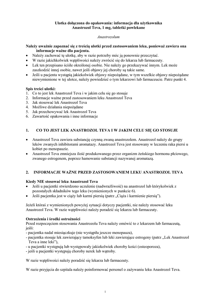 Ulotka dołączona do opakowania: informacja dla użytkownika Anastrozol Teva, 1 mg, tabletki powlekane Anastrozolum Należy uważnie zapoznać się z treścią ulotki przed zastosowaniem leku, ponieważ zawiera ona informacje ważne dla pacjenta. Należy zachować tę ulotkę, aby w razie potrzeby móc ją ponownie przeczytać. W razie jakichkolwiek wątpliwości należy zwrócić się do lekarza lub farmaceuty. Lek ten przepisano ściśle określonej osobie. Nie należy go przekazywać innym. Lek może zaszkodzić innej osobie, nawet jeśli objawy jej choroby są takie same. Jeśli u pacjenta wystąpią jakiekolwiek objawy niepożądane, w tym wszelkie objawy niepożądane niewymienione w tej ulotce, należy powiedzieć o tym lekarzowi lub farmaceucie. Patrz punkt 4. Spis treści ulotki: 1. Co to jest lek Anastrozol Teva i w jakim celu się go stosuje 2. Informacje ważne przed zastosowaniem leku Anastrozol Teva 3. Jak stosować lek Anastrozol Teva 4. Możliwe działania niepożądane 5. Jak przechowywać lek Anastrozol Teva 6. Zawartość opakowania i inne informacje 1. 2. CO TO JEST LEK ANASTROZOL TEVA I W JAKIM CELU SIĘ GO STOSUJE Anastrozol Teva zawiera substancję czynną zwaną anastrozolem. Anastrozol należy do grupy leków zwanych inhibitorami aromatazy. Anastrozol Teva jest stosowany w leczeniu raka piersi u kobiet po menopauzie. Anastrozol Teva zmniejsza ilość produkowanego przez organizm żeńskiego hormonu płciowego, zwanego estrogenem, poprzez hamowanie substancji nazywanej aromatazą. INFORMACJE WAŻNE PRZED ZASTOSOWANIEM LEKU ANASTROZOL TEVA Kiedy NIE stosować leku Anastrozol Teva Jeśli u pacjentki stwierdzono uczulenie (nadwrażliwość) na anastrozol lub którykolwiek z pozostałych składników tego leku (wymienionych w punkcie 6). Jeśli pacjentka jest w ciąży lub karmi piersią (patrz „Ciąża i karmienie piersią”). Jeżeli któraś z wymienionych powyżej sytuacji dotyczy pacjentki, nie należy stosować leku Anastrozol Teva. W razie wątpliwości należy poradzić się lekarza lub farmaceuty. Ostrzeżenia i środki ostrożności Przed rozpoczęciem stosowania Anastrozolu Teva należy omówić to z lekarzem lub farmaceutą, jeśli: - pacjentka nadal miesiączkuje (nie wystąpiła jeszcze menopauza), - pacjentka stosuje lek zawierający tamoksyfen lub leki zawierające estrogeny (patrz „Lek Anastrozol Teva a inne leki”), - u pacjentki występują lub występowały jakiekolwiek choroby kości (osteoporoza), - jeśli u pacjentki występują choroby nerek lub wątroby. W razie wątpliwości należy poradzić się lekarza lub farmaceuty. W razie przyjęcia do szpitala należy poinformować personel o zażywaniu leku Anastrozol Teva. 1 Lek Anastrozol Teva a inne leki Należy powiedzieć lekarzowi lub farmaceucie o wszystkich lekach przyjmowanych przez pacjenta obecnie lub ostatnio, a także o lekach, które pacjent planuje przyjmować. Dotyczy to również leków, które wydawane są bez recepty oraz leków ziołowych, ponieważ Anastrozol Teva może wpływać na sposób działania niektórych leków, a także niektóre leki mogą wpływać na Anastrozol Teva. Nie należy stosować leku Anastrozol Teva, jeśli pacjentka stosuje już jeden z wymienionych leków: niektóre leki stosowane do leczenia raka piersi (selektywne modulatory receptora estrogenowego), np. leki zawierające tamoksyfen, ponieważ Anastrozol Teva może przestać działać prawidłowo, leki zawierające estrogen, takie jak hormonalna terapia zastępcza (HTZ). Jeśli powyższa sytuacja dotyczy pacjentki, należy skontaktować się z lekarzem lub farmaceutą. Należy powiedzieć lekarzowi, jeśli: pacjentka stosuje jakikolwiek lek z grupy analogów LHRH, takie jak: gonadorelina, buserelina, goserelina, leuprorelina, tryptorelina. Są to leki stosowane w leczeniu raka piersi, niektórych chorób kobiecych (ginekologicznych) i niepłodności. Ciąża i karmienie piersią Nie należy stosować leku Anastrozol Teva podczas ciąży i w okresie karmienia piersią. Należy przerwać stosowanie leku Anastrozol Teva i skonsultować się z lekarzem w przypadku zajścia w ciążę. Prowadzenie pojazdów i obsługiwanie maszyn Jest mało prawdopodobne, aby Anastrozol Teva zaburzał zdolność prowadzenia pojazdów i obsługiwania maszyn. Niemniej jednak u osób zażywających lek Anastrozol Teva obserwowano przypadki osłabienia i senności. Jeśli powyższa sytuacja dotyczy pacjentki, należy skontaktować się z lekarzem lub farmaceutą. Anastrozol Teva zawiera laktozę. Laktoza jest rodzajem cukru. Jeśli u pacjentki stwierdzono nietolerancję niektórych cukrów, przed zastosowaniem leku należy skontaktować się z lekarzem. 3. JAK STOSOWAĆ LEK ANASTROZOL TEVA Ten lek należy zawsze stosować zgodnie z zaleceniami lekarza lub farmaceuty. W razie wątpliwości należy zwrócić się do lekarza lub farmaceuty. Zalecana dawka leku to 1 tabletka raz na dobę. Lek należy zażywać regularnie o tej samej porze każdego dnia. Tabletkę należy połknąć w całości i popić wodą. Anastrozol Teva można zażywać niezależnie od posiłków. Anastrozol Teva należy przyjmować tak długo jak zaleci lekarz. Stosowanie leku jest długotrwałe, może trwać nawet kilka lat. Stosowanie u dzieci i młodzieży Anastrozol Teva nie powinien być stosowany u dzieci i młodzieży. Zastosowanie większej niż zalecana dawki leku Anastrozol Teva W razie zażycia większej niż zalecana dawki leku należy niezwłocznie zwrócić się do lekarza. Pominięcie zastosowania leku Anastrozol Teva 2 W przypadku pominięcia dawki leku następną należy zażyć następnego dnia o zwykłej porze. Nie należy stosować dawki podwójnej w celu uzupełnienia pominiętej dawki. Przerwanie stosowania leku Anastrozol Teva Nie należy przerywać stosowania leku Anastrozol Teva bez konsultacji z lekarzem. W razie jakichkolwiek dalszych wątpliwości związanych ze stosowaniem tego leku należy zwrócić się do lekarza lub farm