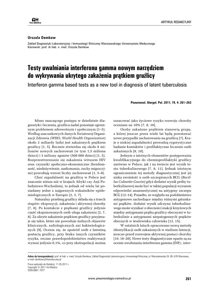 ARTYKUŁ REDAKCYJNY Urszula Demkow Zakład Diagnostyki Laboratoryjnej i Immunologii Klinicznej Warszawskiego Uniwersytetu Medycznego Kierownik: prof. dr hab. n. med. Urszula Demkow Testy uwalniania interferonu gamma nowym narzędziem do wykrywania ukrytego zakażenia prątkiem gruźlicy Interferon gamma based tests as a new tool in diagnosis of latent tuberculosis Pneumonol. Alergol. Pol. 2011; 79, 4: 261–263 Mimo znaczącego postępu w dziedzinie diagnostyki i leczenia, gruźlica nadal pozostaje ogromnym problemem zdrowotnym i społecznym [1–5]. Według szacunkowych danych Światowej Organizacji Zdrowia (WHO, World Health Organization) około 2 miliardy ludzi jest zakażonych prątkiem gruźlicy [1, 5]. Rocznie stwierdza się około 8 milionów nowych zachorowań (w tym 1,5 miliona dzieci) i 3 miliony zgonów (500 000 dzieci) [1, 5]. Rozprzestrzenianie się zakażenia wirusem HIV oraz czynniki społeczno-ekonomiczne (bezdomność, niedożywienie, narkomania, ruchy migracyjne) powodują wzrost liczby zachorowań [1, 5–8]. Choć zapadalność na gruźlicę w Polsce jest znacznie niższa niż w krajach Afryki czy Azji Południowo-Wschodniej, to jednak od wielu lat posiadamy jedne z najgorszych wskaźników epidemiologicznych w Europie [2, 3, 7]. Naturalny przebieg gruźlicy składa się z trzech etapów: ekspozycji, zakażenia i aktywnej choroby [7, 8]. Po kontakcie z prątkami gruźlicy jedynie część eksponowanych osób ulega zakażeniu [2, 7, 8]. Za ukryte zakażenie prątkiem gruźlicy przyjmuje się takie, które nie powoduje żadnych objawów klinicznych, radiologicznych ani bakteriologicznych [9]. Ocenia się, że spośród osób z latentną postacią gruźlicy, przy braku innych czynników ryzyka, roczne prawdopodobieństwo reaktywacji wynosi jedynie 0,1%, co przy ekstrapolacji można oszacować jako życiowe ryzyko rozwoju choroby oceniane na 10% [7, 8, 10]. Osoby zakażone prątkiem stanowią grupę, z której jeszcze przez wiele lat będą powstawać nowe przypadki zachorowania na gruźlicę [7]. Kraje o niskiej zapadalności prowadzą rygorystyczne badanie kontaktów i profilaktyczne leczenie osób zakażonych [9, 10]. Jednym z istotnych elementów postępowania kwalifikacyjnego do chemioprofilaktyki gruźlicy zarówno w Polsce, jak i na świecie jest wynik testu tuberkulinowego [7, 8, 11]. Jednak istotnym ograniczeniem tej metody diagnostycznej jest jej niska swoistość u osób szczepionych BCG (Bacillus Calmette-Guerin) gdyż dodatni wynik próby tuberkulinowej może być w takiej populacji wyrazem odpowiedzi anamnestycznej na antygeny szczepu BCG [12–14]. Ponadto, ze względu na podobieństwo antygenowe zachodzące między różnymi gatunkami prątków, dodatni wynik odczynu tuberkulinowego może wynikać z obecności reakcji krzyżowych między antygenami prątka gruźlicy obecnymi w tuberkulinie a antygenami niepatogennych prątków obecnych w środowisku człowieka [12, 15]. W ostatnich latach opracowano nową metodę identyfikacji osób zakażonych w stadium latencji, jeszcze przed rozwojem aktywnej postaci choroby [10, 16–20]. Nowe testy diagnostyczne oparte są na ocenie uwalniania interferonu gamma (INFg, inter- Adr es do korespondencji: prof. dr hab. n. med. Urszula Demkow, Zakład Diagnostyki Laboratoryjnej i Immunologii Klinicznej, ul. Marszakowska 24, 00–576 Warszawa, Adres e-mail: [email protected] Praca wpłynęła do Redakcji: 11.05.2011 r. Copyright © 2011 Via Medica ISSN 0867–7077 www.pneumonologia.viamedica.pl 261 Pneumonologia i Alergologia Polska 2011, tom 79, nr 4, strony 261–263 feron gamma) przez pobudzone swoistymi antygenami prątka leukocyty krwi obwodowej człowieka (IGRA, interferon gamma release assays) [17–19]. Opracowano dwie kategorie testów IGRA różniących się metodyką wykonania: — test polegający na ocenie ilości uwalnianego interferonu w krótkotrwałych hodowlach komórek pełnej krwi stymulowanych antygenami prątka (Quantiferon-TB Gold — Cellestis); — test polegający na liczeniu komórek produkujących interferon po stymulacji (T-spot-TB — Oxford Immunotec). Do konstrukcji obu rodzajów testu IGRA zastosowano antygeny prątka Mycobacterium tuberculosis — early secreted antigenic target 6kDa (ESAT-6) i culture filtrated protein (CFP-10) [21– –28]. Oba antygeny są współwydzielane w ilościach 1:1 w krótkotrwałych hodowlach prątków [23]. Antygeny ESAT-6 oraz CFP-10 są kodowane przez geny regionu RD-1 nieobecnego we wszystkich podtypach szczepu BCG oraz u większości prątków niegruźliczych (za wyjątkiem M. szulgai, M. marinum i M. kansasi) [13, 27, 28]. Homolog antygenu ESAT-6 istnieje u prątków trądu (M. leprae), jakkolwiek mimo 36-procentowej homologii można się spodziewać reakcji krzyżowych w krajach, gdzie występuje zakażenie trądem. Zarówno ESAT6, jak i CFP-10 są antygenami o małej masie cząsteczkowej, preferencyjnie rozpoznawanymi i będącymi głównymi stymulatorami produkcji INF-g we wczesnych fazach eksperymentalnego zakażenia prątkiem [29, 30]. Oba antygeny występują na tym samym operonie, pozostają pod kontrolą tego samego promotora i są aktywnie wydzielane przez M. tuberculosis, po czym formują dimer. I chociaż stanowią dwa oddzielne polipeptydy, są jednak prezentowane komórkom układu odpornościowego w ilościach równomolarnych i w tym samym czasie, dlatego mogą być traktowane jako jeden antygen. Ograniczona różnorodność repertuaru limfocytów T we wczesnym okresie zakażenia warunkuje wysoką czułość testów opartych na powyższych antygenach [22, 23]. W późniejszych fazach zakażenia odpowiedź immunologiczna limfocytów jest bardziej heterogenna, a więc reakcja na te antygeny może być słabsza [22, 29, 30]. Zatem testy oparte na nich mogą być przydatne do wykrywania zakażenia prątkiem we wczesnej fazie, jeszcze przed rozwojem aktywnej, klinicznie jawnej postaci choroby [29, 30]. Odpowiedź na ESAT-6 i CFP-10 jest komplement