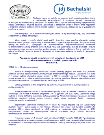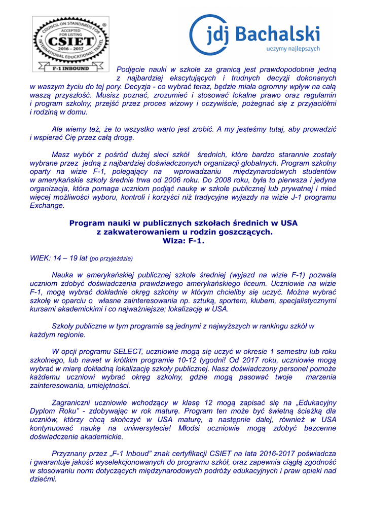 Podjęcie nauki w szkole za granicą jest prawdopodobnie jedną z najbardziej ekscytujących i trudnych decyzji dokonanych w waszym życiu do tej pory. Decyzja - co wybrać teraz, będzie miała ogromny wpływ na całą waszą przyszłość. Musisz poznać, zrozumieć i stosować lokalne prawo oraz regulamin i program szkolny, przejść przez proces wizowy i oczywiście, pożegnać się z przyjaciółmi i rodziną w domu. Ale wiemy też, że to wszystko warto jest zrobić. A my jesteśmy tutaj, aby prowadzić i wspierać Cię przez całą drogę. Masz wybór z pośród dużej sieci szkół średnich, które bardzo starannie zostały wybrane przez jedną z najbardziej doświadczonych organizacji globalnych. Program szkolny oparty na wizie F-1, polegający na wprowadzaniu międzynarodowych studentów w amerykańskie szkoły średnie trwa od 2006 roku. Do 2008 roku, była to pierwsza i jedyna organizacja, która pomaga uczniom podjąć naukę w szkole publicznej lub prywatnej i mieć więcej możliwości wyboru, kontroli i korzyści niż tradycyjne wyjazdy na wizie J-1 programu Exchange. Program nauki w publicznych szkołach średnich w USA z zakwaterowaniem u rodzin goszczących. Wiza: F-1. WIEK: 14 – 19 lat (po przyjeździe) Nauka w amerykańskiej publicznej szkole średniej (wyjazd na wizie F-1) pozwala uczniom zdobyć doświadczenia prawdziwego amerykańskiego liceum. Uczniowie na wizie F-1, mogą wybrać dokładnie okręg szkolny w którym chcieliby się uczyć. Można wybrać szkołę w oparciu o własne zainteresowania np. sztuką, sportem, klubem, specjalistycznymi kursami akademickimi i co najważniejsze; lokalizację w USA. Szkoły publiczne w tym programie są jednymi z najwyższych w rankingu szkół w każdym regionie. W opcji programu SELECT, uczniowie mogą się uczyć w okresie 1 semestru lub roku szkolnego, lub nawet w krótkim programie 10-12 tygodni! Od 2017 roku, uczniowie mogą wybrać w miarę dokładną lokalizację szkoły publicznej. Nasz doświadczony personel pomoże każdemu uczniowi wybrać okręg szkolny, gdzie mogą pasować twoje marzenia zainteresowania, umiejętności. Zagraniczni uczniowie wchodzący w klasę 12 mogą zapisać się na „Edukacyjny Dyplom Roku” - zdobywając w rok maturę. Program ten może być świetną ścieżką dla uczniów, którzy chcą skończyć w USA maturę, a następnie dalej, również w USA kontynuować naukę na uniwersytecie! Młodsi uczniowie mogą zdobyć bezcenne doświadczenie akademickie. Przyznany przez „F-1 Inboud” znak certyfikacji CSIET na lata 2016-2017 poświadcza i gwarantuje jakość wyselekcjonowanych do programu szkół, oraz zapewnia ciągłą zgodność w stosowaniu norm dotyczących międzynarodowych podróży edukacyjnych i praw opieki nad dziećmi. Umożliwiamy naukę w blisko 70 szkołach zlokalizowanych w 21 stanach USA, łącznie z najbardziej pożądanymi lokalizacjami w Bostonie, San Francisco, Los Angeles, Florydzie, Seattle, Phoenix i Denver. Chcesz surfować z rodziną goszczącą w Kalifornii? Świętować zwycięstwo drużyny koszykówki w Bostonie? Obserwować przygotowania do startu promu kosmicznego na Florydzie? Korzystać z dodatkowych zajęć kładących nacisk na polepszenie umiejętności językowych aby ubiegać się o przyjęcie na amerykański uniwersytet? Wszystko jest możliwe! Pełna lista stanów USA objętych programem: Arizona Arkansas California Colorado Florida Georgia Idaho Indiana Iowa Kansas Maine Massachussets Michigan Minnesota New Jersey New York Pennsylvania Rhode Island Utah Vermont Washington