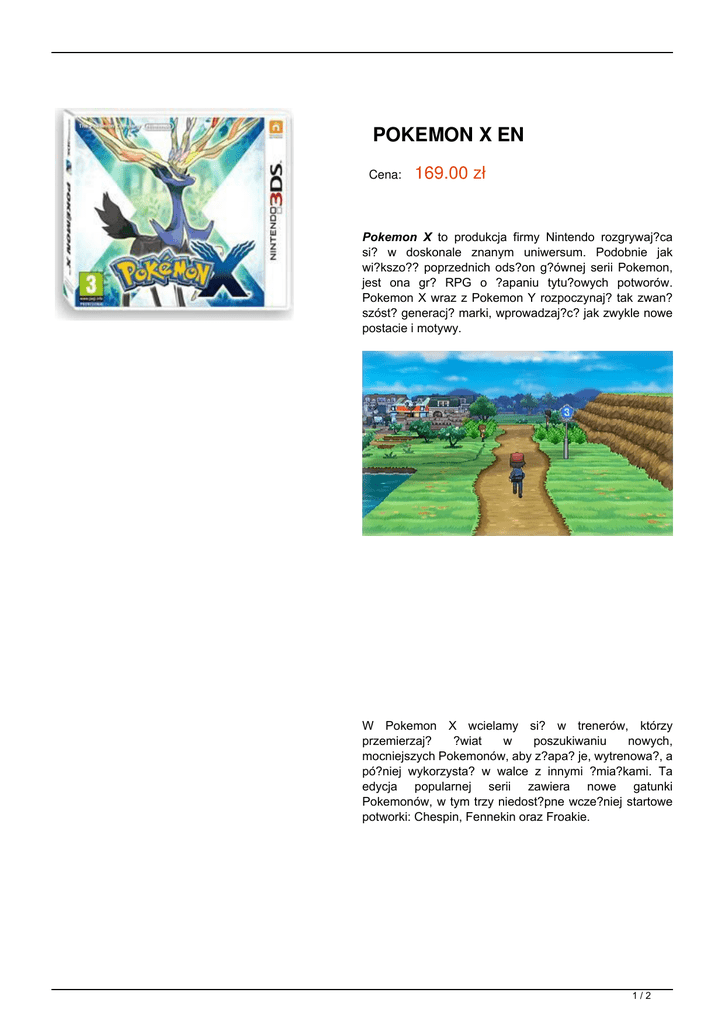 POKEMON X EN Cena: 169.00 zł Pokemon X to produkcja firmy Nintendo rozgrywaj?ca si? w doskonale znanym uniwersum. Podobnie jak wi?kszo?? poprzednich ods?on g?ównej serii Pokemon, jest ona gr? RPG o ?apaniu tytu?owych potworów. Pokemon X wraz z Pokemon Y rozpoczynaj? tak zwan? szóst? generacj? marki, wprowadzaj?c? jak zwykle nowe postacie i motywy. W Pokemon X wcielamy si? w trenerów, którzy przemierzaj? ?wiat w poszukiwaniu nowych, mocniejszych Pokemonów, aby z?apa? je, wytrenowa?, a pó?niej wykorzysta? w walce z innymi ?mia?kami. Ta edycja popularnej serii zawiera nowe gatunki Pokemonów, w tym trzy niedost?pne wcze?niej startowe potworki: Chespin, Fennekin oraz Froakie. 1/2 Rozgrywka sk?ada si? z eksplorowania lokacji, elementów zr?czno?ciowych, rozmawiania z innymi bohaterami oraz prowadzenia walk. Te ostatnie zrealizowano w dobrze znanej konwencji – star? prowadzonych na tury, podczas których wykorzystuje si? kilka rodzajów Pokemonów, uzbrojonych w ró?ne umiej?tno?ci i techniki. ?ród?o: http://www.gry-online.pl/S016.asp?ID=20286 2/2 Powered by TCPDF (www.tcpdf.org)