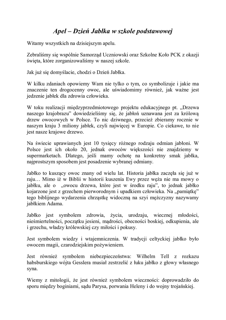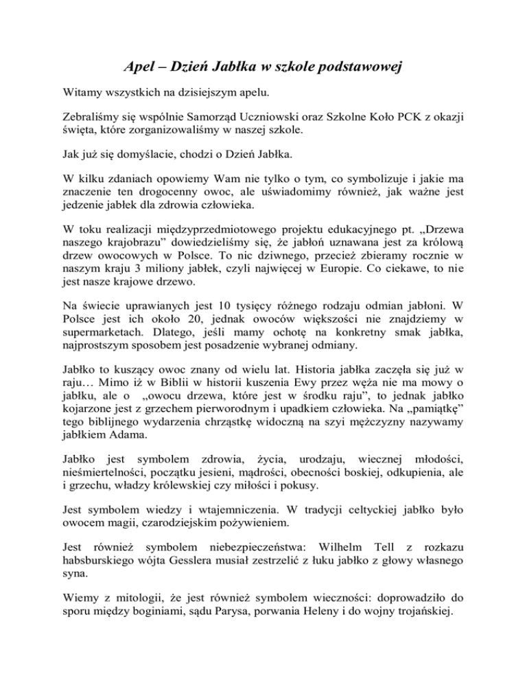 Apel – Dzień Jabłka w szkole podstawowej Witamy wszystkich na dzisiejszym apelu. Zebraliśmy się wspólnie Samorząd Uczniowski oraz Szkolne Koło PCK z okazji święta, które zorganizowaliśmy w naszej szkole. Jak już się domyślacie, chodzi o Dzień Jabłka. W kilku zdaniach opowiemy Wam nie tylko o tym, co symbolizuje i jakie ma znaczenie ten drogocenny owoc, ale uświadomimy również, jak ważne jest jedzenie jabłek dla zdrowia człowieka. W toku realizacji międzyprzedmiotowego projektu edukacyjnego pt. „Drzewa naszego krajobrazu” dowiedzieliśmy się, że jabłoń uznawana jest za królową drzew owocowych w Polsce. To nic dziwnego, przecież zbieramy rocznie w naszym kraju 3 miliony jabłek, czyli najwięcej w Europie. Co ciekawe, to nie jest nasze krajowe drzewo. Na świecie uprawianych jest 10 tysięcy różnego rodzaju odmian jabłoni. W Polsce jest ich około 20, jednak owoców większości nie znajdziemy w supermarketach. Dlatego, jeśli mamy ochotę na konkretny smak jabłka, najprostszym sposobem jest posadzenie wybranej odmiany. Jabłko to kuszący owoc znany od wielu lat. Historia jabłka zaczęła się już w raju… Mimo iż w Biblii w historii kuszenia Ewy przez węża nie ma mowy o jabłku, ale o „owocu drzewa, które jest w środku raju”, to jednak jabłko kojarzone jest z grzechem pierworodnym i upadkiem człowieka. Na „pamiątkę” tego biblijnego wydarzenia chrząstkę widoczną na szyi mężczyzny nazywamy jabłkiem Adama. Jabłko jest symbolem zdrowia, życia, urodzaju, wiecznej młodości, nieśmiertelności, początku jesieni, mądrości, obecności boskiej, odkupienia, ale i grzechu, władzy królewskiej czy miłości i pokusy. Jest symbolem wiedzy i wtajemniczenia. W tradycji celtyckiej jabłko było owocem magii, czarodziejskim pożywieniem. Jest również symbolem niebezpieczeństwa: Wilhelm Tell z rozkazu habsburskiego wójta Gesslera musiał zestrzelić z łuku jabłko z głowy własnego syna. Wiemy z mitologii, że jest również symbolem wieczności: doprowadziło do sporu między boginiami, sądu Parysa, porwania Heleny i do wojny trojańskiej. Właśnie jabłko jest atrybutem Afrodyty i jej służek – trzech Gracji. Jest też tradycyjnym atrybutem władzy królewskiej – złote jabłko z krzyżem symbolizuje sferę kosmiczną, świat, kulę ziemską. Używane jest przy koronacjach obok berła i korony. Jabłko pojawia się podczas wróżb andrzejkowych i w bajkach, jak na przykład o królewnie Śnieżce. Według legendy, Isaac Newton miał odkryć prawo grawitacji, gdy podczas rozmyślania w sadzie spadło mu na głowę. Big Apple czyli wielkie jabłko, to popularny w Stanach Zjednoczonych zwrot oznaczający Nowy Jork, a okrągła szarlotka jest symbolem narodowym i symbolem całej Ameryki, chociaż jabłonie na kontynent przywieźli Anglicy w XVII wieku. Wspomniani Anglicy mawiają: zjedz jedno jabłko dziennie, a lekarz nie będzie ci wcale potrzebny. Nasze babcie zjadały przynajmniej dwa jabłka w ciągu dnia – rano dla urody, a wieczorem dla dobrego zdrowia. Zapytacie: dlaczego warto jeść jabłka? Jabłka są bardzo cennym owocem. Bogate są w witaminę C, która wzmacnia naszą odporność, dlatego jabłka trzeba jeść szczególnie w okresie jesienno – zimowym, kiedy najczęściej zapadamy na choroby sezonowe, jak grypę czy przeziębienie. Jabłka są również źródłem żelaza, cynku, krzemu i potasu. Jedzone na surowo wzmacniają serce, układ nerwowy, mięśnie i poprawiają pracę wątroby. Mają ponadto działanie moczopędne, więc mogą zmniejszać obrzęki nóg. Gotowane i starte jabłka leczą też biegunkę u dzieci oraz niestrawność i choroby wrzodowe u osób dorosłych. Owoce te są niskokaloryczne i sycące, dlatego też są zalecane przy odchudzaniu. Te zdrowe owoce nie tylko pomagają nam schudnąć, ale również ułatwiają przyswajanie wapnia przez organizm. W ten sposób wzmacniają paznokcie, włosy i zęby. Ponadto twarde jabłka to dobre ćwiczenie dla naszych dziąseł, które dzięki gryzieniu wzmacniają się. Warto pamiętać, że po umyciu zębów nie należy zjadać jabłek, gdyż cukier w nich zawarty sprzyja próchnicy. Wiadomo również, że w skórce jabłka znajdują się ogromne ilości pektyn, które potrafią oczyszczać nasz organizm z trujących substancji. Dobroczynne pektyny „posprzątają” nasz organizm, zneutralizują toksyczne substancje, a także zmniejszą wchłanianie cholesterolu, chroniąc przed zawałem i miażdżycą. Do ich korzystnego wpływu zalicza się również regulację pracy jelit i zapobieganie zaparciom. Wymieniona wcześniej witamina C bierze również udział w metabolizmie, zapewnia młody wygląd skórze, przeciwdziała jej wiotczeniu. Wspólnie z witaminą PP zapobiega powstawaniu podskórnych wysięków i pajączków. Uwaga! Teraz super nowina dla wszystkich uczniów! W jednym, sporym jabłku jest ponad 16 g cukrów. Te, jak wiadomo, są niezbędnym paliwem dla mózgu. Naukowcy podejrzewają, że zawarte w jabłku flawonole mogą poprawiać funkcje poznawcze takie jak: pamięć, szybkość przetwarzania informacji czy ogólną zdolność myślenia. Dietetycy i lekarze zalecają jedzenie jabłek ze względu na ich znaczące właściwości zdrowotne – takie zalecenie propaguje również Europejski Kodeks Walki z Rakiem. Każdy z nas je lubi. Możemy cieszyć się ich smakiem przez cały rok. Sprawdzają się w deserach, znakomicie nadają do przetworów. Spośród wszystkich owoców Polacy wybierają je najchętniej. I bardzo dobrze: z punktu widzenia naszego zdrowia jabłka są nieocenione. Antonówki, koksy, malinówki, szare renety, kosztele, rubiny, lobo, papierówki... Kwaskowe i bardziej słodkie. Aromatyczne, przypominające smakiem gruszki, a nawet "ziemniaczane". Naprawdę jest w czym wybierać. Jeśli nie próbowałeś wszystkich, nie możesz twierdzić, że nie lubisz jabłek. My również, od Rady Rodziców, mamy dla Was w pod