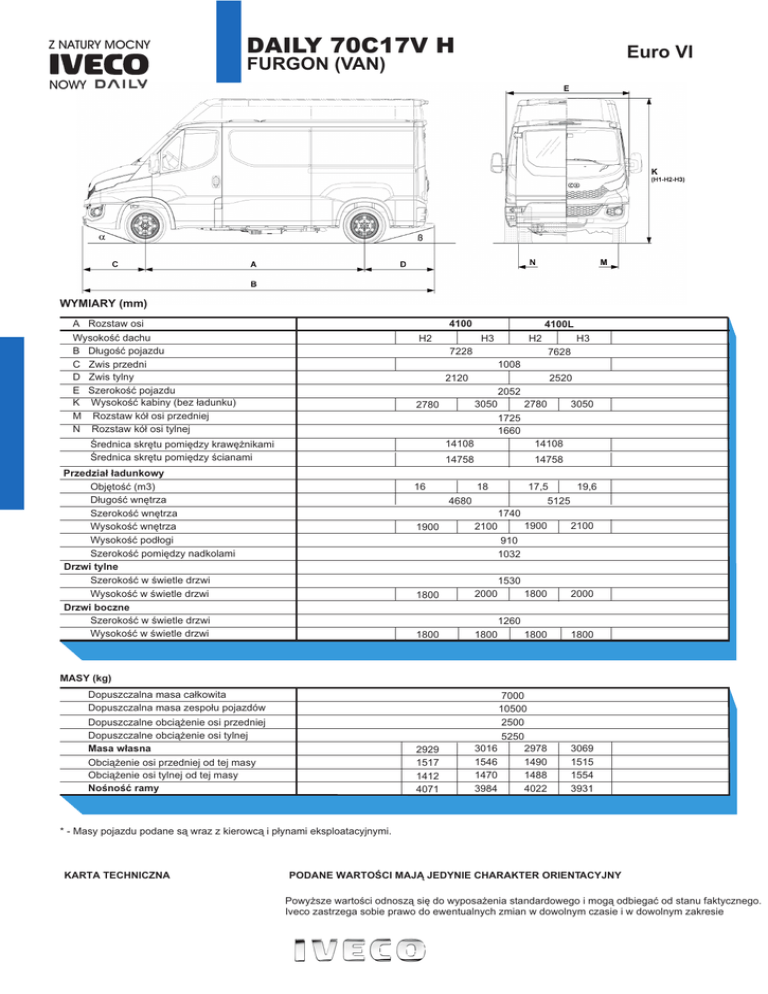 Z NATURY MOCNY DAILY 70C17V H Euro VI FURGON (VAN) NOWY WYMIARY (mm) A Rozstaw osi 4100 Wysokoœæ dachu B D³ugoœæ pojazdu C Zwis przedni D Zwis tylny E Szerokoœæ pojazdu K Wysokoœæ kabiny (bez ³adunku) M Rozstaw kó³ osi przedniej N Rozstaw kó³ osi tylnej H2 4100L H3 H2 7228 H3 7628 1008 2120 2520 2052 2780 3050 2780 3050 1725 1660 Œrednica skrêtu pomiêdzy krawê¿nikami Œrednica skrêtu pomiêdzy œcianami Przedzia³ ³adunkowy Objêtoœæ (m3) D³ugoœæ wnêtrza Szerokoœæ wnêtrza Wysokoœæ wnêtrza Wysokoœæ pod³ogi Szerokoœæ pomiêdzy nadkolami Drzwi tylne Szerokoœæ w œwietle drzwi Wysokoœæ w œwietle drzwi Drzwi boczne Szerokoœæ w œwietle drzwi Wysokoœæ w œwietle drzwi 14108 14108 14758 14758 16 18 17,5 19,6 5125 4680 1740 1900 2100 1900 2100 1800 2000 1800 1800 910 1032 1530 1800 2000 1800 1800 1260 MASY (kg) Dopuszczalna masa ca³kowita Dopuszczalna masa zespo³u pojazdów 7000 10500 2500 Dopuszczalne obci¹¿enie osi przedniej Dopuszczalne obci¹¿enie osi tylnej Masa w³asna Obci¹¿enie osi przedniej od tej masy Obci¹¿enie osi tylnej od tej masy Noœnoœæ ramy 2929 1517 1412 4071 3016 1546 1470 3984 5250 2978 1490 1488 4022 3069 1515 1554 3931 * - Masy pojazdu podane s¹ wraz z kierowc¹ i p³ynami eksploatacyjnymi. KARTA TECHNICZNA PODANE WARTOŒCI MAJ¥ JEDYNIE CHARAKTER ORIENTACYJNY Powy¿sze wartoœci odnosz¹ siê do wyposa¿enia standardowego i mog¹ odbiegaæ od stanu faktycznego. Iveco zastrzega sobie prawo do ewentualnych zmian w dowolnym czasie i w dowolnym zakresie Z NATURY MOCNY DAILY 70C17V H Euro VI FURGON (VAN) NOWY F1CFL411F 280 260 550 240 500 220 Dane techniczne Pojemnoœæ ca³kowita Œrednica i skok t³oka Moc maksymalna (CEE) Maksymalny moment obrotowy (CEE) Nm KM SILNIK Diesel 4-ro cylindrowy, rzêdowy, 16-to zaworowy, DOHC z elektronicznym wtryskiem bez-poœrednim typu "Common Rail". EDC, turbosprê¿arka o zmiennej geometrii VGT i z dodatkowym ch³odzeniem powietrza do³adowuj¹cego "Intercooler"; chodzony ciecz¹. Wentylator w³¹czany elektromagnetycznie, uk³ad recylkulacji spalin EGR oraz uk³ad SCR (Selektywnej Redukcji Katalitycznej z wykorzystaniem czynnika AdBlue; filtr cz¹stek sta³ych jako standard. Spe³nia wymogi Normy Czystoœci Spalin EURO VI (Heavy Duty) 450 200 2998 cm3 95,8 x 104 mm 170 KM(125 kW) /3500 obr/min 400 Nm/1250 obr/min 160 350 140 300 250 100 200 80 150 60 Skrzynia biegów - Manualna 6-cio biegowa, typ 2840.OD kW Prze³o¿enia: 1°-5,375:1, 2°-3,154:1, 3°-2,041:1, 4°-1,365:1, 5°-1:1, 6°-0,791:1, R - 4,838:1 moment obrotowy 180Nm przy 1500obr/min silnika , prze³o¿enie przystawki 1:1,04 400 120 T³umik gazów spalinowych Umieszczony wzd³u¿ pod³u¿nic ramy z rur¹ wydechow¹ centralnie pod ram¹ pojazdu. Przystawka odbioru mocy: przystosowanie do monta¿u z flansz¹, maks. przenoszony 180 40 100 20 50 0 0 1000 1500 2000 2500 3000 3500 4000 4500 Obr./min SPRZÊG£O Jednotarczowe, suche, wspomagane hydraulicznie, ok³adzina bezazbestowa. Œrednica zewnêtrzna: 11" (279 mm). TYLNY MOST Sztywny z pojedynczym hipoidalnym prze³o¿eniem. Dostêpne prze³o¿enia. 4,3, 4,556, 5,13 . RAMA POJAZDU Pod³u¿nice ze stalowych profili "C" po³¹czone rurowymi poprzecznicami Wymiary pod³u¿nic: szerokoœæ: 70mm, wysokoœæ 174mm, gruboœæ 5 mm ZAWIESZENIE Przednie Niezale¿ne zawieszenie kó³ na podwójnych wahaczach poprzecznych z odbojami i na dr¹¿kach skrêtnych (typ QuadTor). Hydra uliczne, teleskopowe amortyzatory dwustronnego dzia³ania. Tylne Sztywna belka tylnej osi, resory paraboliczne. Dr¹¿ek stabilizatora. Hydrauliczne, teleskopowe amortyzatory dwustronnego dzia³ania. UK£AD KIEROWNICZY Hydraulicznie wspomagana przek³adnia zêbatkowa. Czteroramienne ko³o kierownicy o œrednicy 390mm, po lewej stronie kabiny, blokada kierownicy. Pionowa regulacja ko³a kierownicy KO£A I OGUMIENIE Pojedyñcze na osi kierowanej, podwójne na napêdowej o rozmiarze 225/75R16. Felgi stalowe 5,5JR16. INSTALACJA ELEKTRYCZNA KABINA Kabina z wysuniêt¹ komor¹ silnika i wejœciem za osi¹, Akumulator seryjny: 12V -110Ah 3 miejsca: kierowcy + 2 pasa¿erów. Furgon modu³owy, Alternator seryjny: 14V -150A (2100W) w ca³oœci ze stali dla wszystkich wysokoœci dachu. Oœwietlenie: Mocowanie do podwozia za pomoc¹ elastycznych Zintegrowane halogenowe reflektory mijania i ³¹czników. Zabezpieczenie antykorozyjne nadwozia drogowe, œwiat³a przeciwmgielne umieszczone kataforez¹ i cynkowaniem. Materia³ chroni¹cy przed w zderzaku (opcja) uszkodzeniami dolnej czêœci nadwozia, nadkoli, komory silnikowej. Przednie b³otniki przykrêcane do UK£AD HAMULCOWY nadwozia. Boczny pas ochronny z tworzywa sztucznego. Szyby atermiczne i przyciemniane. Przednia szyba Hamulce tarczowe obu osi. Przednie tarcze panoramiczna, laminowana, klejona. Drzwi kabiny z wentylowane szybami opuszczanymi elektrycznie. Drzwi tylne Wymiary tarcz Przód Ty³ dwuskrzyd³owe bez okien, k¹t otwarcia 270°, stopieñ Œrednica/gruboœæ [mm] 301/30 306/28 wejœciowy na ca³ej szerokoœci drzwi. Drzwi boczne Opis uk³adu prawe przesuwne z wewnêtrznym stopniem. Œcianka Dwuobwodowy uk³ad krzy¿owy z zaciskami p³ywaj¹cymi i wspomaganiem podciœnieniowym. dzia³owa miêdzy kabin¹ i przedzia³em baga¿owym. Elektr. wskaŸnik zu¿ycia ok³adzin ciernych. Jako Fotel kierowcy regulowany w 3 p³aszczyznach, standard: ESP 9 zawieraj¹ce min. ABS, ASR, LAC przednia ³awka dla pasa¿erów dwumiejscowa, sta³a. Fotele pokryte materia³em z 3 punktowymi pasami (wszystkie funkcje wspomagaj¹ce prowadzenie bezpieczeñstwa (dla fotela srodkowego z pasami pojazdu), Hill Holder dwupunktowymi) z pirotechnicznymi napinaczami i Hamulec postojowy zag³ówkami. Regulowana w pionie kolumna kierownicy. Realizowany przez wewnêtrzny ham. bêbnowy Poduszka powietrzna kierowcy. Zewnêtrzne lusterka tylnej osi. szerokok¹tne z zespolonym kierunkowskazem. 4 g³oœniki z anten¹ radiow¹. Gniazdo po³¹czeniowe WENTYLACJA I OGRZEWANIE przyrz¹dów diagnostyczn
