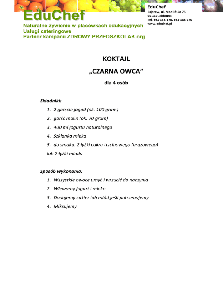 EduChef EduChef Naturalne żywienie w placówkach edukacyjnych Usługi cateringowe Partner kampanii ZDROWY PRZEDSZKOLAK.org Rajszew, ul. Modlińska 75 05-110 Jabłonna Tel. 661-333-175, 661-333-170 www.educhef.pl KOKTAJL „CZARNA OWCA” dla 4 osób Składniki: 1. 2 garście jagód (ok. 100 gram) 2. garść malin (ok. 70 gram) 3. 400 ml jogurtu naturalnego 4. Szklanka mleka 5. do smaku: 2 łyżki cukru trzcinowego (brązowego) lub 2 łyżki miodu Sposób wykonania: 1. Wszystkie owoce umyć i wrzucić do naczynia 2. Wlewamy jogurt i mleko 3. Dodajemy cukier lub miód jeśli potrzebujemy 4. Miksujemy