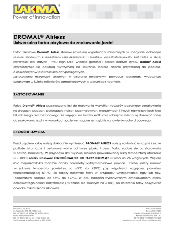 DROMAL® Airless Uniwersalna farba akrylowa do znakowania jezdni Farba akrylowa Dromal® Airless stanowi zawiesinę wypełniaczy mineralnych w specjalnie dobranym spoiwie akrylowym z dodatkiem rozpuszczalników i środków uszlachetniających. Jest farbą o dużej zawartości ciał stałych - typu High Solid, wysokiej gęstości i bardzo dobrym kryciu. Dromal® Airless charakteryzuje się powłoką wytrzymałą na ścieranie, bardzo dobrze przyczepną do podłoża, o doskonałych właściwościach antypoślizgowych. Zastosowanie mikrokulek szklanych o działaniu refleksyjnym powoduje doskonałą widoczność oznakowań w świetle reflektorów samochodowych w warunkach nocnych. ZASTOSOWANIE Farba Dromal® Airless przeznaczona jest do malowania wszystkich rodzajów poziomego oznakowania na drogach, placach, parkingach, halach przemysłowych, magazynach i innych nawierzchniach typu bitumicznego oraz betonowego. Ze względu na bardzo krótki czas schnięcia zaleca się stosować farbę do znakowania jezdni w warunkach gdzie wymagane jest szybkie wznowienie ruchu drogowego. SPOSÓB UŻYCIA Przed użyciem farbę należy dokładnie wymieszać. DROMAL® AIRLESS należy nakładać na czyste i suche podłoże bitumiczne i betonowe wolne od kurzu, piasku i oleju. Farba nadaje się do stosowania w postaci handlowej. W przypadku zbyt wysokiej lepkości spowodowanej niską temperaturą otoczenia (5 – 10oC) należy stosować ROZCIEŃCZALNIK DO FARBY DROMAL® w ilości do 2% wagowych. Większa ilość rozpuszczalnika znacznie obniży parametry wytrzymałościowe powłoki. Farbę należy nanosić w zakresie temperatur powietrza od +5°C do +30°C przy wilgotności względnej powietrza nieprzekraczającej 80 %. Nie należy stosować farby w przypadku występowania mgły lub rosy. Temperatura podłoża od +5°C do +50°C. W celu nadania wykonywanym oznakowaniom efektu odblaskowego należy natychmiast ( w czasie nie dłuższym niż 3 sek.) po nałożeniu farby posypywać powłokę mikrokulkami szklanymi. DANE TECHNICZNE Sposób nanoszenia: mechanicznie (malowarki pneumatyczne i hydrodynamiczne) 110- 130 s 1,55- 1,65 g/cm3 75- 79 % Lepkość KW Ø4 mm: Gęstość w 20 oC: Zawartość substancji stałych: Czas schnięcia do uzyskania przejezdności, ok. 5 – 20 min w zależności od temperatury: Wydajność: 0,65 – 0,97kg/m2 Zalecana grubość: 400 – 600 µm Zalecana ilość kulek: 200 g/m2 Rozcieńczalnik: Kolor: rozcieńczalnik do farby DROMAL® Biały, żółty , czerwony, czarny INFORMACJE LOGISTYCZNE Opakowania: 30 kg. SKŁADOWANIE 12 miesięcy od daty produkcji. Przechowywać w szczelnie zamkniętych opakowaniach z dala od ognia, źródeł ciepła oraz bezpośredniego działania promieni słonecznych. BHP I OSTRZEŻENIA Farba jest wyrobem wysoce łatwopalnym. Zawiera szkodliwe dla zdrowia substancje lotne, dlatego też podczas wykonywania prac malarskich należy przestrzegać ogólnie obowiązujących przepisów BHP i PPoż. W trakcie prac malarskich zabrania się palenia tytoniu, używania otwartego ognia i spożywania posiłków. LZO dla produktu Kat. A/i/FR dopuszczalne 500g/l; maksymalna zawartość 400g/l. Szczegółowe informacje zawarte w Karcie Charakterystyki Wyrobu. Aktualizacja 17.02.2015 Informacje zawarte w niniejszej Karcie Technicznej mają na celu zapewnienie optymalnego wykorzystania produktu, jednak nie są podstawą do odpowiedzialności prawnej Producenta, gdyż warunki wykonawstwa pozostają poza jego kontrolą. Zaproponowane sposoby postępowania uznane są za powszechne, jednak każdy z użytkowników tego materiału powinien upewnić się na wszelkie możliwe sposoby, włącznie ze sprawdzeniem produktu końcowego, o przydatności dostarczanych materiałów do osiągnięcia zamierzonych celów. W przypadku połączenia z wyrobami innych Producentów nie ponosimy żadnej odpowiedzialności. Powyższe dane, zalecenia i wskazówki opierają się na naszej najlepszej wiedzy, badaniach oraz doświadczeniach i zostały udzielone w dobrej wierze, zgodnie z zasadami obowiązującymi w naszej firmie i u naszych dostawców. Producent zastrzega sobie prawo do zmiany treści w kolejnych edycjach bez wcześniejszego informowania o tym fakcie odbiorców. Wraz z ukazaniem się tej Karty Technicznej, karty wcześniejsze tracą ważność.