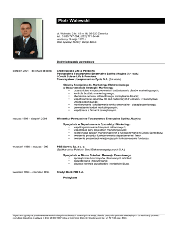 Piotr Walewski ul. Wolności 2 bl. 15 m 16, 05-220 Zielonka tel.: 0 695 747 094; (022) 771 84 44 urodzony: 3 maja 1976 r. stan cywilny: żonaty, dwoje dzieci Doświadczenie zawodowe sierpień 2001 – do chwili obecnej Credit Suisse Life & Pensions Powszechne Towarzystwo Emerytalne Spółka Akcyjna (1/4 etatu) i Credit Suisse Life & Pensions Towarzystwo Ubezpieczeń na Życie S.A. (3/4 etatu) Główny Specjalista ds. Marketingu Elektronicznego w Departamencie Strategii i Marketingu uczestnictwo w opracowywaniu i budżetowaniu planów marketingowych; kontrola budżetu marketingowego; stworzenie serwisu internetowego, zarządzanie treścią; współtworzenie raportów dla rad nadzorczych Funduszu i Towarzystwa Ubezpieczeniowego; monitorowanie i analizowanie rynku emerytalno - ubezpieczeniowego; prowadzenie badań marketingowych; współpraca z firmami zewnętrznymi. marzec 1999 – sierpień 2001 Winterthur Powszechne Towarzystwo Emerytalne Spółka Akcyjna Specjalista w Departamencie Sprzedaży i Marketingu współorganizowanie kampanii reklamowych; współpraca przy projektach marketingowych; koordynacja działań marketingowych z funkcjonowaniem Działu Sprzedaży; tworzenie procedur funkcjonowania departamentu i firmy; tworzenie prezentacji relacjonujących funkcjonowanie funduszu. wrzesień 1998 – marzec 1999 PSE-Serwis Sp. z o. o. (Spółka-córka Polskich Sieci Elektroenergetycznych S.A.) Specjalista w Biurze Szkoleń i Rozwoju Zawodowego sporządzanie kosztorysów planowanych szkoleń; budżetowanie i fakturowanie; bieżąca kontrola przychodów i wydatków Biura. kwiecień 1994 – czerwiec 1994 Kredyt Bank PBI S.A. Praktykant Wyrażam zgodę na przetwarzanie moich danych osobowych zawartych w mojej ofercie pracy dla potrzeb niezbędnych do realizacji procesu rekrutacji (zgodnie z ustawą z dnia 29.08.1997 roku o Ochronie Danych Osobowych Dz. U. Nr 133 poz. 883). Wykształcenie czerwiec 2001 Wyższa Szkoła Ubezpieczeń i Bankowości w Warszawie; dyplom magistra, specjalność: bankowość luty 1999 Wyższa Szkoła Ubezpieczeń i Bankowości w Warszawie; dyplom licencjata Umiejętności znajomość specyfiki procesów marketingu, sprzedaży, obsługi klienta oraz procesów wewnętrznych przedsiębiorstwa; umiejętność kierowania zespołem; język angielski - zaawansowany; umiejętność tworzenia stron internetowych w HTML; bardzo wysoka umiejętność obsługi komputera: MS Office (Word, Excel, Power Point), Adobe Photoshop, Namo WebEditor, inne znajomość technik marketingu; doskonałe zdolności interpersonalne; zdolność kreatywnego myślenia, analizowania i szybkiego uczenia się. Szkolenia z: Controlling marketingowy - warsztaty dla menedżerów marketingu i sprzedaży, IIR Jak zarabiać więcej na dotychczasowych klientach - seminarium Zarządzanie Treścią w Intranecie i Internecie – warsztaty ECU Marketing Finmarketing - odkrywanie potencjału baz danych – kongres ECU Markating Crystal Reports – szkolenie Altkom Akademia MS Outlook 97 - szkolenie OSI CompuTrain MS Excel 97 - szkolenie OSI CompuTrain Osiągnięcia zawodowe Samodzielne wykonanie i późniejszy rozwój serwisu internetowego spółek Credit Suisse Life & Pensions w Polsce; Stworzenie i rozwój programu ‘Karta Klienta Credit Suisse’ spełniającego funkcję cross-sellingu oraz umożliwiającego prostą i szybką obsługę klientów za pośrednictwem systemów SMS i IVR. Przeprowadzenie w Internecie kampanii brandowych i produktowych, m in. kampanii skierowanej do ludzi młodych, przygotowanej we współpracy z wortalem młodzieżowym Korba.pl oraz kampanii produktowej nowego ubezpieczenia. Nawiązanie współpracy w wortalem finansowym Expander.pl, we współpracy z którym uruchomiliśmy sprzedaż otwartego funduszu emerytalnego przez Internet. Opracowanie strategii Grupy Credit Suisse Life & Pensions w Polsce w zakresie działań z zakresu e-commerce, na podstawie której zarządy spółek podjęły decyzję rozbudowy serwisu internetowego o elementy z obszarów: obsługi klienta, sprzedaży produktów za pośrednictwem Internetu, czy budowę ekstranetu – narzędzia obsługującego sieć agentów ubezpieczeniowych. Tworzenie od kilku lat raportów dla rad nadzorczych spółek Credit Suisse Life & Pensions. Tworzenie i produkcja materiałów drukowanych we współpracy z agencjami BTL. Przygotowanie wielu prac graficznych, m. in. kart klienta, kart agenta, grafik i bannerów na www.credit-suisse.pl, oficjalnego logo międzynarodowych zawodów żużlowych Winterthur Cup oraz wiele innych. Wyrażam zgodę na przetwarzanie moich danych osobowych zawartych w mojej ofercie pracy dla potrzeb niezbędnych do realizacji procesu rekrutacji (zgodnie z ustawą z dnia 29.08.1997 roku o Ochronie Danych Osobowych Dz. U. Nr 133 poz. 883).