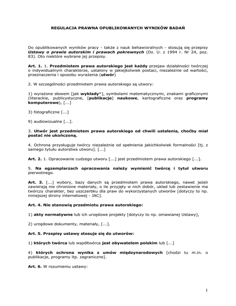 REGULACJA PRAWNA OPUBLIKOWANYCH WYNIKÓW BADAŃ Do opublikowanych wyników pracy - także z nauk behawioralnych - stosują się przepisy Ustawy o prawie autorskim i prawach pokrewnych (Dz. U. z 1994 r. Nr 24, poz. 83). Oto niektóre wybrane jej przepisy. Art. 1. 1. Przedmiotem prawa autorskiego jest każdy przejaw działalności twórczej o indywidualnym charakterze, ustalony w jakiejkolwiek postaci, niezależnie od wartości, przeznaczenia i sposobu wyrażenia (utwór) 2. W szczególności przedmiotem prawa autorskiego są utwory: 1) wyrażone słowem [jak wykłady*], symbolami matematycznymi, znakami graficznymi (literackie, publicystyczne, [publikacje] naukowe, kartograficzne oraz programy komputerowe), [...] 3) fotograficzne [...] 9) audiowizualne [...]. 3. Utwór jest przedmiotem prawa autorskiego od chwili ustalenia, choćby miał postać nie ukończoną. 4. Ochrona przysługuje twórcy niezależnie od spełnienia jakichkolwiek formalności [tj. z samego tytułu autorstwa utworu]. [...] Art. 2. 1. Opracowanie cudzego utworu [...] jest przedmiotem prawa autorskiego [...]. 5. Na egzemplarzach opracowania należy wymienić twórcę i tytuł utworu pierwotnego. Art. 3. [...] wybory, bazy danych są przedmiotem prawa autorskiego, nawet jeżeli zawierają nie chronione materiały, o ile przyjęty w nich dobór, układ lub zestawienie ma twórczy charakter, bez uszczerbku dla praw do wykorzystanych utworów [dotyczy to np. niniejszej strony internetowej - JAC]. Art. 4. Nie stanowią przedmiotu prawa autorskiego: 1) akty normatywne lub ich urzędowe projekty [dotyczy to np. omawianej Ustawy], 2) urzędowe dokumenty, materiały, [...]. Art. 5. Przepisy ustawy stosuje się do utworów: 1) których twórca lub współtwórca jest obywatelem polskim lub [...] 4) których ochrona wynika z umów międzynarodowych [chodzi tu m.in. o publikacje, programy itp. zagraniczne]. Art. 6. W rozumieniu ustawy: 1 1) utworem opublikowanym jest utwór, który za zezwoleniem twórcy został zwielokrotniony i którego egzemplarze zostały udostępnione publicznie, [...] 3) utworem rozpowszechnionym jest utwór, który za zezwoleniem twórcy został udostępniony publicznie [jak np. niniejsza strona internetowa]. Art. 8. 1. Prawo autorskie przysługuje twórcy, o ile ustawa nie stanowi inaczej [zob. niż. pkt. 11 i 12]. Art. 9. 2. Każdy ze współtwórców może wykonywać prawo autorskie do swojej części utworu mającej samodzielne znaczenie, bez uszczerbku dla praw pozostałych współtwórców. Art. 11. Autorskie prawa majątkowe do utworu zbiorowego, w szczególności do encyklopedii lub publikacji periodycznej [tu należą m.in. czasopisma naukowe!], przysługują producentowi lub wydawcy, a do poszczególnych części mających samodzielne znaczenie [jak hasła encyklopedyczne] - ich twórcom. Domniemywa się, że producentowi lub wydawcy przysługuje prawo do [ogólnego] tytułu [całości]. Art. 12. 1. [...] Pracodawca, którego pracownik stworzył utwór w wyniku wykonywania obowiązków ze stosunku pracy, nabywa z chwilą przyjęcia utworu autorskie prawa majątkowe w granicach wynikających z celu umowy o pracę i zgodnego zamiaru stron. [...] 3. Jeśli umowa o pracę nie stanowi inaczej, z chwilą przyjęcia utworu pracodawca nabywa wartość przedmiotu, na którym utwór utrwalono [np. maszynopis, dyskietkę z tekstem, programem, etc.]. Art. 14. 1. [...] Instytucji naukowej przysługuje pierwszeństwo opublikowania utworu naukowego pracownika, który stworzył ten utwór w wyniku wykonywania obowiązków ze stosunku pracy. Twórcy przysługuje prawo do wynagrodzenia [przy czym w rozliczeniu powinno być zaznaczone, że to określone honorarium otrzymał za prawo autorskie, co wpływa na niższy wymiar podatku od zatrudnionego pracownika]. Pierwszeństwo opublikowania wygasa, jeżeli w ciągu sześciu miesięcy od dostarczenia utworu nie zawarto z twórcą umowy o wydanie utworu, albo jeżeli w okresie dwóch lat od daty jego przyjęcia utwór nie został opublikowany. 2. Instytucja naukowa może, bez odrębnego wynagrodzenia, korzystać z materiału naukowego zawartego w utworze, o którym mowa w ust. 1, oraz udostępniać ten materiał osobom trzecim, jeżeli to wynika z uzgodnionego przeznaczenia utworu lub zostało postanowione w umowie. [Poza tym] Art. 17. [...] T w ó r c y przysługuje wyłączne prawo do korzystania z utworu i rozporządzania nim na wszystkich polach eksploatacji oraz do wynagrodzenia za korzystanie z utworu. Art. 23. Bez zezwolenia twórcy w o l n o n i e o d p ł a t n i e korzystać z już rozpowszechnionego utworu w zakresie własnego użytku osobistego [na tej zasadzie wolno dla siebie sporządzać np. kopie kserograficzne publikacji naukowych]. [...] Art. 25. 1. Wolno rozpowszechniać w celach informacyjnych w prasie [np. czasopismach przeglądowych jak Wiedza i Życie, Kosmos czy Wszechświat], radiu i telewizji: 1) już rozpowszechnione a) sprawozdania o aktualnych wydarzeniach, b) 2 aktualne artykuły i wypowiedzi na tematy polityczne, gospodarcze i społeczne, c) aktualne zdjęcia reporterskie,.[...] 3) przeglądy publikacji i utworów rozpowszechnionych, [...] 5) krótkie streszczenia rozpowszechnionych utworów; [pojęcie „krótkości” jest oczywiście rzeczą interpretacji; wydaje się rozsądne przyjąć, że streszczenie nie może być obszerniejsze niż 20% oryginału], [...] 3. Rozpowszechnianie utworów na podstawie ust. 1 jest dozwolone zarówno w oryginale, jak i w tłumaczeniu. Art. 26. Wolno w sprawozdaniach o aktualnych wydarzeniach przytaczać fragmenty utworów udostępnianych podczas tych wydarzeń, jednakże w granicach uzasadnionych celem informacji. Art. 27. Instytucje naukowe i oświatowe mogą, w celach dydaktycznych lub prowadzenia własnych badań, korzystać z opublikowanych utworów w oryginale i w tłumaczeniu oraz sporządzać w tym celu egzemplarze fragmentów opublikowanego utworu. Art. 29. 1. Wolno przytaczać w utworach stanowi