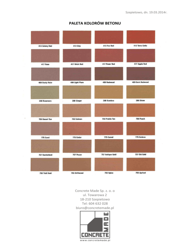 Szepietowo, dn. 19.03.2014r. PALETA KOLORÓW BETONU Concrete Made Sp. z. o. o ul. Towarowa 2 18-210 Szepietowo Tel: 604 632 028 [email protected] Szepietowo, dn. 19.03.2014r. PALETA KOLORÓW BETONU UWAGA: Finalny kolor betonu może się różnić od odcienia barw podanych we wzorniku. Istnieje możliwość ustalenia intensywności koloru betonu. Concrete Made Sp. z. o. o ul. Towarowa 2 18-210 Szepietowo Tel: 604 632 028 [email protected]
