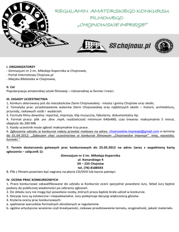 I. ORGANIZATORZY - Gimnazjum nr 2 im. Mikołaja Kopernika w Chojnowie, - Portal Internetowy Chojnow.pl - Miejska Biblioteka w Chojnowie, II. Cel Popularyzacja amatorskiej sztuki filmowej – różnorodnej w formie i treści. III. ZASADY UCZESTNICTWA 1. Konkurs skierowany jest do mieszkaoców Ziemi Chojnowskiej - miasta i gminy Chojnów oraz okolic. 2. Tematyka prac: przedstawienie walorów Ziemi Chojnowskiej oraz najbliższych okolic – historii, architektury, przyrody, ciekawych osób i wydarzeo. 3. Formuła filmu dowolna: reportaż, impresja, klip muzyczny, fabularny, dokumentalny itp. 4. Format pracy: plik .avi .divx .mp4; rozdzielczośd minimum 640x480; czas trwania: maksymalnie 5 minut, objętośd do 200 MB. 5. Każdy uczestnik może zgłosid maksymalnie trzy prace. 6. Zgłoszenie udziału w konkursie należy przesład mailowo na adres: [email protected] w terminie do 01.04.2012: „Zgłaszam chęć uczestnictwa w konkursie filmowym „Chojnowskie Impresje”. Imię, nazwisko, kontakt.” 7. Termin dostarczenia gotowych prac konkursowych do 25.05.2012 na adres (wraz z wypełnioną kartą zgłoszenia – załącznik 1): Gimnazjum nr 2 im. Mikołaja Kopernika ul. Konarskiego 4 59 – 225 Chojnów tel. (76) 8188593 8. Plik z filmem powinien byd nagrany na płycie CD/DVD lub karcie pamięci. IV. OCENA PRAC KONKURSOWYCH 1. Prace konkursowe zakwalifikowane do udziału w Konkursie oceni specjalnie powołane Jury. Skład Jury będzie podany do publicznej wiadomości po zebraniu zgłoszeo. 2. Do składu Jury nie mogą byd powołane osoby, których praca będzie brała udział w konkursie. 3. Decyzje Jury są ostateczne i niepodważalne. Jury podejmuje decyzję większością głosów. 4. Kryteria oceny prac konkursowych: a. spełnienie warunków formalnych określonych w regulaminie b. ogólne artystyczne wrażenie czyli kreatywnośd, ciekawe przedstawienie tematu, oryginalnośd, jakośd materiału. V. NAGRODY 1. Nagrody wręczone zostaną na Pokazie Finałowym w czerwcu 2012. 2. Nagrody rzeczowe zostaną przydzielone za 3 pierwsze miejsca. Mogą zostad przyznane również wyróżnienia. VI. INNE POSTANOWIE 1. Wzięcie przez uczestnika udziału w Konkursie oznacza bezwarunkową zgodę na postanowienia niniejszego Regulaminu. 2. Organizatorzy może usunąd pracę uczestnika z Konkursu z powodu nieprzestrzegania zasad regulaminu lub ze względu na znajdujące się w nim obraźliwe treści. 3. W przypadku niewyłonienia przez Jury Konkursu zwycięzcy lub otrzymania niewystarczającej liczby zgłoszeo, Organizatorzy zastrzegają sobie możliwośd wydłużenia terminu zgłaszania prac i przeniesienia finału Konkursu na późniejszy termin. 4. Autor pracy konkursowej wyraża zgodę na wykonanie kopii filmu, emitowanie swojej pracy na potrzeby konkursu np.: pokazów filmowych w trakcie trwania Konkursu oraz w okresie pokonkursowym (Dni Chojnowa), odbywających się z inicjatywy Organizatorów. 5. Autor pracy wyraża zgodę na wykorzystanie zdjęd i fragmentów filmów w materiałach reklamowych oraz prezentacjach promujących Konkurs. 6. Ostateczna interpretacja niniejszego Regulaminu należy do Organizatorów. Załącznik 1. KARTA ZGŁOSZENIA Dane osobowe uczestnika Konkursu: Imię .............................................. Nazwisko ...................................................... adres ul. ......................................................... nr domu .................. nr mieszkania .................... Kod pocztowy ...................................... Miejscowośd.................................................................. Telefon kontaktowy: .............................................................. Tytuł zgłoszonej pracy .......................................... Wyrażam zgodę na przetwarzanie moich danych osobowych ....................................................... podpis uczestnika ….……………………………………............ podpis prawnego opiekuna Jednocześnie oświadczam, że jestem autorem/współautorem zgłoszonej przeze mnie pracy (posiadam zgodę autora na wykorzystanie muzyki) oraz przysługują mi do niego nieograniczone prawa autorskie. Ponadto zgłoszona praca nie była wykonana na odpłatne zlecenie. WAŻNY KOMUNIKAT (PRAWA AUTORSKIE DO MUZYKI W FILMIE): Szukasz darmowej muzyki, którą mógłbyś wykorzystad w swoim projekcie filmowym? Znajdziesz ją w bazie 100.000 utworów na portalu www.jamendo.com. Warunkiem niekomercyjnego wykorzystania jest podanie autora utworu. Bogactwo gatunków muzycznych, proste wyszukiwanie - więcej na stronie internetowej (dostępna w języku polskim).