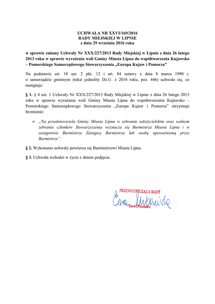 UCHWAŁA NR XXVI/169/2016 RADY MIEJSKIEJ W LIPNIE z dnia 29 września 2016 roku w sprawie zmiany Uchwały Nr XXX/227/2013 Rady Miejskiej w Lipnie z dnia 26 lutego 2013 roku w sprawie wyrażenia woli Gminy Miasta Lipna do współtworzenia Kujawsko – Pomorskiego Samorządowego Stowarzyszenia „Europa Kujaw i Pomorza” Na podstawie art. 18 ust. 2 pkt. 12 i art. 84 ustawy z dnia 8 marca 1990 r. o samorządzie gminnym (tekst jednolity Dz.U. z 2016 roku, poz. 446) uchwala się, co następuje: § 1. § 4 ust. 1 Uchwały Nr XXX/227/2013 Rady Miejskiej w Lipnie z dnia 26 lutego 2013 roku w sprawie wyrażenia woli Gminy Miasta Lipna do współtworzenia Kujawsko – Pomorskiego Samorządowego Stowarzyszenia „Europa Kujaw i Pomorza” otrzymuje brzmienie: • „Na przedstawiciela Gminy Miasta Lipna w zebraniu założycielskim oraz walnym zebraniu członków Stowarzyszenia wyznacza się Burmistrza Miasta Lipna i w zastępstwie Burmistrza Zastępcę Burmistrza lub osobę upoważnioną przez Burmistrza”. § 2. Wykonanie uchwały powierza się Burmistrzowi Miasta Lipna. § 3. Uchwała wchodzi w życie z dniem podjęcia.