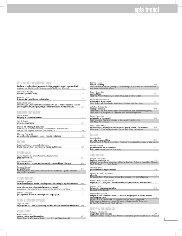 spis treści dział lata nauki krystiana lupy kraków tętnił życiem. wspomnienia marzenny marii smoleńskiej z Marzenną Marią Smoleńską rozmawia Waldemar Wasztyl 2 Waldemar Wasztyl studia krystiana lupy 8 Krystian Lupa fragmenty z archiwum rękopisów 17 Leszek Piotr Skiba inscenizacja „nadobniś i koczkodanów” st. i. witkiewicza w teatrze jeleniogórskim jako propozycja interpretacji i modelu teatru 25 żądanie antygony Judith Butler kłopoty z zakazem incestu 31 Judith Butler cielesne wyznania 34 śmierć na własnych prawach rozmawiają Mateusz Borowski, Paweł Dybel, Adam Ostolski, Małgorzata Sugiera, Weronika Szczawińska 39 Mateusz Borowski potomkowie antygony. teatr i relacje rodzinne 45 Paweł Schreiber cudza klasa Teatr na Woli w Warszawie: Nasza klasa, reż. Ondrej Spišák 95 Monika Kwaśniewska śmiertelna wyprzedaż Teatr Polski we Wrocławiu: Kazimierz i Karolina, reż. Jan Klata 97 Żelisław Żelisławski niezapominanie 100 Teatr Polski we Wrocławiu: Szosa Wołokołamska, reż. Barbara Wysocka; Teatr Polski w Bydgoszczy: Łagodna, reż. Barbara Wysocka Jakub Papuczys patrzenie w ciemność Teatr im. Jana Kochanowskiego w Opolu: Zmierzch bogów, reż. Maja Kleczewska 103 Aneta Mancewicz blisko-wizja: pół wieku videoteatru „poza” lothe i lachmanna Videoteatr „Poza” w Warszawie: Zgrzyt, reż. Piotr Lachmann 105 taniec Anna Królica not about everything 109 Ciało/Umysł. 9. Międzynarodowy Festiwal Tańca Współczesnego w Warszawie forum Krystyna Duniec, Joanna Krakowska trans-sfer. dyskurs intymny w sferze publicznej Joanna Jopek dream. factory 92 Teatr Dramatyczny im. Jerzego Szaniawskiego w Wałbrzychu: Gwiazda śmierci, reż. Krzysztof Garbaczewski 52 grotowski Witold Mrozek polski taniec na platformie Polska Platforma Tańca w Poznaniu 111 zagranica Agata Adamiecka-Sitek, Weronika Szczawińska płeć performera 56 Łucja Iwanczewska bity na śmierć. etyka niezłomności grotowskiego i lacana 63 Anna R. Burzyńska życie za dwieście lat 114 Volksbühne am Rosa-Luxemburg Platz w Berlinie: Żołnierze oraz Nach Moskau! Nach Moskau!, reż. Frank Castorf Tadeusz Kornaś po grotowsku Stowarzyszenie Teatralne Chorea w Łodzi: Grotowski – próba odwrotu, reż. Tomasz Rodowicz 66 Thomas Irmer po moskiewskiej premierze 116 Dorota Krzywicka-Kaindel obsesja Schauspielhaus Wien: Bruno Schulz: Der Messias, reż. Michał Zadara 119 cunningham Jadwiga Majewska centrum swojego. merce cunningham albo uwagi o myśleniu ciałem 68 tors: nie ma stałych punktów w przestrzeni z Merce’em Cunninghamem rozmawia Jacqueline Lesschaeve 74 Joanna Szymajda pożegnanie merce’a cunninghama w paryżu 77 kino szekspirowskie Olga Katafiasz zwycięstwo zła. „sen nocy letniej” maksa reinhardta i williama dieterle Jolanta Łada lohengrin eksperymentalny Bayreuther Festspiele 123 Przemysław Strożek magia teatru w malarstwie XIX wieku. od jacques’a-louisa davida do adolpha appii 125 Museo di arte moderna e contemporenae di Trento e Rovereto: Dalla scena al dipinto. La magia del teatro nella pittura dell’Ottocento. Da David a Delacroix, da Füssli a Degas 80 teatr w książkach repertuar Katarzyna Fazan czarny mózg warlikowskiego Nowy Teatr w Warszawie: Koniec, reż. Krzysztof Warlikowski Bettina Kerl, Michał Zadara część piąta. „mesjasz” brunona schulza: performans nieobecności 121 87 Krzysztof Bielawski ciągle ten sam dionizos 129 Aleksis Solomos, Święty Bachus. Nieznane lata teatru greckiego 300 p.n.e – 1600 n.e 1