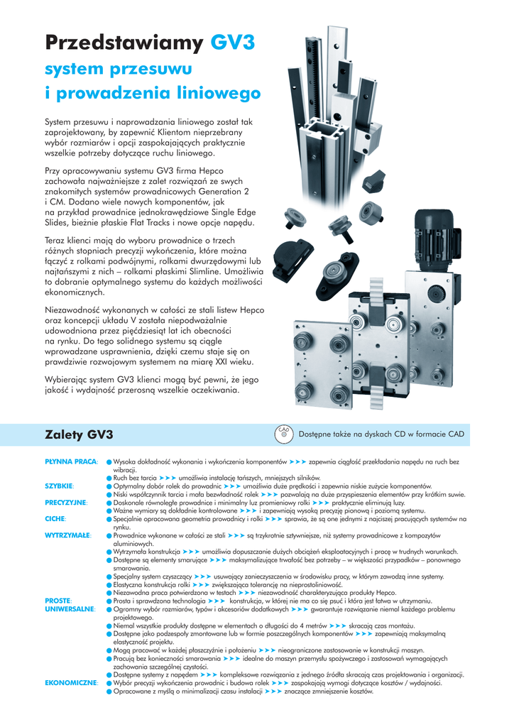 Przedstawiamy GV3 system przesuwu i prowadzenia liniowego System przesuwu i naprowadzania liniowego zosta∏ tak zaprojektowany, by zapewniç Klientom nieprzebrany wybór rozmiarów i opcji zaspokajajàcych praktycznie wszelkie potrzeby dotyczàce ruchu liniowego. Przy opracowywaniu systemu GV3 firma Hepco zachowa∏a najwa˝niejsze z zalet rozwiàzaƒ ze swych znakomitych systemów prowadnicowych Generation 2 i CM. Dodano wiele nowych komponentów, jak na przyk∏ad prowadnice jednokraw´dziowe Single Edge Slides, bie˝nie p∏askie Flat Tracks i nowe opcje nap´du. Teraz klienci majà do wyboru prowadnice o trzech ró˝nych stopniach precyzji wykoƒczenia, które mo˝na ∏àczyç z rolkami podwójnymi, rolkami dwurz´dowymi lub najtaƒszymi z nich – rolkami p∏askimi Slimline. Umo˝liwia to dobranie optymalnego systemu do ka˝dych mo˝liwoÊci ekonomicznych. NiezawodnoÊç wykonanych w ca∏oÊci ze stali listew Hepco oraz koncepcji uk∏adu V zosta∏a niepodwa˝alnie udowodniona przez pi´çdziesiàt lat ich obecnoÊci na rynku. Do tego solidnego systemu sà ciàgle wprowadzane usprawnienia, dzi´ki czemu staje si´ on prawdziwie rozwojowym systemem na miar´ XXI wieku. Wybierajàc system GV3 klienci mogà byç pewni, ˝e jego jakoÊç i wydajnoÊç przerosnà wszelkie oczekiwania. Zalety GV3 P¸YNNA PRACA: SZYBKIE: PRECYZYJNE: CICHE: WYTRZYMA¸E: PROSTE: UNIWERSALNE: EKONOMICZNE: CAD Dost´pne tak˝e na dyskach CD w formacie CAD ● Wysoka dok∏adnoÊç wykonania i wykoƒczenia komponentów ➤➤➤ zapewnia ciàg∏oÊç przek∏adania nap´du na ruch bez wibracji. ● Ruch bez tarcia ➤➤➤ umo˝liwia instalacj´ taƒszych, mniejszych silników. ● Optymalny dobór rolek do prowadnic ➤➤➤ umo˝liwia du˝e pr´dkoÊci i zapewnia niskie zu˝ycie komponentów. ● Niski wspó∏czynnik tarcia i ma∏a bezw∏adnoÊç rolek ➤➤➤ pozwalajà na du˝e przyspieszenia elementów przy krótkim suwie. ● Doskonale równoleg∏e prowadnice i minimalny luz promieniowy rolki ➤➤➤ praktycznie eliminujà luzy. ● Wa˝ne wymiary sà dok∏adnie kontrolowane ➤➤➤ i zapewniajà wysokà precyzj´ pionowà i poziomà systemu. ● Specjalnie opracowana geometria prowadnicy i rolki ➤➤➤ sprawia, ˝e sà one jednymi z najciszej pracujàcych systemów na rynku. ● Prowadnice wykonane w ca∏oÊci ze stali ➤➤➤ sà trzykrotnie sztywniejsze, ni˝ systemy prowadnicowe z kompozytów aluminiowych. ● Wytrzyma∏a konstrukcja ➤➤➤ umo˝liwia dopuszczanie du˝ych obcià˝eƒ eksploatacyjnych i prac´ w trudnych warunkach. ● Dost´pne sà elementy smarujàce ➤➤➤ maksymalizujàce trwa∏oÊç bez potrzeby – w wi´kszoÊci przypadków – ponownego smarowania. ● Specjalny system czyszczàcy ➤➤➤ usuwajàcy zanieczyszczenia w Êrodowisku pracy, w którym zawodzà inne systemy. ● Elastyczna konstrukcja rolki ➤➤➤ zwi´kszajàca tolerancj´ na nieprostoliniowoÊç. ● Niezawodna praca potwierdzona w testach ➤➤➤ niezawodnoÊç charakteryzujàca produkty Hepco. ● Prosta i sprawdzona technologia ➤➤➤ konstrukcja, w której nie ma co si´ psuç i która jest ∏atwa w utrzymaniu. ● Ogromny wybór rozmiarów, typów i akcesoriów dodatkowych ➤➤➤ gwarantuje rozwiàzanie niemal ka˝dego problemu projektowego. ● Niemal wszystkie produkty dost´pne w elementach o d∏ugoÊci do 4 metrów ➤➤➤ skracajà czas monta˝u. ● Dost´pne jako podzespo∏y zmontowane lub w formie poszczególnych komponentów ➤➤➤ zapewniajà maksymalnà elastycznoÊç projektu. ● Mogà pracowaç w ka˝dej p∏aszczyênie i po∏o˝eniu ➤➤➤ nieograniczone zastosowanie w konstrukcji maszyn. ● Pracujà bez koniecznoÊci smarowania ➤➤➤ idealne do maszyn przemys∏u spo˝ywczego i zastosowaƒ wymagajàcych zachowania szczególnej czystoÊci. ● Dost´pne systemy z nap´dem ➤➤➤ kompleksowe rozwiàzania z jednego êród∏a skracajà czas projektowania i organizacji. ● Wybór precyzji wykoƒczenia prowadnic i budowa rolek ➤➤➤ zaspokajajà wymogi dotyczàce kosztów / wydajnoÊci. ● Opracowane z myÊlà o minimalizacji czasu instalacji ➤➤➤ znaczàce zmniejszenie kosztów. Spis treÊci Strona Budowa systemu 2-7 Przyk∏ady zastosowaƒ 8-16 Dobór komponentów systemu 17 Dane i wymiary poszczególnych komponentów Wózki 18-23 Prowadnice V 24-29 Prowadnice z belkà noÊnà 30-31 Rolki V 32-35 Nak∏adki uszczelniajàce, nak∏adki czyszczàce i smarownice 36-38 Zaciski mocujàce 39 Szyny p∏askie 40 Rolki podporowe 41-43 Prowadnice z´bate 44 Ko∏a z´bate 45 Wózki do nap´du pasowego, pasy i ko∏a nap´dowe 46-47 Wózki do nap´du z´batego 48-49 Przek∏adnie, silniki nap´dowe na pràd zmienny i zaciski 50-51 Komponenty dodatkowe i kontrolery pr´dkoÊci na pràd zmienny 52-53 Parametry i wymiary gotowych systemów Systemy prowadnic V 54-55 Systemy z rolkami podporowymi, prowadnicami z´batymi i ko∏ami z´batymi 56-57 Dane techniczne Obliczanie noÊnoÊci i ˝ywotnoÊci i przyk∏ady 58-62 Odkszta∏cenia prowadnic samonoÊnych 63 Obliczenia dla nap´dów dla wózków z nap´dem z´batym Monta˝ i regulacja systemów 64-65 66-67 Specyfikacje techniczne 68 Jak u˝ywaç tego katalogu Asortyment produktów G3 jest bardzo du˝y, wi´c aby pomóc czytelnikowi poruszaç si´ po tym katalogu wprowadzono nast´pujàce wskazówki: Standard Bearings Standard Bearings All Hepco Standard Bearings are compatible with all grades of Slide and although designed to be used with particular sizes of slide, may be "mixed and matched" in many instances. The following Bearing formats and fixing methods may be chosen to cater for most design requirements. which are fixed, Eccentric type (E), adjustable and Double Eccentric type (DE)*5 which have sufficient adjustment to enable a carriage to be disengaged from the Slide (see application drawing on page 8). The Twin Bearing type which is the default choice, comprises two individual d