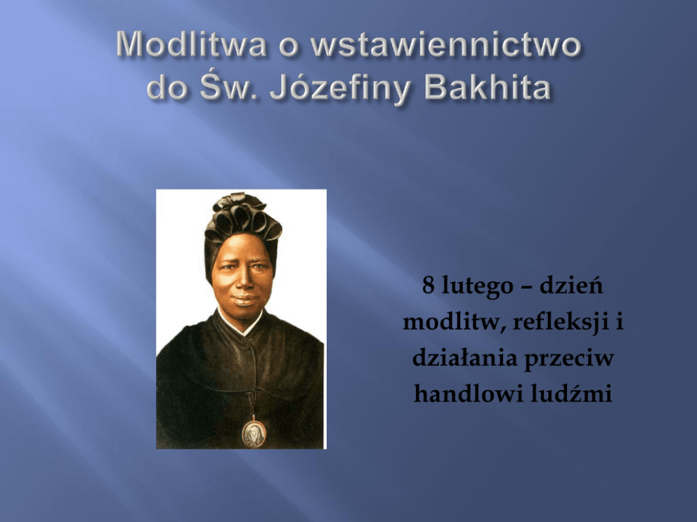 8 lutego – dzień modlitw, refleksji i działania przeciw handlowi ludźmi Józefino Bakhito, która sama nosiłaś kajdany niewoli, prosimy Cię o wstawiennictwo za: - nasze siostry i braci na całym świecie, - dzieci, kobiety i mężczyzn zmuszanych do życia i pracy w warunkach niewolnictwa wbrew minimalnym normom pracowniczym i ludzkim, - imigrantów, których okoliczności społeczne, ekonomiczne i polityczne zmusiły do przyjęcia niewolnictwa, - kobiety zmuszane do małżeństwa, - kobiety i dzieci zmuszane do prostytucji, - dzieci i dorosłych pozbawionych wolności zmuszanych do żebractwa i przestępstw. Powierzamy Ci rodziny, które oczekują powrotów swoich bliskich, - za tych, którzy zginęli w męczarniach i poniżeniu, - tych, którzy niosą w sobie tajemnicę zranienia, prosimy o łaskę uzdrowienia i siłę do życia. I choć świat chwali się postępem to ”niewolnictwo jest wciąż głęboką raną na człowieczeństwie”. Św. Józefino wstawiaj się u Jezusa Chrystusa o łaskę dla nas, byśmy nie byli obojętni i nie zapominali o naszych siostrach i braciach. Prosimy o łaskę przemiany serca dla sprawców przemocy, którzy używają innych do wzbogacania się, dla których życie i cierpienie innych nic nie znaczy. Prosimy wzmacniaj wszystkich, którzy zwalczają ten proceder i pomagają doświadczonym ranami niewolnictwa i ich rodzinom. Nie pozwól nam być obojętnym! O odwagę i światło w walce z niewolnictwem, które obok nas i w nas. Ciebie prosimy… Oprac. S. Anna Bałchan SMI