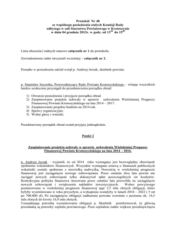 Protokół Nr 48 ze wspólnego posiedzenia stałych Komisji Rady odbytego w sali Starostwa Powiatowego w Krotoszynie w dniu 04 grudnia 2013r. w godz. od 1320 do 1545 Lista obecności radnych stanowi załącznik nr 1 do protokołu. Zawiadomienie radni otrzymali wcześniej – załącznik nr 2. Ponadto w posiedzeniu udział wziął p. Andrzej Jerzak, skarbnik powiatu. p. Stanisław Szczotka, Przewodniczący Rady Powiatu Krotoszyńskiego – witając wszystkich bardzo serdecznie przystąpił do przedstawienia porządku obrad: 1) Otwarcie posiedzenia i przyjęcie porządku obrad. 2) Zaopiniowanie projektu uchwały w sprawie uchwalenia Wieloletniej Prognozy Finansowej Powiatu Krotoszyńskiego na lata 2014 – 2017. 3) Zaopiniowanie projektu budżetu na 2014 rok. 4) Sprawy organizacyjne. 5) Wolne głosy i wnioski. Przedstawiony porządek obrad został przyjęty jednogłośnie. Punkt 2 Zaopiniowanie projektu uchwały w sprawie uchwalenia Wieloletniej Prognozy Finansowej Powiatu Krotoszyńskiego na lata 2014 – 2016. p. Andrzej Jerzak – wyjaśnił, że od 2014 roku wymagany jest bezwzględny obowiązek spełnienia wskaźników finansowych. Wszystkie wymagane ustawą o finansach publicznych wskaźniki zostały spełnione z niewielką nadwyżką. Nowością w wieloletniej prognozie finansowej jest zaciągnięcie nowego zobowiązania. Przez ostatnie dwa lata powiat nie zaciągał nowych zobowiązań tylko dokonywał spłat poszczególnych rat kredytów. Restrykcyjna polityka finansowa stosowana przez ostatnie lata pozwoliła na zaciągnięcie nowych zobowiązań i zwiększenie nakładów inwestycyjnych. Wobec powyższego postanowiono w wieloletniej prognozie finansowej ująć 3,5 mln złotych obligacji, które byłyby wyemitowane w roku przyszłym, a wykupione zostałyby w latach 2018 – 2022 ( 5 rat po 700.000 zł). Po zaciągnięciu obligacji zadłużenie powiatu wzrośnie z poziomu ok. 14,5 mln złotych do kwoty 16,9 mln złotych. Uzasadniając potrzebę wyemitowania obligacji p. Skarbnik poinformował, że główną przesłanką są potrzeby szpitala powiatowego. Poza szpitalem żadne większe przedsięwzięcia 2 nie są planowane. Dalej zwrócił uwagę, że zaplanowano na rok 2015 zamrożenie wydatków bieżących na poziomie roku 2014. Wieloletnia prognoza finansowa jest napięta w zakresie dochodów i wydatków bieżących, lecz realna. W dyskusji nikt nie zabrał głosu. Komisja Spraw Społecznych – powyższy projekt uchwały zaopiniowała pozytywnie jednogłośnie 7 głosami. Komisja Budżetowo – Gospodarcza i Rolnictwa – również pozytywnie, jednogłośnie 7 głosami zaopiniowała przedstawiony projekt uchwały. Punkt 3 Zaopiniowanie projektu budżetu na 2014 rok. p. Andrzej Jerzak – poinformował, iż dochody planowane są na poziomie 75 mln złotych, natomiast wydatki na poziomie 77,5 mln złotych. Deficyt budżetowy wyniesie 2,427 tys. złotych. DOCHODY: Budżet roku 2014 w zakresie dochodów jest jak najbardziej realny, a wątpliwości dotyczą tylko udziału powiatu w podatku dochodowym od osób fizycznych, który został wpisany do projektu budżetu na poziomie 10.430 tys. złotych. Plan roku bieżącego wynosi 9 mln złotych. Pan Skarbnik wyraził zadowolenie ze spływu podatku dochodowego w roku bieżącym, gdyż można przypuszczać, że założony plan znacznie zostanie przekroczony. W planowanym budżecie na rok przyszły nie założono większych dochodów z tytułu dotacji majątkowych, gdyż nie zakłada się rozdania środków unijnych. W dochodach majątkowych założono tylko kwotę 90 tys. złotych z tytułu sprzedaży nieruchomości w Koźminie Wlkp. Dalej podkreślił, iż rezerwą z której będzie można skorzystać w roku przyszłym jest 25% udział powiatu w sprzedaży mienia Skarbu Państwa. Wydział Geodezji, Kartografii, Katastru i Gospodarki Nieruchomościami przygotował kilka nieruchomości do sprzedaży min. w dniu 06 grudnia br. odbędzie się przetarg na sprzedaż Elewatora. Wadium zostało wpłacone więc można przypuszczać, że dojdzie do transakcji. Ze wspomnianej transakcji powiat może uzyskać dochód w wysokości 250 tys. złotych. Dochód w wysokości ok. 220 tys. złotych pozyskany zostanie ze środków Funduszu Pracy z 5% odpisu na dofinansowanie wynagrodzeń pracowników Powiatowego Urzędu Pracy. Innym dodatkowym dochodem będzie większa niż zakładano o kwotę ok. 250 tys. złotych subwencja oświatowa z uwagi na zwiększenie się liczby wychowanków Młodzieżowego Ośrodka Wychowawczego. Kończąc omawianie dochodów budżetu na rok 2014 p. Skarbnik zwrócił uwagę na bardzo niski poziom dotacji przekazywanych przez Wojewodę na wykonywane zadania rządowe. p. Albin Batycki – zapytał, czy subwencja oświatowa stanowi główne zagrożenie dla budżetu powiatu. 3 p. Andrzej Jerzak – subwencję oświatową skalkulowano na podstawie otrzymanych danych. Nie stanowi ona zagrożenia bezpośrednio dla budżetu roku 2014, lecz należy wziąć pod uwagę lata kolejne. Niż demograficzny spowodował, iż uczniów jest mniej, natomiast wydatki z tego tytułu nie spadają, a wręcz rosną. Ewentualnym zagrożeniem jest udział powiatu w podatku dochodowym od osób fizycznych. WYDATKI: p. Skarbnik – poinformował, że w roku 2014 wydatki zaplanowano na poziomie 77,5 mln złotych. Nadwyżkę operacyjną zaplanowano na poziomie 2,4 mln złotych. W porównaniu do roku 2013 zaplanowano dość istotny wzrost wydatków majątkowych, blisko 5 mln złotych. Przyczyną wzrostu wydatków jest rozbudowa i wyposażenie szpitala powiatowego (2,5 mln zł) oraz drogi (2 mln zł). Ponad 200 tys. złotych zaplanowano na dokończenie II etapu rozbudowy stołówki w DPS Baszków. W projekcie budżetu ujęto także 5% przyrost funduszu wynagrodzeń w odniesieniu do wszystkich jednostek. Wzrost płac nie dotyczy nauczycieli. Pomimo, iż nie przewidziano wzrostu wynagrodzeń nauczycieli, to w oświacie nastąpił największy przyrost płac. Bardzo ma