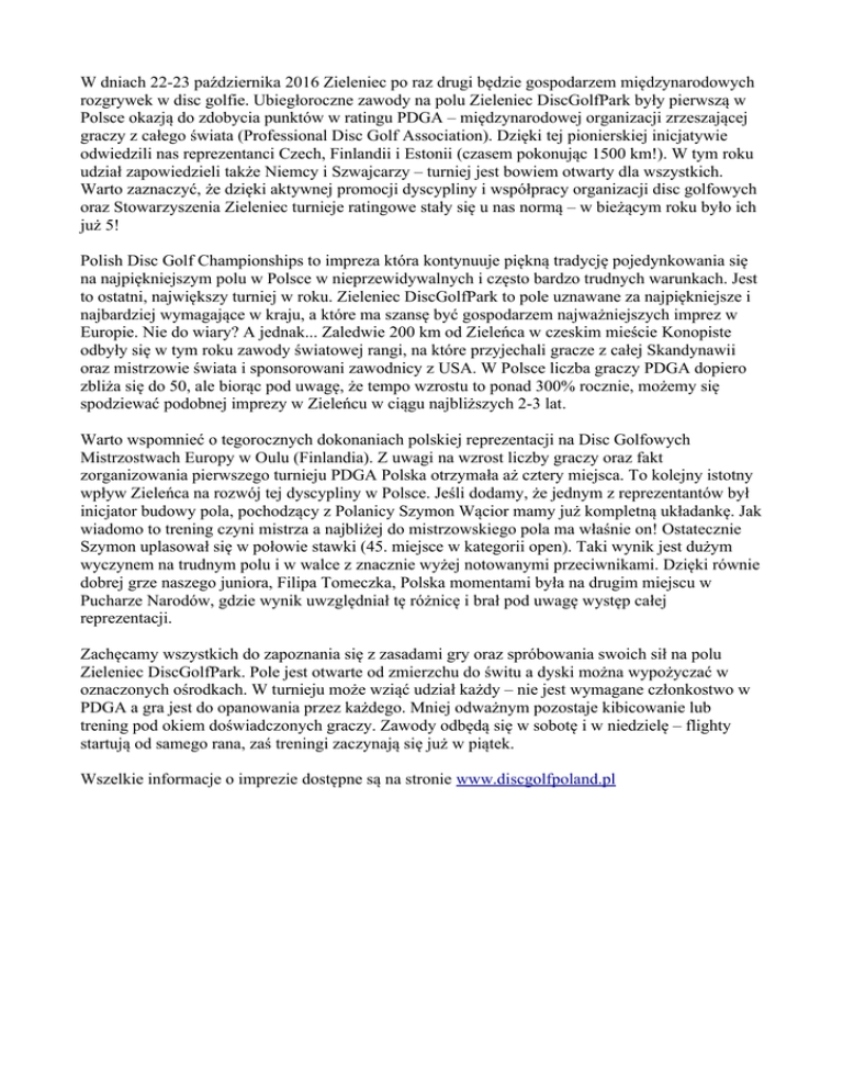 W dniach 22-23 października 2016 Zieleniec po raz drugi będzie gospodarzem międzynarodowych rozgrywek w disc golfie. Ubiegłoroczne zawody na polu Zieleniec DiscGolfPark były pierwszą w Polsce okazją do zdobycia punktów w ratingu PDGA – międzynarodowej organizacji zrzeszającej graczy z całego świata (Professional Disc Golf Association). Dzięki tej pionierskiej inicjatywie odwiedzili nas reprezentanci Czech, Finlandii i Estonii (czasem pokonując 1500 km!). W tym roku udział zapowiedzieli także Niemcy i Szwajcarzy – turniej jest bowiem otwarty dla wszystkich. Warto zaznaczyć, że dzięki aktywnej promocji dyscypliny i współpracy organizacji disc golfowych oraz Stowarzyszenia Zieleniec turnieje ratingowe stały się u nas normą – w bieżącym roku było ich już 5! Polish Disc Golf Championships to impreza która kontynuuje piękną tradycję pojedynkowania się na najpiękniejszym polu w Polsce w nieprzewidywalnych i często bardzo trudnych warunkach. Jest to ostatni, największy turniej w roku. Zieleniec DiscGolfPark to pole uznawane za najpiękniejsze i najbardziej wymagające w kraju, a które ma szansę być gospodarzem najważniejszych imprez w Europie. Nie do wiary? A jednak... Zaledwie 200 km od Zieleńca w czeskim mieście Konopiste odbyły się w tym roku zawody światowej rangi, na które przyjechali gracze z całej Skandynawii oraz mistrzowie świata i sponsorowani zawodnicy z USA. W Polsce liczba graczy PDGA dopiero zbliża się do 50, ale biorąc pod uwagę, że tempo wzrostu to ponad 300% rocznie, możemy się spodziewać podobnej imprezy w Zieleńcu w ciągu najbliższych 2-3 lat. Warto wspomnieć o tegorocznych dokonaniach polskiej reprezentacji na Disc Golfowych Mistrzostwach Europy w Oulu (Finlandia). Z uwagi na wzrost liczby graczy oraz fakt zorganizowania pierwszego turnieju PDGA Polska otrzymała aż cztery miejsca. To kolejny istotny wpływ Zieleńca na rozwój tej dyscypliny w Polsce. Jeśli dodamy, że jednym z reprezentantów był inicjator budowy pola, pochodzący z Polanicy Szymon Wącior mamy już kompletną układankę. Jak wiadomo to trening czyni mistrza a najbliżej do mistrzowskiego pola ma właśnie on! Ostatecznie Szymon uplasował się w połowie stawki (45. miejsce w kategorii open). Taki wynik jest dużym wyczynem na trudnym polu i w walce z znacznie wyżej notowanymi przeciwnikami. Dzięki równie dobrej grze naszego juniora, Filipa Tomeczka, Polska momentami była na drugim miejscu w Pucharze Narodów, gdzie wynik uwzględniał tę różnicę i brał pod uwagę występ całej reprezentacji. Zachęcamy wszystkich do zapoznania się z zasadami gry oraz spróbowania swoich sił na polu Zieleniec DiscGolfPark. Pole jest otwarte od zmierzchu do świtu a dyski można wypożyczać w oznaczonych ośrodkach. W turnieju może wziąć udział każdy – nie jest wymagane członkostwo w PDGA a gra jest do opanowania przez każdego. Mniej odważnym pozostaje kibicowanie lub trening pod okiem doświadczonych graczy. Zawody odbędą się w sobotę i w niedzielę – flighty startują od samego rana, zaś treningi zaczynają się już w piątek. Wszelkie informacje o imprezie dostępne są na stronie www.discgolfpoland.pl