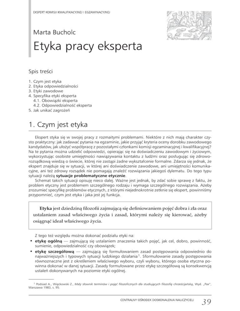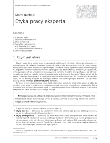 Spis treœci 1. Czym jest etyka 2. Etyka odpowiedzialnoœci 3. Etyki zawodowe 4. Specyfika etyki eksperta 4.1. Obowi¹zki eksperta 4.2. Odpowiedzialnoœæ eksperta 5. Jak unikaæ zagro¿eñ 1. Czym jest etyka Ekspert styka siê w swojej pracy z rozmaitymi problemami. Niektóre z nich maj¹ charakter czysto praktyczny: jak zadawaæ pytania na egzaminie, jakie przyj¹æ kryteria oceny dorobku zawodowego kandydatów, jak u³o¿yæ wspó³pracê z pozosta³ymi cz³onkami komisji egzaminacyjnej i kwalifikacyjnej? Na te pytania mo¿na udzieliæ odpowiedzi, opieraj¹c siê na doœwiadczeniu zawodowym i ¿yciowym, wykorzystuj¹c osobiste umiejêtnoœci nawi¹zywania kontaktu z ludŸmi oraz pos³uguj¹c siê zdroworozs¹dkow¹ wiedz¹ o œwiecie, której nie zast¹pi ¿adne wykszta³cenie formalne. Zdarza siê jednak, ¿e ekspert znajduje siê w sytuacji, w której ani doœwiadczenie zawodowe, ani umiejêtnoœci komunikacyjne, ani te¿ zdrowy rozs¹dek nie pomagaj¹ znaleŸæ rozwi¹zania jakiegoœ dylematu. Do tego typu sytuacji nale¿¹ sytuacje problematyczne etycznie. Schemat takich sytuacji opisujê nieco dalej. Wa¿ne jest jednak, by zdaæ sobie sprawê z faktu, ¿e problem etyczny jest problemem szczególnego rodzaju i wymaga szczególnego rozwi¹zania. A¿eby zrozumieæ specyfikê problemów etycznych, z którymi niejednokrotnie zetknie siê ekspert, powinniœmy przypomnieæ, czym jest etyka i jaka jest jej funkcja. Etyka jest dziedzin¹ filozofii zajmuj¹c¹ siê definiowaniem pojêæ dobra i z³a oraz ustalaniem zasad w³aœciwego ¿ycia i zasad, którymi nale¿y siê kierowaæ, a¿eby osi¹gn¹æ idea³ w³aœciwego ¿ycia. Z tego te¿ wzglêdu mo¿na dokonaæ podzia³u etyki na: • etykê ogóln¹ — zajmuj¹c¹ siê ustalaniem znaczenia takich pojêæ, jak cel, dobro, powinnoœæ, sumienie, odpowiedzialnoœæ czy obowi¹zek; • etykê szczegó³ow¹ — zajmuj¹c¹ siê formu³owaniem zasad postêpowania odpowiednio do najwa¿niejszych i typowych sytuacji ludzkiego dzia³ania 1. Sformu³owanie zasady postêpowania równoznaczne jest z okreœleniem w³aœciwego wyboru, czyli wyboru, którego osoba etyczna powinna dokonaæ w danej sytuacji. Zasady formu³owane przez etykê szczegó³ow¹ s¹ konsekwencj¹ ustaleñ dokonywanych na poziomie etyki ogólnej. 1 Podsiad A., Wiêckowski Z., Ma³y s³ownik terminów i pojêæ filozoficznych dla studiuj¹cych filozofiê chrzeœcijañsk¹, Wyd. „Pax”, Warszawa 1983, s. 95. 39 W powy¿szym ujêciu (istnieje bowiem wiele definicji etyki i wiele teorii etycznych) etykê nale¿y odró¿niæ od moralnoœci, która umo¿liwia ocenê ludzkiego postêpowania w kategoriach dobra i z³a 2. Konsekwencj¹ akceptacji pewnej zasady etycznej jest przyjêcie okreœlonych kategorii oceniania. Etyka w znaczeniu normatywnym poci¹ga zatem za sob¹ moralnoœæ — z etycznych zasad postêpowania wynikaj¹ moralne oceny, wzorce, nakazy i zakazy. Wydaje siê, ¿e — zw³aszcza we wspó³czesnym œwiecie, przy daleko posuniêtej specjalizacji pracy i podziale ról spo³ecznych — trudno mówiæ o jednolitym zbiorze regu³ kieruj¹cych postêpowaniem cz³owieka. Jednak ujêcie to stanowi punkt wyjœcia do dalszej definicji etyki. Jeœli bowiem przedmiotem etyki jest w³aœciwe (czy te¿, jak ujmowa³o to wielu myœlicieli), godne lub po prostu — dobre ¿ycie, mo¿na przyj¹æ, ¿e dla ka¿dej dziedziny ¿ycia powinny istnieæ regu³y, których zastosowanie umo¿liwi d¹¿enie do idea³u w tej dziedzinie. Kluczowym problemem etycznym jest problem wyboru, wystêpuj¹cy w jednej z dwóch postaci: albo jako problem wyboru jednego z dwóch rozwi¹zañ danego problemu w ramach jednego zbioru zasad etycznych, albo jako problem wyboru zbioru zasad etycznych, który znajduje zastosowanie w danej sytuacji. Pierwszy typ problemu wyboru ma postaæ dylematu decyzyjnego, który w konkretnej sytuacji nie musi wcale byæ trudny i daje siê zwykle rozwi¹zaæ w drodze systematycznej analizy treœci odpowiedniej zasady etycznej. Drugi typ problemu wyboru wydaje siê znacznie trudniejszy, zw³aszcza w sytuacjach, gdy wchodzi w grê zastosowanie ró¿nego typu zbiorów zasad, czyli — potocznie mówi¹c — ró¿nych etyk. Warto zwróciæ uwagê, ¿e etyczne dzia³anie mo¿e mieæ wiele Ÿróde³, które niekiedy okreœla siê jako Ÿród³a perswazyjnej mocy etyki: • sk³onnoœæ jednostki do konsekwentnego postêpowania wedle sta³ych regu³, co wyzwala poczucie uporz¹dkowania ¿ycia i konsolidacji osobowoœci; • normy przyjmowane przez cz³onków grupy, której czêœci¹ czuje siê jednostka; i wreszcie • sankcje przewidziane w danej grupie za odst¹pienie od uznawanych przez jej cz³onków zasad etycznych 3. Nale¿y pamiêtaæ, ¿e sankcje mog¹ przyjmowaæ zró¿nicowan¹ formê: — skupion¹ (jak na przyk³ad mandat za naruszenie przepisów ruchu drogowego) lub rozproszon¹ (jak na przyk³ad ogólna niechêæ rodziny z³o¿onej wy³¹cznie z katolików do jednego z jej cz³onków, który postanawia zostaæ œwiadkiem Jehowy); — materialn¹ (grzywna w postêpowaniu karnym) i moraln¹ (nagana); — zewnêtrzn¹ (wymówki ¿ony lub mê¿a) lub wewnêtrzn¹ (wyrzuty sumienia, poczucie winy). Z jednej strony wydaje siê oczywiste, ¿e wieloœæ Ÿróde³ perswazyjnej mocy etyki stanowi gwarancjê umocnienia skutecznoœci oddzia³ywania zasad etycznych. Z drugiej jednak ju¿ na pierwszy rzut oka zauwa¿amy, ¿e Ÿród³a mocy perswazyjnej etyki mog¹, poprzez sw¹ wieloœæ, prowadziæ do konfliktu poszczególnych zasad etycznych. Tak¹ w³aœnie sytuacjê nazwa³am na pocz¹tku sytuacj¹ problematyczn¹ etycznie. Sytuacja problematyczna etycznie to taka sytuacja, w której: • jednostka jest zmuszona dokonaæ wyboru jednego z mo¿liwych zachowañ (czyli dzia³añ lub zaniechañ); 2 3 Op. cit., s. 225. Ho³ówka J., Etyka w dzia³aniu, Wyd. Prószyñski i S-ka, Warszawa 2001, s. 26–27. 40 • jednostka uznaje co najmniej dwie zasady etyczne, które mog¹ byæ wyk