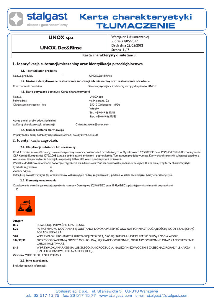 Karta charakterystyki TŁUMACZENIE UNOX spa Wersja nr 1 (tłumaczenie) Z dnia 23/05/2012 Druk dnia 23/05/2012 UNOX.Det&Rinse Strona 1 / 7 Karta charakterystyki substancji 1.Identyfikacja substancji/mieszaniny oraz identyfikacja przedsiębiorstwa 1.1. Identyfikator produktu Nazwa produktu ` UNOX.Det&Rinse 1.2. Istotne zidentyfikowane zastosowania substancji lub mieszaniny oraz zastosowania odradzane Przeznaczenie produktu Samo-wysychający środek czyszczący dla pieców UNOX 1.3. Dane dotyczące dostawcy Karty charakterystyki Nazwa Pełny adres Okręg administracyjny i kraj Adres e-mail osoby odpowiedzialnej za Kartę charakterystyki substancji UNOX spa via Majorana, 22 35010 Cadoneghe (PD) Włochy Tel. +39.049.8657511 Fax. +39.049.8657555 [email protected] 1.4. Numer telefonu alarmowego W przypadku pilnej potrzeby uzyskania informacji należy zwrócić się do 2.Identyfikacja zagrożeń. 2.1. Klasyfikacja substancji lub mieszaniny. Produkt został zakwalifikowany, jako niebezpieczny na mocy postanowień przedłożonych w Dyrektywach 67/548/EEC oraz 1999/45/EC i/lub Rozporządzeniu CLP Komisji Europejskiej 1272/2008 (wraz z późniejszymi zmianami i poprawkami). Tym samym produkt wymaga Karty charakterystyki substancji zgodnej z warunkami Rozporządzenia Komisji Europejskiej 1907/2006 wraz z późniejszymi zmianami. Wszelkie dodatkowe informacje dotyczące zagrożenia dla zdrowia oraz/lub dla środowiska podano w sekcjach 11 i 12 niniejszej Karty charakterystyki. Symbole zagrożenia: C Zwroty ryzyka: 35 Pełną listę zwrotów ryzyka (R) oraz zwrotów wskazujących rodzaj zagrożenia (H) podano w sekcji 16 niniejszej Karty charakterystyki. 2.2. Elementy oznakowania. Oznakowanie określające rodzaj zagrożenia na mocy Dyrektywy 67/548/EEC oraz 1999/45/EC z późniejszymi zmianami i poprawkami. C ŻRĄCY R35 S26 POWODUJE POWAŻNE OPARZENIA. W PRZYPADKU DOSTANIA SIĘ SUBSTANCJI DO OKA PRZEMYĆ OKO NATYCHMIAST DUŻĄ ILOŚCIĄ WODY I ZASIĘGNĄĆ PORADY LEKARZA. S28 W PRZYPADKU KONTAKTU SUBSTANCJI ZE SKÓRĄ, SKÓRĘ NATYCHMIAST PRZEMYĆ DUŻĄ ILOŚCIĄ WODY. S36/37/39 NOSIĆ ODPOWIEDNIĄ ODZIEŻ OCHRONNĄ, RĘKAWICE OCHRONNE, OKULARY OCHRONNE ORAZ ZABEZPIECZENIE CHRONIĄCE TWARZ. S45 W PRZYPADKU NARAŻENIA LUB ZŁEGO SAMOPOCZUCIA, NALEŻY NIEZWŁOCZNIE ZASIĘGNĄĆ PORADY LEKARZA — I JEŻELI TO MOŻLIWE, POKAZAĆ ETYKIETĘ. Zawiera: WODOROTLENEK POTASU 2.3. Inne zagrożenia. Brak dostępnych informacji. Stalgast sp. z o.o. ul. Staniewicka 5 03-310 Warszawa tel.: 22 517 15 75 fax: 22 517 15 77 www.stalgast.com email: [email protected] UNOX spa Wersja nr 1 (tłumaczenie) Z dnia 23/05/2012 Druk dnia 23/05/2012 Strona 2 / 7 UNOX.Det&Rinse 3.Skład / Informacja o składnikach. 3.1. Substancje. Nie dotyczy. 3.2. Mieszaniny. Zawartość: Identyfikacja. Stęż.%. Klasyfikacja 67/548/EEC Klasyfikacja 1272/2008 (CLP). 1-5 Xi R41 Eye Dam. 1, H318 5 - 15 C R35, Xn R22 Acute Tox. 4 H302, Skin Corr.. 1A H314 1-5 Xn R20/21/22, Xi R36/38 Acute Tox.4 H332, Acute Tox.4 H312, Acute Tox. 4 H302,Eye Irrit.. 2 H319, Skin Irrit. 2 H315 1-5 Xi R36 Eye Irrit.2, H319 1-5 Xn R22, Xi R41 Acute Tox.4 , H302 ; Eye Dam. 1, H318 ALKIL POLIGLUKOZYD CAS. 54549-24-5 EC. 259-217-6 INDEKS. WODOROTLENEK POTASU CAS. 1310-58-3 EC. 215-181-3 INDEKS. 019-002-00-8 2-BUTOXYETANOL CAS. 111-76-2 EC. 203-905-0 INDEKS. 603-014-00-0 ANIONOWE SURFAKTANTY CAS. 28348-53-0 EC. INDEKS. – SÓL SODOWA KWASU ETYLENODIAMINOTETRAOCTOWEGO CAS. 64-02-8 EC. 200-573-9 INDEKS. – T+ = Bardzo toksyczny (T+), T = Toksyczny (T), Xn = Szkodliwy l(Xn), C = Powoduje oparzenia skóry (C), Xi = Działa drażniąco (Xi), O = Utleniający (O), E = Materiał wybuchowy (E), F+ = Skrajnie łatwopalny (F+), F = Wysoce łatwopalny (F) Pełną listę zwrotów ryzyka (R) oraz zwrotów wskazujących rodzaj zagrożenia (H) podano w sekcji 16 niniejszej Karty charakterystyki. 4.Środki pierwszej pomocy. 4.1. Opis środków pierwszej pomocy. OCZY: Przepłukać obficie czystą, świeżą wodą, przez co najmniej 15 minut. Zasięgnąć porady lekarza. SKÓRA: Natychmiast spłukać dużą ilością wody. Usunąć/zdjąć całą zanieczyszczoną odzież.. Natychmiast zasięgnąć porady/zgłosić się pod opiekę lekarza. Wyprać oddzielnie zanieczyszczoną odzież przed ponownym użyciem. WDYCHANIE: Wyprowadzić lub wynieść poszkodowanego na świeże powietrze. W przypadku, gdy oddech jest nieregularny lub poszkodowany przestał oddychać, zastosować sztuczne oddychanie. Natychmiast zasięgnąć porady/zgłosić się pod opiekę lekarza.. SPOŻYCIE: Natychmiast zasięgnąć porady/zgłosić się pod opiekę lekarza. Wywołać wymioty jedynie w przypadku zalecenia lekarskiego. Nie podawać niczego do ust osobie nieprzytomnej. 4.2. Najważniejsze ostre i opóźnione objawy oraz skutki narażenia. W celu uzyskania informacji na temat objawów oraz skutków narażenia na substancje składowe patrz sekcja 11. 4.3. Wskazania dotyczące wszelkiej natychmiastowej pomocy lekarskiej i szczególnego postępowania z poszkodowanym. Postępować zgodnie z zaleceniami lekarza. 5.Postępowanie w przypadku pożaru. 5.1. Środki gaśnicze. ODPOWIEDNIE ŚRODKI GAŚNICZE Sprzęt gaśniczy powinien być standardowy: dwutlenek węgla, piana, proszek oraz nebulizowana woda. NIEWŁAŚCIWE ŚRODKI GAŚNICZE (KTÓRYCH NIE NALEŻY UŻYWAĆ ZE WZGLĘDÓW BEZPIECZEŃSTWA) Brak szczególnych. 5.2. Szczególne zagrożenia związane z substancją lub mieszaniną. RYZYKO ZWIĄZANE Z NARAŻENIEM W PRZYPADKU POŻARU Nie wdychać produktów spalania (tlenek węgla, toksyczne produkty rozkładu termicznego, itp.). 5.3. Informacje dla straży pożarnej. INFORMACJE OGÓLNE Chłodzić pojemniki rozpyloną wodą, aby zapobiec rozkładowi produktu i powstaniu substancji potencjalnie niebezpiecznej dla zdrowia. Strażnicy powinni zawsze nosić kompletne wyposażenie ochronne. Zebrać i zabezpieczyć wykorzystaną do chłodzenia pojemników oraz gaszenia pożaru wodę. Nie dopuścić do dostania się zanieczys
