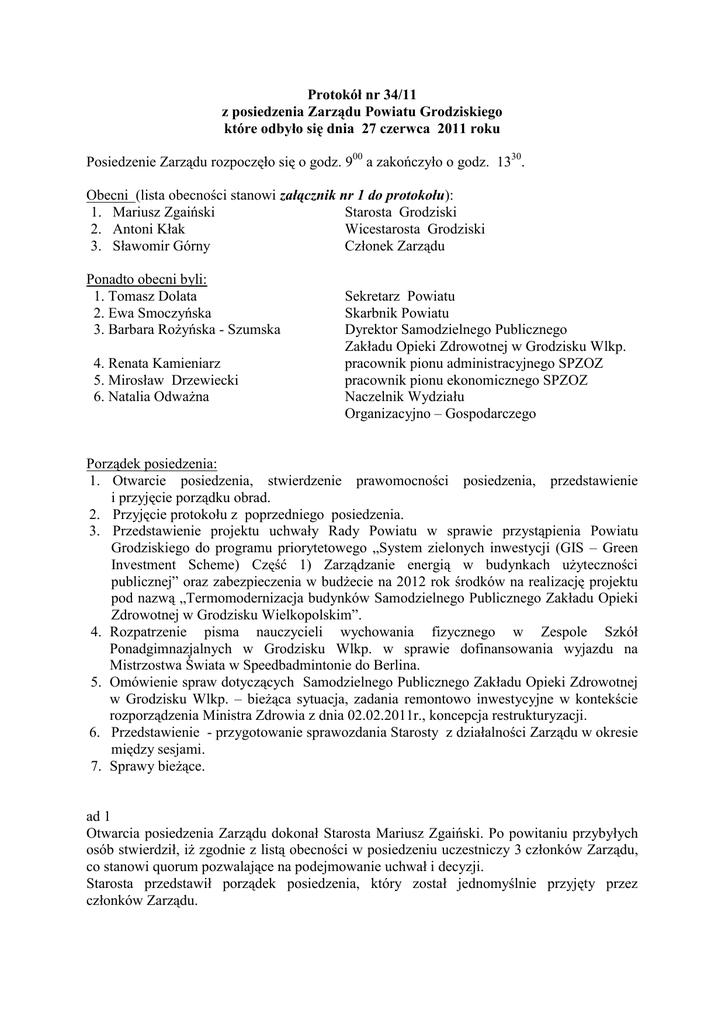 Protokół nr 34/11 z posiedzenia Zarządu Powiatu Grodziskiego które odbyło się dnia 27 czerwca 2011 roku Posiedzenie Zarządu rozpoczęło się o godz. 900 a zakończyło o godz. 1330. Obecni (lista obecności stanowi załącznik nr 1 do protokołu): 1. Mariusz Zgaiński Starosta Grodziski 2. Antoni Kłak Wicestarosta Grodziski 3. Sławomir Górny Członek Zarządu Ponadto obecni byli: 1. Tomasz Dolata 2. Ewa Smoczyńska 3. Barbara Rożyńska - Szumska 4. Renata Kamieniarz 5. Mirosław Drzewiecki 6. Natalia Odważna Sekretarz Powiatu Skarbnik Powiatu Dyrektor Samodzielnego Publicznego Zakładu Opieki Zdrowotnej w Grodzisku Wlkp. pracownik pionu administracyjnego SPZOZ pracownik pionu ekonomicznego SPZOZ Naczelnik Wydziału Organizacyjno – Gospodarczego Porządek posiedzenia: 1. Otwarcie posiedzenia, stwierdzenie prawomocności posiedzenia, przedstawienie i przyjęcie porządku obrad. 2. Przyjęcie protokołu z poprzedniego posiedzenia. 3. Przedstawienie projektu uchwały Rady Powiatu w sprawie przystąpienia Powiatu Grodziskiego do programu priorytetowego „System zielonych inwestycji (GIS – Green Investment Scheme) Część 1) Zarządzanie energią w budynkach użyteczności publicznej” oraz zabezpieczenia w budżecie na 2012 rok środków na realizację projektu pod nazwą „Termomodernizacja budynków Samodzielnego Publicznego Zakładu Opieki Zdrowotnej w Grodzisku Wielkopolskim”. 4. Rozpatrzenie pisma nauczycieli wychowania fizycznego w Zespole Szkół Ponadgimnazjalnych w Grodzisku Wlkp. w sprawie dofinansowania wyjazdu na Mistrzostwa Świata w Speedbadmintonie do Berlina. 5. Omówienie spraw dotyczących Samodzielnego Publicznego Zakładu Opieki Zdrowotnej w Grodzisku Wlkp. – bieżąca sytuacja, zadania remontowo inwestycyjne w kontekście rozporządzenia Ministra Zdrowia z dnia 02.02.2011r., koncepcja restrukturyzacji. 6. Przedstawienie - przygotowanie sprawozdania Starosty z działalności Zarządu w okresie między sesjami. 7. Sprawy bieżące. ad 1 Otwarcia posiedzenia Zarządu dokonał Starosta Mariusz Zgaiński. Po powitaniu przybyłych osób stwierdził, iż zgodnie z listą obecności w posiedzeniu uczestniczy 3 członków Zarządu, co stanowi quorum pozwalające na podejmowanie uchwał i decyzji. Starosta przedstawił porządek posiedzenia, który został jednomyślnie przyjęty przez członków Zarządu. 2 ad 2 Członkowie Zarządu przeczytali, jednogłośnie przyjęli i podpisali protokół nr 33/11 z posiedzenia w dniu 21 czerwca 2011r. Przy omawianiu punktu 3 była obecna Naczelnik Wydziału Organizacyjno – Gospodarczego Natalia Odważna. ad 3 Naczelnik Wydziału Organizacyjno – Gospodarczego przedstawiła projekt uchwały Rady Powiatu w sprawie przystąpienia Powiatu Grodziskiego do programu priorytetowego „System zielonych inwestycji (GIS – Green Investment Scheme) Część 1) Zarządzanie energią w budynkach użyteczności publicznej” oraz zabezpieczenia w budżecie na 2012 rok środków na realizację projektu pod nazwą „Termomodernizacja budynków Samodzielnego Publicznego Zakładu Opieki Zdrowotnej w Grodzisku Wielkopolskim”. Naczelnik Wydziału poinformowała, że Narodowy Fundusz Ochrony Środowiska i Gospodarki Wodnej ogłosił nabór wniosków w ramach III konkursu programu priorytetowego p.n. „System zielonych inwestycji (GIS – Green Investment Scheme) Część 1) Zarządzanie energią w budynkach użyteczności publicznej”. W Samodzielnym Publicznym Zakładzie Opieki Zdrowotnej w Grodzisku Wlkp. planowane jest wykonanie termomodernizacji budynków przy ul. Mossego 3 i 17, dlatego złożenie wniosku o dofinansowanie jest zasadne. Ze względu na sytuację finansową SPZOZ wniosek ten może złożyć tylko Powiat Grodziski. Ponadto konieczne jest zabezpieczenie środków finansowych w budżecie na rok 2012 stanowiących wkład własny. Termin złożenia wniosku upływa 21 lipca 2011r. Pytań i uwag nie było, wobec czego Starosta zarządził głosowanie. Zarząd jednogłośnie zaakceptował projekt uchwały w sprawie jw. Zarząd na sesji w dniu 28 czerwca 2011r. złoży wniosek o wprowadzenie projektu uchwały do porządku obrad. ad 4 Starosta odczytał pismo nauczycieli wychowania fizycznego w Zespole Szkół Ponadgimnazjalnych w Grodzisku Wlkp. w sprawie dofinansowania wyjazdu drużyny (dwóch nauczycieli wychowania fizycznego i jeden uczeń) na Mistrzostwa Świata w Speedbadmintonie, które odbędą się od 27 do 29 sierpnia 2011r. w Berlinie. Zarząd podejmie decyzję, po sprawdzeniu przez Starostę możliwości formalnego wsparcia wyjazdu. Przy omawianiu punktu 5 byli obecni: Dyrektor Samodzielnego Publicznego Zakładu Opieki Zdrowotnej w Grodzisku Wlkp. Barbara Rożyńska – Szumska oraz pracownicy SPZOZ z pionu administracyjnego – Renata Kamieniarz i pionu ekonomicznego Mirosław Drzewiecki. ad 5 Starosta poinformował, że tematem spotkania jest omówienie spraw dotyczących : 1) bieżącej sytuacji w zakresie działalności medycznej oraz ekonomiczno - finansowej, 2) zadań remontowo – inwestycyjnych w związku z zakończeniem audytu budowlanego w kontekście rozporządzenia Ministra Zdrowia z dnia 02.02.2011r. w sprawie wymagań, 3 jakim powinny odpowiadać pod względem fachowym i sanitarnym pomieszczenia i urządzenia, 3) koncepcja restrukturyzacji finansowej. Dyrektor SPZOZ przedstawiła pisemną informację na ww. zagadnienia. Pismo znak SPZOZ Sekr.0114/18/2011 dotyczące pkt 1 i 2 stanowi załącznik nr 2 do protokołu (jest to odpowiedź na pismo BR.0021.13.2011 z dnia 17 czerwca 2011r.). Dyrektor SPZOZ na podstawie danych finansowych za okres od 1 stycznia do 31 maja 2011r. (ogółem przychodów, kosztów rodzajowych, należności, zobowiązań) stwierdziła, że sytuacja ekonomiczno – finansowa jest dramatyczna. Wartość przychodów nie pokrywa w całości ponoszonych kosztów na zadania statutowe. Wynik finansowy netto za okres pięciu miesięcy wyniósł minus 2 340 076,07 zł. Strata pogłębi