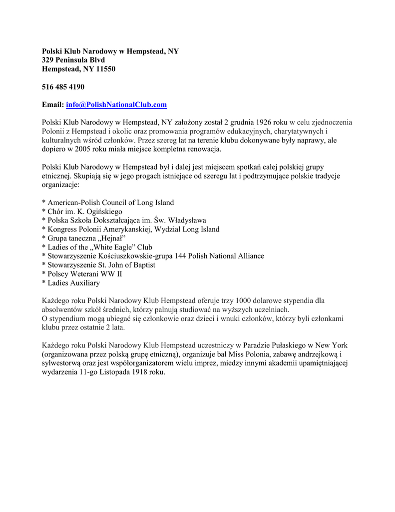 Polski Klub Narodowy w Hempstead, NY 329 Peninsula Blvd Hempstead, NY 11550 516 485 4190 Email: [email protected] Polski Klub Narodowy w Hempstead, NY założony został 2 grudnia 1926 roku w celu zjednoczenia Polonii z Hempstead i okolic oraz promowania programów edukacyjnych, charytatywnych i kulturalnych wśród członków. Przez szereg lat na terenie klubu dokonywane były naprawy, ale dopiero w 2005 roku miała miejsce kompletna renowacja. Polski Klub Narodowy w Hempstead był i dalej jest miejscem spotkań całej polskiej grupy etnicznej. Skupiają się w jego progach istniejące od szeregu lat i podtrzymujące polskie tradycje organizacje: * American-Polish Council of Long Island * Chór im. K. Ogińskiego * Polska Szkoła Dokształcająca im. Św. Władysława * Kongress Polonii Amerykanskiej, Wydzial Long Island * Grupa taneczna „Hejnał” * Ladies of the „White Eagle” Club * Stowarzyszenie Kościuszkowskie-grupa 144 Polish National Alliance * Stowarzyszenie St. John of Baptist * Polscy Weterani WW II * Ladies Auxiliary Każdego roku Polski Narodowy Klub Hempstead oferuje trzy 1000 dolarowe stypendia dla absolwentów szkół średnich, którzy palnują studiować na wyższych uczelniach. O stypendium mogą ubiegać się członkowie oraz dzieci i wnuki członków, którzy byli członkami klubu przez ostatnie 2 lata. Każdego roku Polski Narodowy Klub Hempstead uczestniczy w Paradzie Pułaskiego w New York (organizowana przez polską grupę etniczną), organizuje bal Miss Polonia, zabawę andrzejkową i sylwestorwą oraz jest współorganizatorem wielu imprez, miedzy innymi akademii upamiętniającej wydarzenia 11-go Listopada 1918 roku.