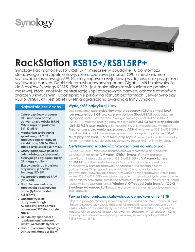 RackStation RS815+/RS815RP+ Synology RackStation RS815+/RS815RP+ mieści się w obudowie 1U do montażu stelażowego i ma zupełnie nowy, czterordzeniowy procesor CPU z mechanizmem szyfrowania sprzętowego AES-NI, który zapewnia wyjątkową wydajność oraz przyspiesza szyfrowanie danych. Dzięki czterem wbudowanym portom Gigabit LAN i skalowalności do 8 dysków Synology RS815+/RS815RP+ jest znakomitym rozwiązaniem do pamięci masowej, które umożliwia centralizację kopii zapasowych danych, ochronę zasobów o znaczeniu krytycznym i udostępnianie plików na różnych platformach. Serwer Synology RS815+/RS815RP+ jest objęty 3-letnią ograniczoną gwarancją firmy Synology. Najważniejsze cechy ●● ●● ●● ●● ●● ●● ●● ●● ●● Czterordzeniowy procesor CPU umożliwia odczyt danych z szybkością 389,03 MB/s i zapis na poziomie 361,33 MB/s Mechanizm szyfrowania sprzętowego AES-NI zapewnia odczyt danych z szybkością 388,66 MB/s i zapis z szybkością 158,9 MB/s Cztery gigabitowe gniazda LAN z obsługą przełączania awaryjnego i agregacji łączy (Link Aggregation) Skalowalność do 8 dysków przy użyciu jednostki Synology RX4152 Rozszerzalna pamięć RAM (do 6 GB) Nadmiarowe zasilacze zapewniają bezawaryjną pracę (tylko w modelu RS815RP+) Obsługa wysokiej dostępności (High Availability) oraz pamięci podręcznej SSD do odczytu i zapisu Certyfikaty zgodności z rozwiązaniami VMware®, Citrix® i Microsoft® Hyper-V® Działa z systemem Synology DiskStation Manager (DSM) Wydajność najwyższej klasy Dzięki nowemu, czterordzeniowemu procesorowi CPU, pamięci RAM rozszerzanej do 6 GB oraz czterem portom Gigabit LAN obsługującym agregację łączy i przełączanie awaryjne Synology RackStation RS815+/ RS815RP+ umożliwia obsługę danych z szybkością 389,03 MB/s przy odczycie i 361,33 MB/s przy zapisie w konfiguracji RAID 5 i w środowisku Windows®1. Mechanizm szyfrowania sprzętowego AES-NI w serwerze RS815+/RS815RP+ umożliwia także szybką transmisję szyfrowanych danych na poziomie 388,66 MB/s przy odczycie i 158,9 MB/s przy zapisie. Ze względu na te parametry jest to najwydajniejszy dotychczas stelażowy serwer NAS 1U firmy Synology. Certyfikowana zgodność z rozwiązaniami do wirtualizacji RS815+/RS815RP+ zapewnia bezproblemowe rozwiązanie do środowisk wirtualizacji, takich jak VMware®, Citrix® i Hyper-V®. Potwierdzona certyfikatami integracja serwera RS815+/RS815RP+ z VMware vSphere 5® i VAAI® umożliwia rozładowanie obciążenia związanego z niektórymi operacjami w pamięci masowej i optymalizuje wykorzystanie mocy obliczeniowej. W ten sposób zapewnia niezrównaną wydajność w środowiskach VMware. Jako scentralizowana pamięć środowiska wirtualizacji serwer RS815+/RS815RP+ umożliwia migrację maszyn wirtualnych i przenoszenie ich pomiędzy serwerami, eliminując przestoje i zakłócenia w dostarczaniu usług użytkownikom. Obsługa funkcji Windows® Offloaded Data Transfer (ODX) i Synology Advanced LUN znacznie usprawnia transfer i migrację ogromnych ilości danych. Pewna i ekonomiczna skalowalność do maksymalnie 48 TB Objętość pamięci masowej serwera Synology RS815+/RS815RP+ można szybko i łatwo rozszerzyć przy użyciu opcjonalnej jednostki rozszerzającej Synology RX415. RX415 bezpiecznie łączy się z serwerem RS815+/RS815RP+ przy użyciu kabla eSATA ze specjalnie zaprojektowanymi złączami. W ten sposób można rozszerzyć niesformatowaną pamięć masową serwera Synology RS815+/ RS815RP+ do 48 TB. Dopasowanie do środowiska biznesowego Integracja z usługą ADS w systemie Windows umożliwia szybkie i proste wdrożenie serwera Synology RS815+/RS815RP+ w istniejącym sieciowym środowisku biznesowym bez konieczności ponownego tworzenia kont użytkowników na serwerze Synology RS815+/RS815RP+. Funkcja folderu domowego użytkownika minimalizuje nakład pracy administratora potrzebny do utworzenia prywatnych folderów udostępnionych dla wielu użytkowników. Obsługa listy kontroli dostępu (ACL) systemu Windows przez serwer Rysunek 1) Niezawodność, dostępność i przywracanie działania Synology High Availability zapewnia bezproblemowe przełączanie serwerów w klastrze w przypadku awarii serwera, minimalizując jej wpływ na działalność firmy. RS815+/RS815RP+ zapewnia o wiele bardziej precyzyjną kontrolę dostępu oraz skuteczne ustawienia uprawnień, dzięki czemu personel IT może ustawiać uprawnienia do plików i folderów na RS815+/RS815RP+ przy użyciu znanego interfejsu użytkownika Windows. Uprawnienia w usłudze ACL systemu Windows zostaną zastosowane do wszystkich kanałów dostępu, w tym AFP, FTP, File Station, NFS i WebDAV. Bezpieczne uprawnienia zapewniają spokój i brak zagrożenia w postaci luk. Odporny i niezawodny Serwer RS815+/RS815RP+ jest nie tylko wyjątkowo wydajny, ale i niezawodny. Cztery gigabitowe gniazda LAN zapewniają nadmiarowość w razie nieoczekiwanej awarii sprzętu, a możliwość wymiany dysków podczas działania przyczynia się do minimalizacji przestojów serwera. Nieprzerwana dostępność to cel o znaczeniu krytycznym dla wszystkich firm, ale wiele przedsiębiorstw na całym świecie jest wciąż nieprzygotowanych na katastrofę. Menedżer High Availability może zapewnić bezproblemowe przełączanie serwerów w klastrze w przypadku awarii serwera, minimalizując jej wpływ na aplikacje. W ten sposób zmniejsza ryzyko nieoczekiwanych zakłóceń i kosztownych przestojów. Łatwe rozwiązania do kopii zapasowej Rysunek 2) Wydajność najwyższej klasy Kilka portów LAN z obsługą agregacji łączy (Link Aggregation) umożliwia serwerowi RS815+/RS815RP+ działanie z najwyższą wydajnością. W celu ochrony krytycznych danych biznesowych RS815+/RS815RP+ może działać jako centralne miejsce docelowe do przechowywania kopii zapasowych, konsolidujące przy użyciu różnych opcji pofragmentowane dane bez struktury za pośrednictwem sieci. Zaawanso